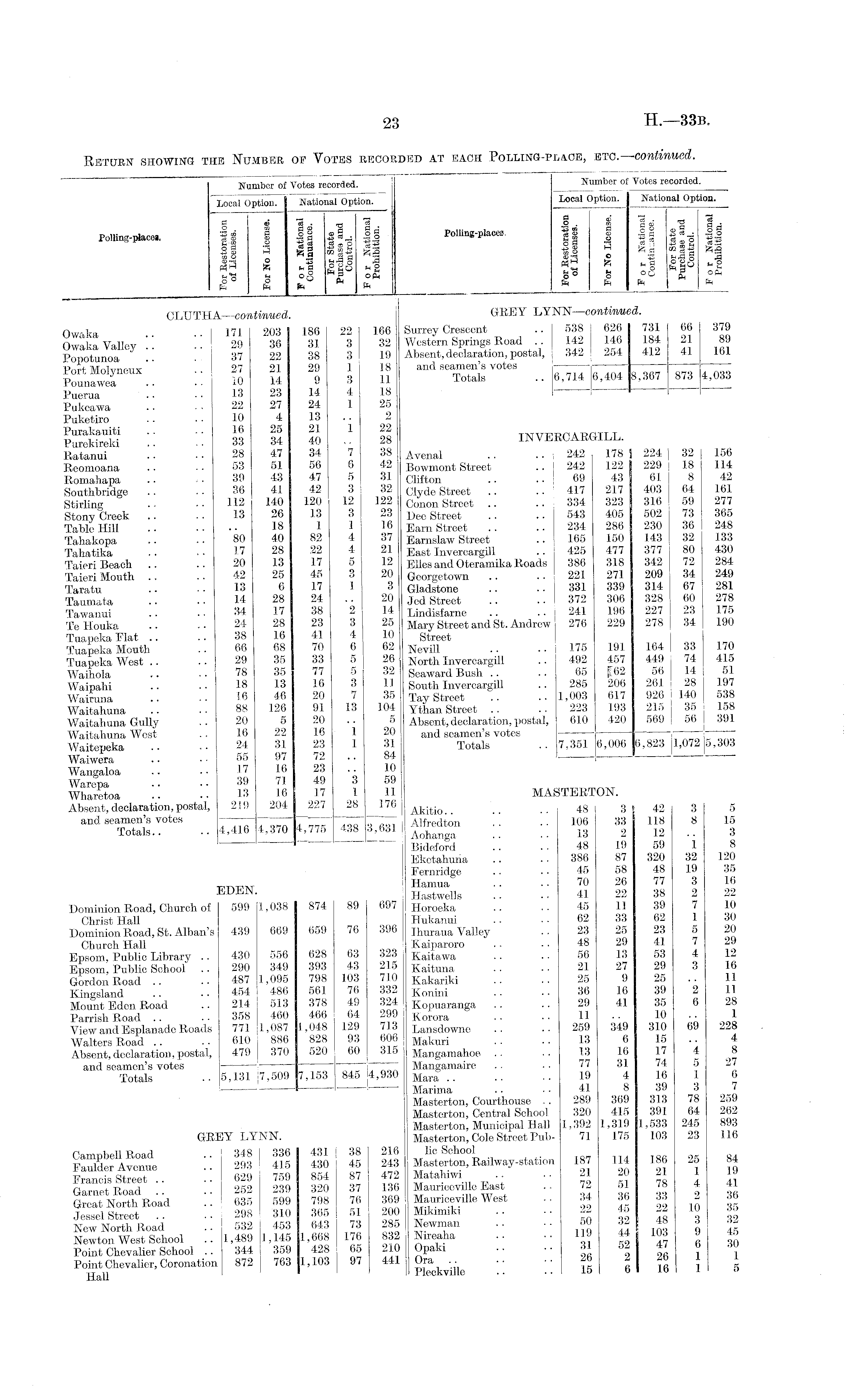 Number of Votes recorded. Local Option. National Option. I. | I» -g i d Polling-places. H § g § S - -J .2 li a II ii| li * 4 lis .1 °° i °° s PR R W j _ _ ... GREY LYNN —continued. Surrey Crescent .. 538 626 731 66 379 Western Springs Road .. 142 146 184 21 89 Absent, declaration, postal, 342 254 412 41 161 and seamen's votes Totals .. 6,714 6,404 8,367 873 4,033 - INVERCARGILL. Avenal . • •• I 242 178 1 224 I 32 156 Bowmont Street .. 242 122 229 j 18 114 Clifton .. . • 69 43 61 8 42 Clyde Street .. .. 417 217 403 64 161 Conon Street .. .. 334 323 316 59 277 Dee Street .. .. 543 405 502 73 365 Earn Street .. .. 234 286 230 36 248 Earnslaw Street .. 165 150 143 32 133 East Invercargill .. 425 477 377 80 430 Elles and Oteramika Roads 386 318 342 72 284 Georgetown .. .. 221 271 209 34 249 Gladstone . • • • 331 339 314 67 281 Jed Street .. .. 372 306 328 60 278 Lindisfarne .. . • 241 196 227 23 175 Mary Street and St. Andrew 276 229 278 34 190 Street Nevill . • • • 175 191 164 33 170 North Invercargill .. 492 457 449 74 415 Seaward Bush .. .. 65 |62 56 14 51 South Invercargill .. 285 206 261 28 197 Tay Street .. •• 1,003 617 926 140 538 Ythan Street .. .. 223 193 215 35 j 158 Absent, declaration, postal, 610 420 569 56 j 391 and seamen's votes Totals .. j7,351 6,006 6,823 1,072 o,303 MASTERTON. Akitio.. .. • • 48 3 42 3 5 Alfredton . . • • 106 33 118 8 15 Aohanga .. • • 13 2 12 3 Bideford .. 48 19 59 1 8 Eketahuria .. • • 386 87 320 32 120 Fernridge .. .. 45 58 48 19 35 Hamua .. • • 70 26 77 3 16 Hastwells .. • • 41 22 38 2 22 Horoeka .. . • 45 11 39 7 10 Hukanui .. • • 62 33 62 1 30 ' Ihuraua Valley • • 23 25 23 5 20 Kaiparoro . • • • 48 29 41 7 29 ' Kaitawa .. • • 56 13 53 4 12 ' Kaituna .. • • 21 27 29 3 16 ' Kakariki .. .. 25 9 25 ' Konini . • • • 36 16 39 2 11 Kopuaranga . . .. 29 41 35 6 28 * Korora . • • • H • • .. 1 \ Lansdowne . . . • 259 349 310 69 228 '] Makuri . • • • 13 6 15 4 } Mangamahoe . ■ • • 13 16 17 4 8 Mangamaire . . • • 77 31 74 5 27 } Mara .. .. ..19 4 16 1 6 Marima .. • • 41 8 39 3 7 Masterton, Courthouse .. 289 369 313 78 259 Masterton, Central School 320 415 391 64 262 Masterton, Municipal Hall 1,392 1,319 1,533 245 893 Masterton, Cole Street Pub- 71 175 103 23 116 } lie School J Masterton, Railway-station 187 114 186 25 84 1 Matahiwi . • • • 21 20 21 1 19 3 Mauriceville East .. 72 51 78 4 41 3 Mauriceville West . . 34 36 33 2 36 3 Mikimiki .. • • 22 45 22 10 35 5 Newman .. • • 50 32 48 3 32 2 Nireaha • • • • 119 44 103 9 45 3 Opaki .. 31 52 47 6 30 1 Ora 26 2 26 1 1 I Pleckville .. • • 15 6 16 I 1 5