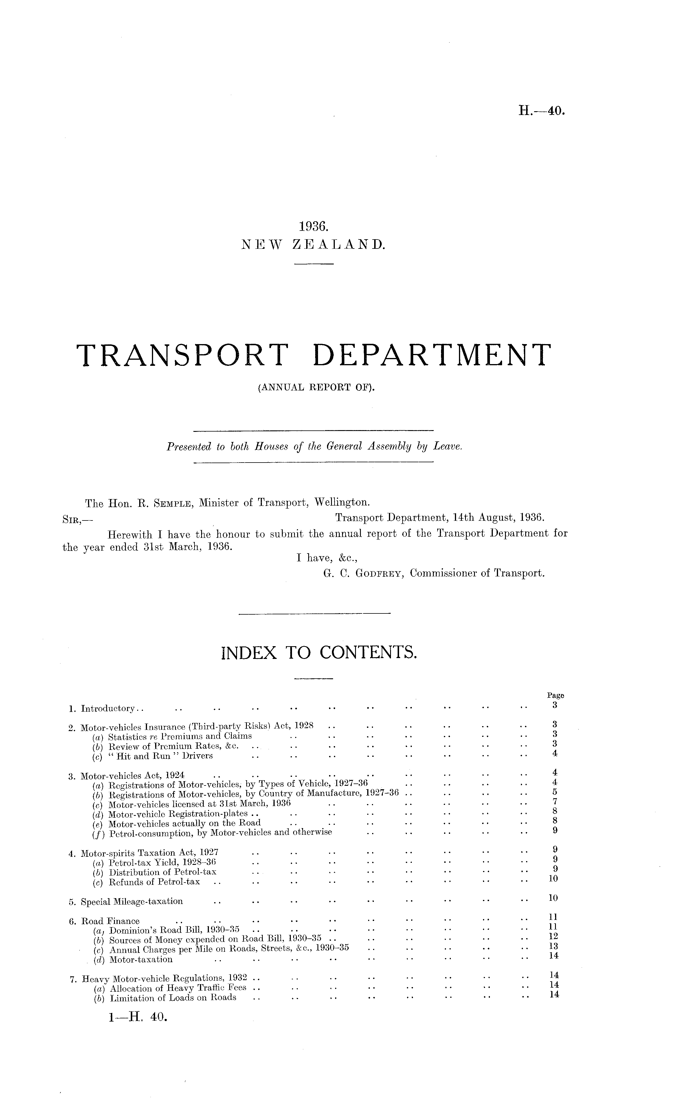 The Hon. E. Semple, Minister of Transport, Wellington. g IEj Transport Department, 14th August, 1936. Herewith I have the honour to submit the annual report of the Transport Department for the year ended 31st March, 1936. I have, &c, G. C. Godfrey, Commissioner of Transport.