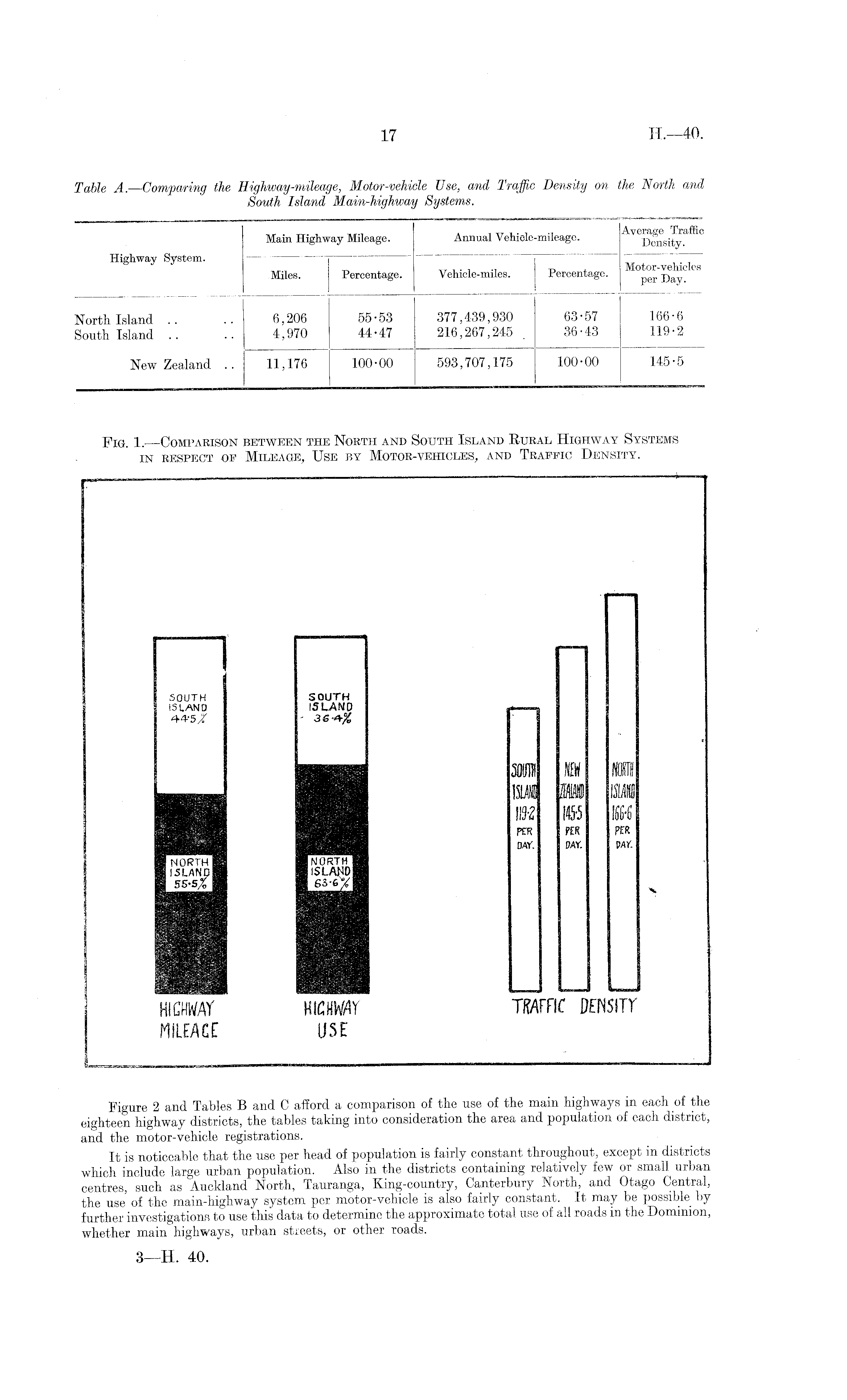 Fig. 1.-Comparison between the North and South Island Rural Highway Systems in respect of Mileage, Use by Motor-vehicles, and Traffic Density.