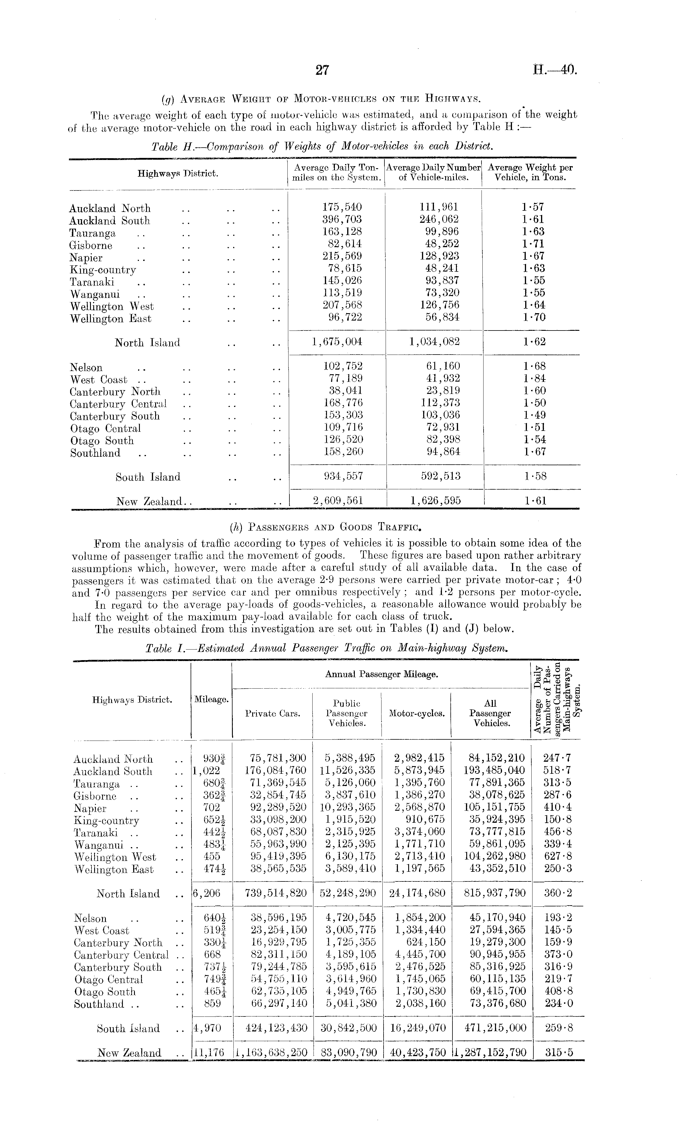 . Average Daily Ton- Average Daily Number Average Weight per Highways District. miles Qn the System o£ Vehicle-miles. Vehicle, in Tons. Auckland North .. .. .. 175,540 111,961 1-57 Auckland South .. .. .. 396,703 246,062 1-61 Tauranga .. .. .. .. 163,128 99,896 1-63 Gisborne .. .. .. 82,614 48,252 1-71 Napier .. .. .. . • 215,569 128,923 1-67 King-country .. .. .. 78,615 48,241 1-63 Taranaki ' 145,026 93,837 1-55 Wanganui 113,519 73,320 1-55 Wellington West .. .. .. 207,568 126,756 1-64 Wellington East .. .. .. 96,722 56,834 1*70 North Island .. .. 1,675,004 1,034,082 1*62 Nelson .. .. .. •• 102,752 61,160 1-68 West Coast 77,189 41,932 1-84 Canterbury North .. .. .. 38,041 23,819 1-60 Canterbury Central .. .. .. 168,776 112,373 1-50 Canterbury South .. .. .. 153,303 103,036 1*49 Otago Central .. .. .. 109,716 72,931 1*51 Otago South .. .. .. 126,520 82,398 1*54 Southland .. .. .. .. 158,260 94,864 1*67 South Island .. .. 934,557 592,513 1-58 New Zealand 2,609,561 1,626,595 1*61