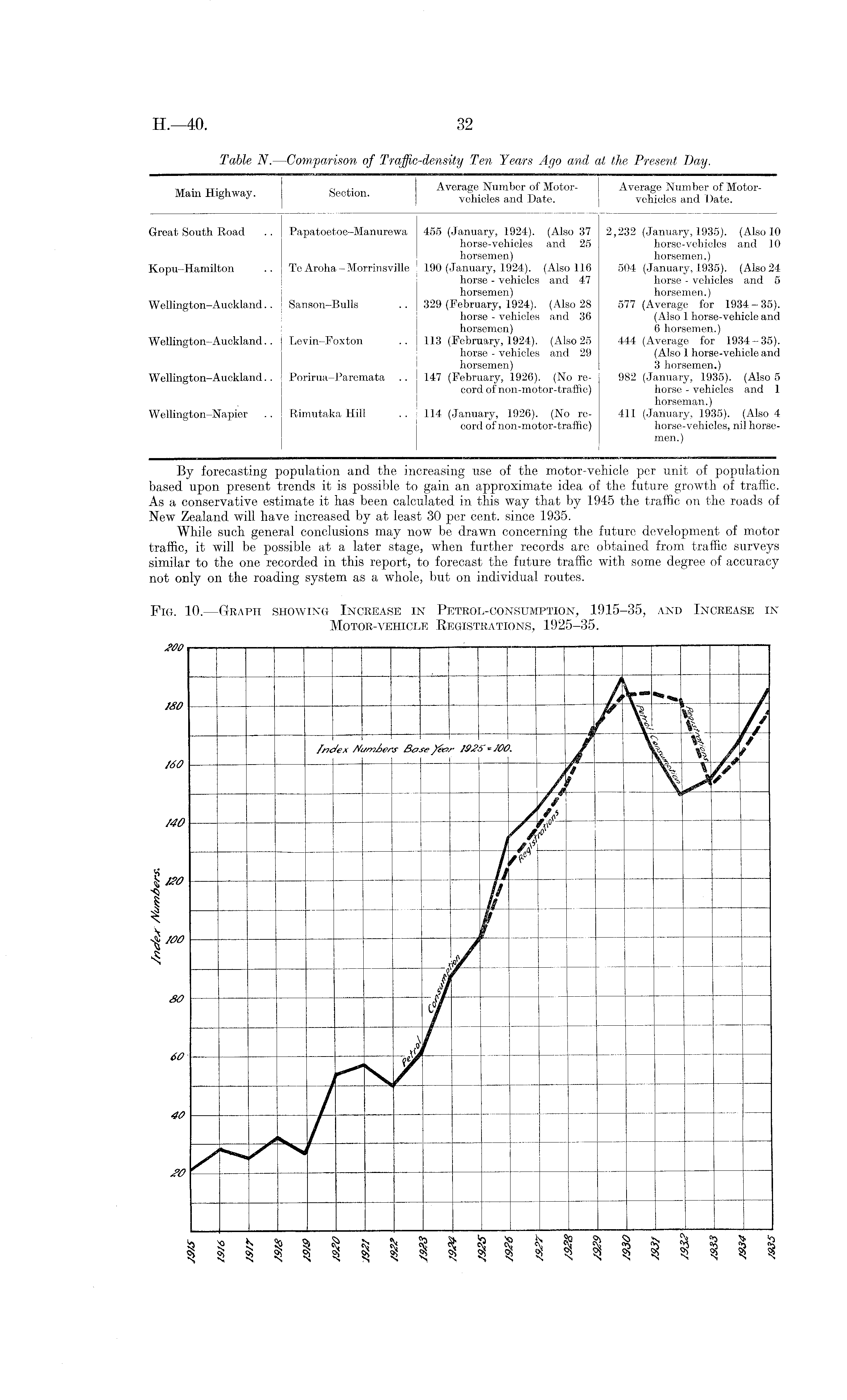 By forecasting population and the increasing use of the motor-vehicle per unit of population based upon present trends it is possible to gain an approximate idea of the future growth of traffic. As a conservative estimate it has been calculated in this way that by 1945 the traffic on the roads of New Zealand will have increased by at least 30 per cent, since 1935. While such general conclusions may now be drawn concerning the future development of motor traffic, it will be possible at a later stage, when further records are obtained from traffic surveys similar to the one recorded in this report, to forecast the future traffic with some degree of accuracy not only on the reading system as a whole, but on individual routes.