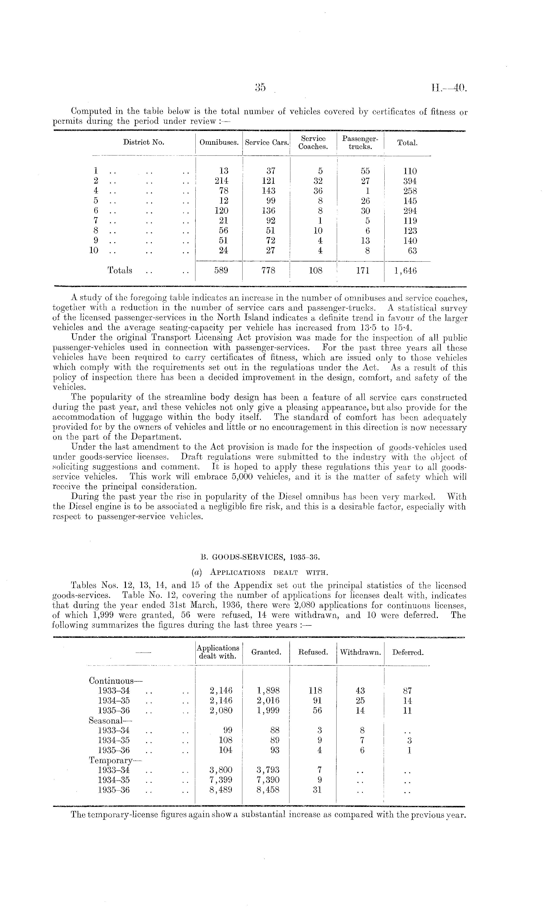 A study of the foregoing table indicates an increase in the number of omnibuses and service coaches, together with a reduction in the number of service cars and passenger-trucks. A statistical survey of the licensed passenger-services in the North Island indicates a definite trend in favour of the larger vehicles and the average seating-capacity per vehicle has increased from 13-5 to 15-4. Under the original Transport Licensing Act provision was made for the inspection of all public passenger-vehicles used in connection with passenger-services. For the past three years all these vehicles have been required to carry certificates of fitness, which are issued only to those vehicles which comply with the requirements set out in the regulations under the Act. As a result of this policy of inspection there has been a decided improvement in the design, comfort, and safety of the vehicles. The popularity of the streamline body design has been a feature of all service cars constructed during the past year, and these vehicles not only give a pleasing appearance, but also provide for the accommodation of luggage within the body itself. The standard of comfort lias been adequately provided for by the owners of vehicles and little or no encouragement in this direction is now necessary on the part of the Department. Under the last amendment to the Act provision is made for the inspection of goods-vehicles used under goods-service licenses. Draft regulations were submitted to the industry with the object of soliciting suggestions and comment. It is hoped to apply these regulations this year to all goodsservice vehicles. This work will embrace 5,000 vehicles, and it is the matter of safety which will receive the principal consideration. During the past year the rise in popularity of the Diesel omnibus has been very marked. With the Diesel engine is to be associated a negligible fire risk, and this is a desirable factor, especially with respect to passenger-service vehicles. B. GOODS-SERVICES, 1935-36. (a) Applications dealt with. Tables Eos. 12, 13, 14, and 15 of the Appendix set out the principal statistics of the licensed goods-services. Table No. 12, covering the number of applications for licenses dealt with, indicates that during the year ended 31st March, 1936, there were 2,080 applications for continuous licenses, of which 1,999 were granted, 56 were refused, 14 were withdrawn, and 10 were deferred. The following summarizes the figures during the last three years : —