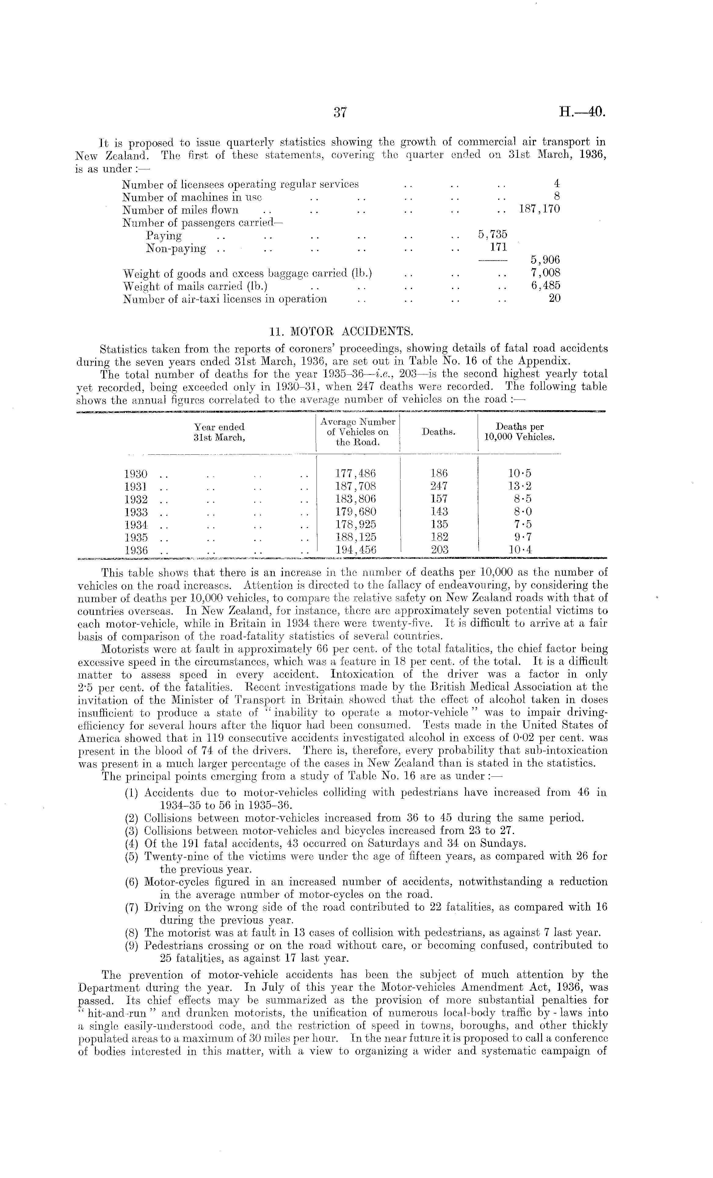 It is proposed to issue quarterly statistics showing the growth of commercial air transport in New Zealand. The first of these statements, covering the quarter ended on 31st March, 1936, is as under :— Number of licensees operating regular services . . .. .. 4 Number of machines in use .. .. .. .. . . 8 Number of miles flown . . .. .. .. . . .. 187,170 Number of passengers carried — Paying .. .. .. .. • • .. ■ 5,735 Non-paying .. .. .. .. .. • • 171 5,906 Weight of goods and excess baggage carried (lb.) .. .. .. 7,008 Weight of mails carried (lb.) .. .. .. '. . .. 6,485 Number of air-taxi licenses in operation .. .. .. .. 20 11. MOTOR ACCIDENTS. Statistics taken from the reports of coroners' proceedings, showing details of fatal road accidents during the seven years ended 31st March, 1936, are set out in Table No. 16 of the Appendix. The total number of deaths for the year 1935-36 — i.e., 203 —is the second highest yearly total yet recorded, being exceeded only in 1930-31, when 247 deaths were recorded. The following table shows the annual figures correlated to the average number of vehicles on the road : —