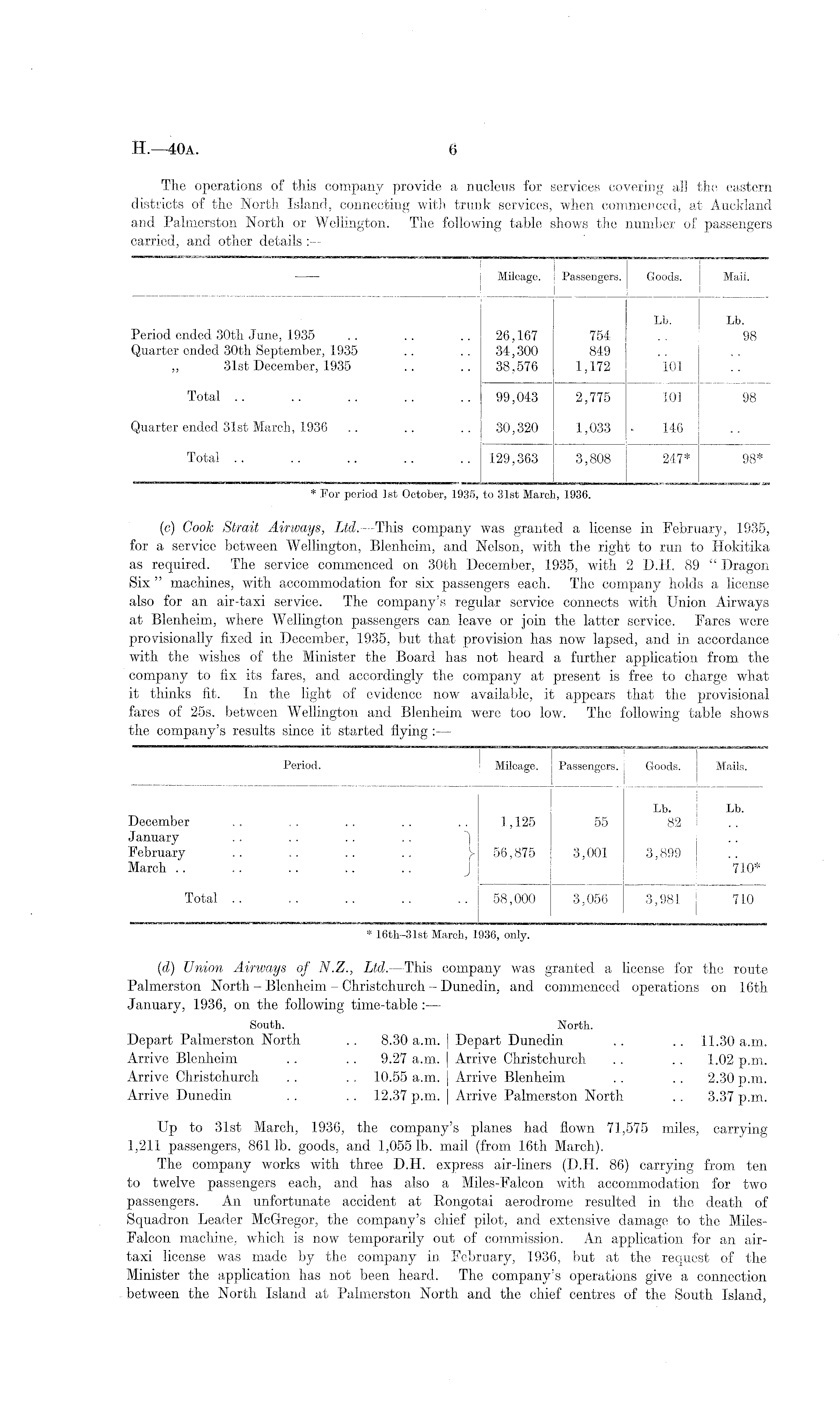 (d) Union Airways of N.Z., Ltd. —This company was granted a license for the route Palmerston North - Blenheim - Christchurch - Dunedin, and commenced operations on 16th January, 1936, on the following time-table : — South. North. Depart Palmerston North .. 8.30 a.m. | Depart Dunedin .. .. 11.30 a.m. Arrive Blenheim .. .. 9.27 a.m. j Arrive Christchurch .. .. 1.02 p.m. Arrive Christchurch .. .. 10.55 a.m. | Arrive Blenheim .. .. 2.30 p.m. Arrive Dunedin .. .. 12.37 p.m. J Arrive Palmerston North .. 3.37 p.m. Up to 31st March, 1936, the company's planes had flown 71,575 miles, carrying 1,211 passengers, 8611b. goods, and 1,0551b. mail (from 16th March). The company works with three D.H. express air-liners (D.H. 86) carrying from ten to twelve passengers each, and has also a Miles-Falcon with accommodation for two passengers. An unfortunate accident at Rongotai aerodrome resulted in the death of Squadron Leader McGregor, the company's chief pilot, and extensive damage to the MilesFalcon machine, which is now temporarily out of commission. An application for an airtaxi license was made by the company in February, 1936, but at the request of the Minister the application has not been heard. The company's operations give a connection between the North Island at Palmerston North and the chief centres of the South Island,