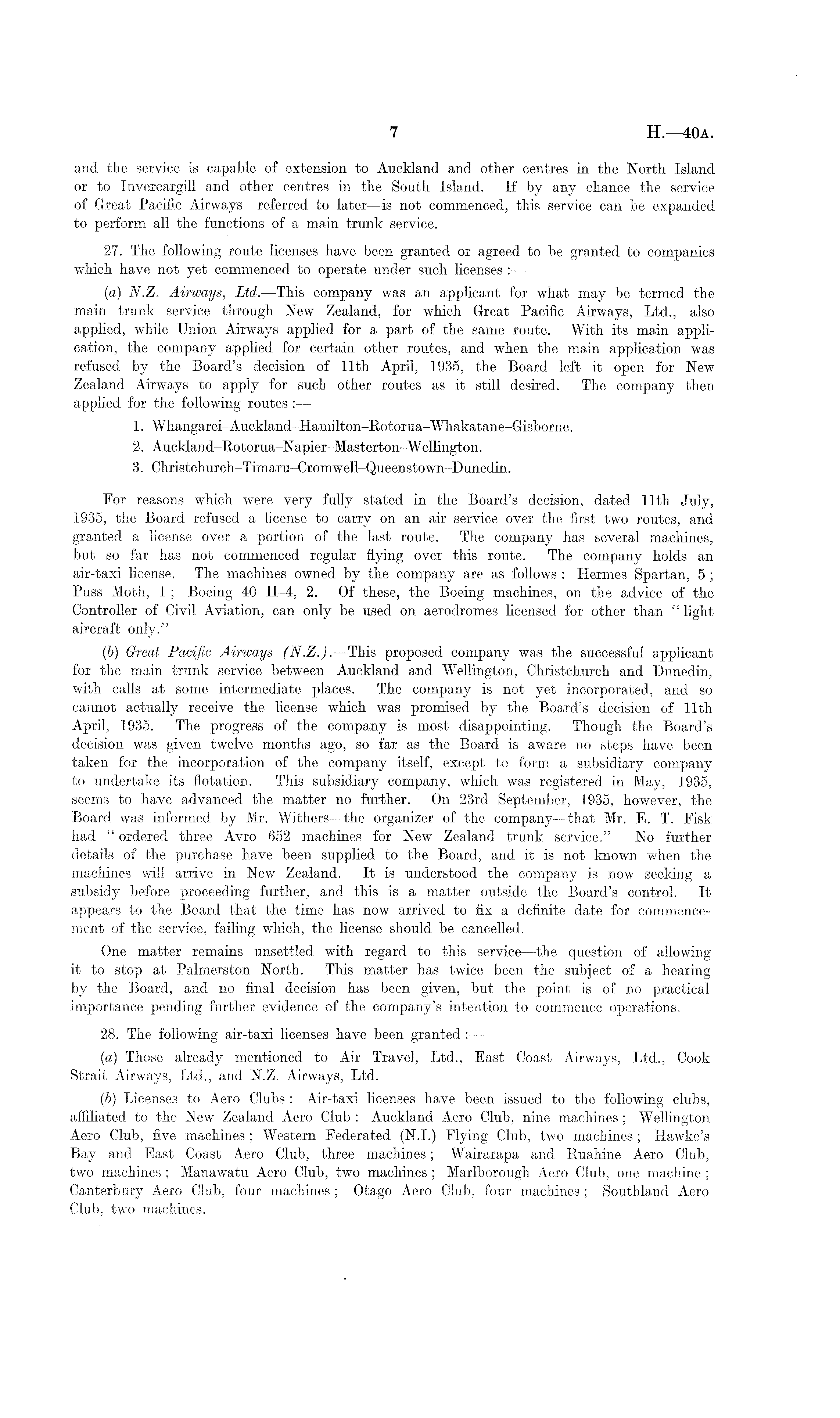 and the service is capable of extension to Auckland and other centres in the North Island or to Invercargill and other centres in the South Island. If by any chance the service of Great Pacific Airways —referred to later—is not commenced, this service can be expanded to perform all the functions of a main trunk service. 27. The following route licenses have been granted or agreed to be granted to companies which have not yet commenced to operate under such licenses : — (a) N.Z. Airways, Ltd.—This company was an applicant for what may be termed the main trunk service through New Zealand, for which Great Pacific Airways, Ltd., also applied, while Union Airways applied for a part of the same route. With its main application, the company applied for certain other routes, and when the main application was refused by the Board's decision of 11th April, 1935, the Board left it open for New Zealand Airways to apply for such other routes as it still desired. The company then applied for the following routes : — 1. Whangarei-Auckland-Hamilton-Rotorua-Whakatane-Gisborne. 2. Auckland-Rotorua-Napier-Masterton-Wellington. 3. Christchurch-Timaru-Cromwell-Queenstown-Dunedin. For reasons which were very fully stated in the Board's decision, dated 11th July, 1935, the Board refused a license to carry on an air service over the first two routes, and granted a license over a portion of the last route. The company has several machines, but so far has not commenced regular flying over this route. The company holds an air-taxi license. The machines owned by the company are as follows : Hermes Spartan, 5 ; Puss Moth, 1 ; Boeing 40 H-4, 2. Of these, the Boeing machines, on the advice of the Controller of Civil Aviation, can only be used on aerodromes licensed for other than " light aircraft only." (b) Great Pacific Airways (N.Z.). —This proposed company was the successful applicant for the main trunk service between Auckland and Wellington, Christchurch and Dunedin, with calls at some intermediate places. The company is not yet incorporated, and so cannot actually receive the license which was promised by the Board's decision of 11th April, 1935. The progress of the company is most disappointing. Though the Board's decision was given twelve months ago, so far as the Board is aware no steps have been taken for the incorporation of the company itself, except to form a subsidiary company to undertake its flotation. This subsidiary company, which was registered in May, 1935, seems to have advanced the matter no further. On 23rd September, 1935, however, the Board was informed by Mr. Withers—the organizer of the company —that Mr. E. T. Fisk had " ordered three Avro 652 machines for New Zealand trunk service." No further details of the purchase have been supplied to the Board, and it is not known when the machines will arrive in New Zealand. It is understood the company is now seeking a subsidy before proceeding further, and this is a matter outside the Board's control. It appears to the Board that the time has now arrived to fix a definite date for commencement of the service, failing which, the license should be cancelled. One matter remains unsettled with regard to this service—the question of allowing it to stop at Palmerston North. This matter has twice been the subject of a hearing by the Board, and no final decision has been given, but the point is of no practical importance pending further evidence of the company's intention to commence operations. 28. The following air-taxi licenses have been granted (a) Those already mentioned to Air Travel, Ltd., East Coast Airways, Ltd., Cook Strait Airways, Ltd., and N.Z. Airways, Ltd. (b) Licenses to Aero Clubs : Air-taxi licenses have been issued to the following clubs, affiliated to the New Zealand Aero Club : Auckland Aero Club, nine machines ; Wellington Aero Club, five machines ; Western Federated (N. 1.) Flying Club, two machines ; Hawke's Bay and East Coast Aero Club, three machines; Wairarapa and Ruahine Aero Club, two machines ; Manawatu Aero Club, two machines ; Marlborough Aero Club, one machine ; Canterbury Aero Club, four machines; Otago Aero Club, four machines; Southland Aero Club, two machines.