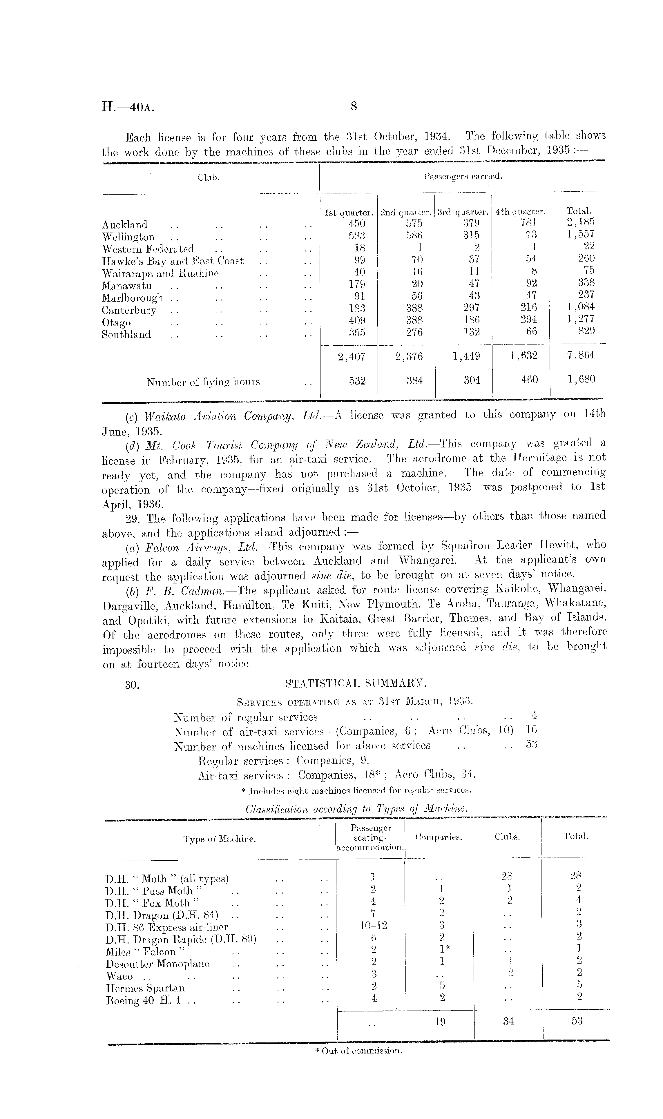 (c) Waikato Aviation Company, Ltd.—A. license was granted to this company on 14th June, 1935. (id) Ml. Cook Tourist Company of Neiv Zealand, Ltd.—This company was granted a license in February, 1935, for an air-taxi service. The aerodrome at the Hermitage is not ready yet, and the company has not purchased a machine. The date of commencing operation of the company —fixed originally as 31st October, 1935 —was postponed to Ist April, 1936. 29. The following applications have been made for licenses —by others than those named above, and the applications stand adjourned :— (a) Falcon Airways, Ltd.—This company was formed by Squadron Leader Hewitt, who applied for a daily service between Auckland and Whangarei. At the applicant's own request the application was adjourned sine die, to be brought on at seven days' notice. (b) F. B. Cadman. —The applicant asked for route license covering Kaikohe, Whangarei, Dargaville, Auckland, Hamilton, Te Kuiti, New Plymouth, Te Aroha, Tauranga, Whakatane, and Opotiki, with future extensions to Kaitaia, Great Barrier, Thames, and Bay of Islands. Of the aerodromes on these routes, only three were fully licensed, and it was therefore impossible to proceed with the application which was adjourned sine die, to be brought on at fourteen days' notice. 30. STATISTICAL SUMMARY. Services operating as at 31st March, 1936. Number of regular services .. .. .. .. 4Number of air-taxi services—(Companies, 6; Aero Clubs, 10) 16 Number of machines licensed for above services .. 53 Regular services : Companies, 9. Air-taxi services: Companies, 18*; Aero Clubs, 34.