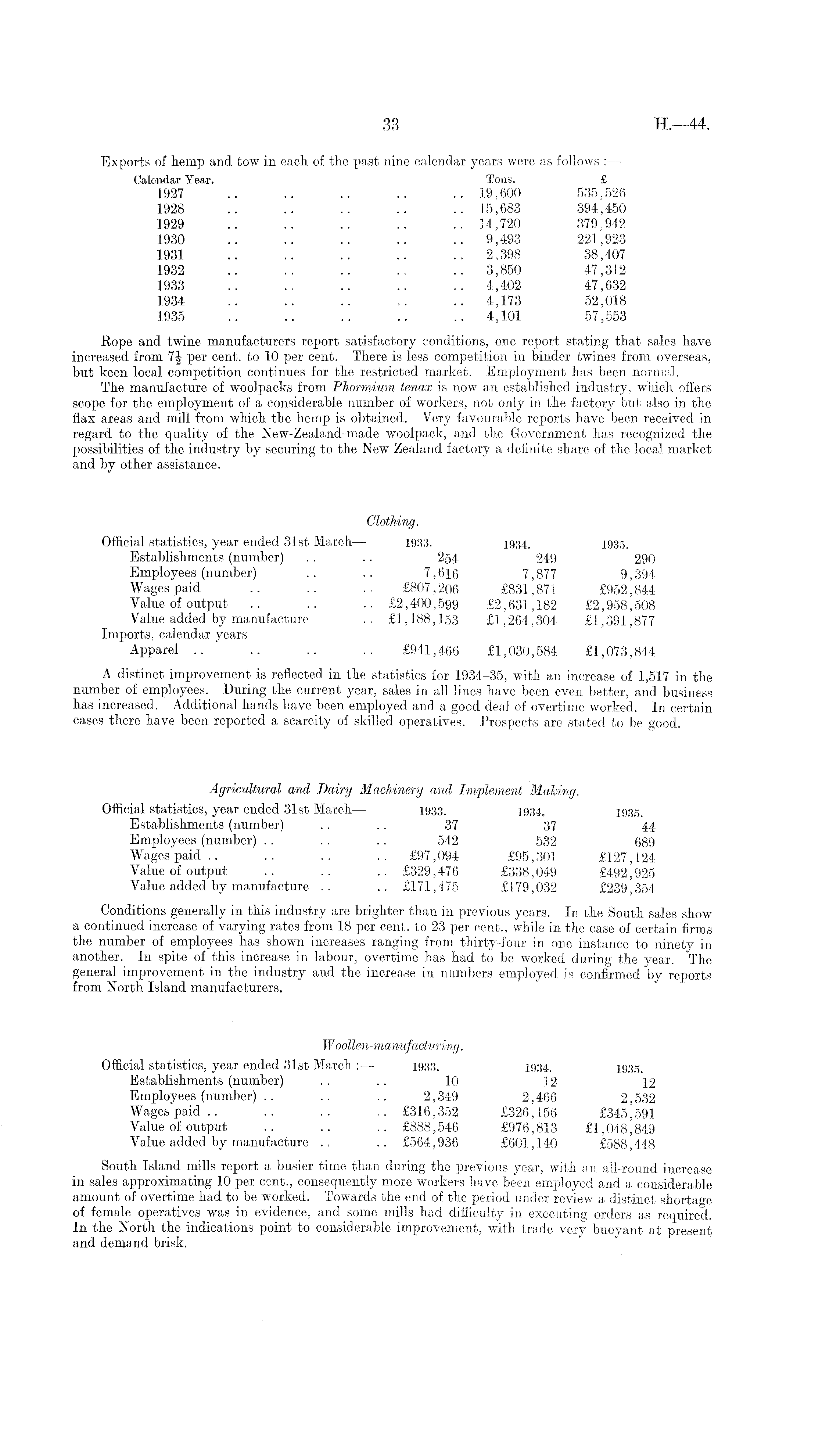 Exports of hemp and tow in each of the past nine calendar years were as follows : — Calendar Year. Tons. £ 1927 .. .. .. .. .. 19,600 535,526 1928 .. .. .. .. .. 15,683 394,450 1929 .. .. .. .. .. 14,720 379,942 1930 .. .. .. .. .. 9,493 221,923 1931 .. .. .. .. .. 2,398 38,407 1932 .. .. .. .. .. 3,850 47,312 1933 .. .. .. .. .. 4,402 47,632 1934 .. .. .. .. .. 4,173 52,018 1935 .. .. .. .. .. 4,101 57,553 Eope and twine manufacturers report satisfactory conditions, one report stating that sales have increased from 7J per cent, to 10 per cent. There is less competition in binder twines from overseas, but keen local competition continues for the restricted market. Employment has been normal. The manufacture of woolpacks from Phormium ten,ax is now an established industry, which offers scope for the employment of a considerable number of workers, not only in the factory but also in the flax areas and mill from which the hemp is obtained. Very favourable reports have been received in regard to the quality of the New-Zealand-made woolpack, and the Government has recognized the possibilities of the industry by securing to the New Zealand factory a definite share of the local market and by other assistance. Clothing. Official statistics, year ended 31st March— 1933. 1934. 1935. Establishments (number) . . .. 254 249 290 Employees (number) .. .. 7,616 7,877 9,394 Wages paid .. .. .. £807,206 £831,871 £952,844 Value of output .. .. .. £2,400,599 £2,631,182 £2,958,508 Value added by manufacture .. £1,188,153 £1,264,304 £1,391,877 Imports, calendar years — Apparel .. .. .. .. £941,466 £1,030,584 £1,073,844 A distinct improvement is reflected in the statistics for 1934-35, with an increase of 1,517 in the number of employees. During the current year, sales in all lines have been even better, and business has increased. Additional hands have been employed and a good deal of overtime worked. In certain cases there have been reported a scarcity of skilled operatives. Prospects are stated to be good. Agricultural and Dairy Machinery and Implement Malting. Official statistics, year ended 31st March— 1933. 1934.. 1935_ Establishments (number) .... 37 37 44 Employees (number) . . .. . . 542 532 689 Wages paid.. .. .. .. £97,094 £95,301 £127,124 Value of output .. .. .. £329,476 £338,049 £492,925 Value added by manufacture .. .. £171,475 £179,032 £239,354 Conditions generally in this industry are brighter than in previous years. In the South sales show a continued increase of varying rates from 18 per cent, to 23 per cent., while in the case of certain firms the number of employees has shown increases ranging from thirty-four in one instance to ninety in another. In spite of this increase in labour, overtime has had to be worked during the year. The general improvement in the industry and the increase in numbers employed is confirmed by reports from North Island manufacturers. Woollen-manufacturing. Official statistics, year ended 31st March : — 1933. 1934. 193 6Establishments (number) .... 10 12 12 Employees (number) .. .. ~ 2,349 2,466 2,532 Wages paid .. .. .. .. £316,352 £326,156 £345,'591 Value of output .. .. .. £888,546 £976,813 £1,048,849 Value added by manufacture .. .. £564,936 £601,140 £588,448 South Island mills report a busier time than during the previous year, with an all-round increase in sales approximating 10 per cent., consequently more workers have been employed and a considerable amount of overtime had to be worked. Towards the end of the period under review a distinct shortage of female operatives was in evidence, and some mills had difficulty in executing orders as required. In the North the indications point to considerable improvement, with trade very buoyant at present and demand brisk.