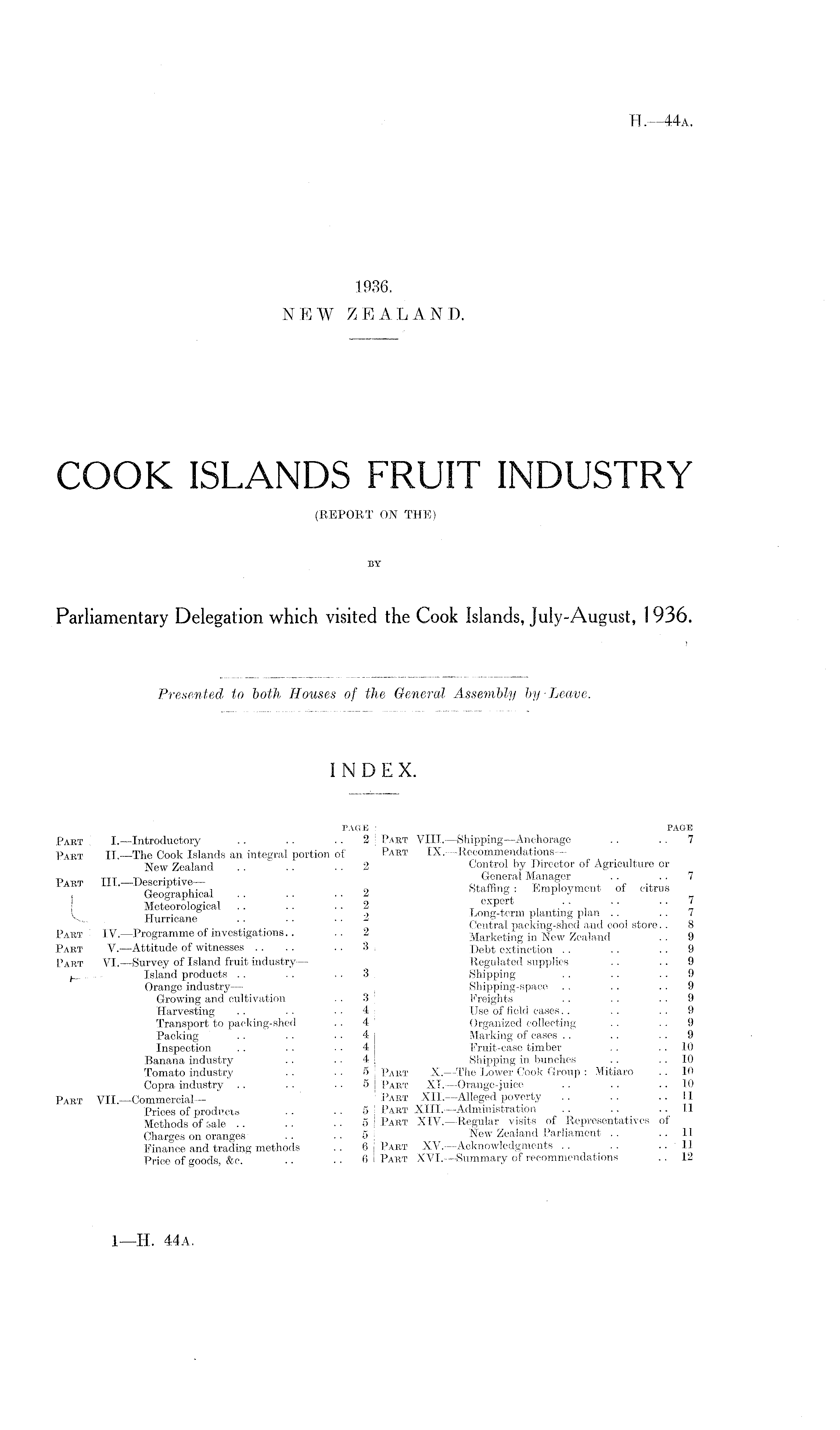 COOK ISLANDS FRUIT INDUSTRY (REPORT ON THE) BY Parliamentary Delegation which visited the Cook Islands, July-August, 1936.