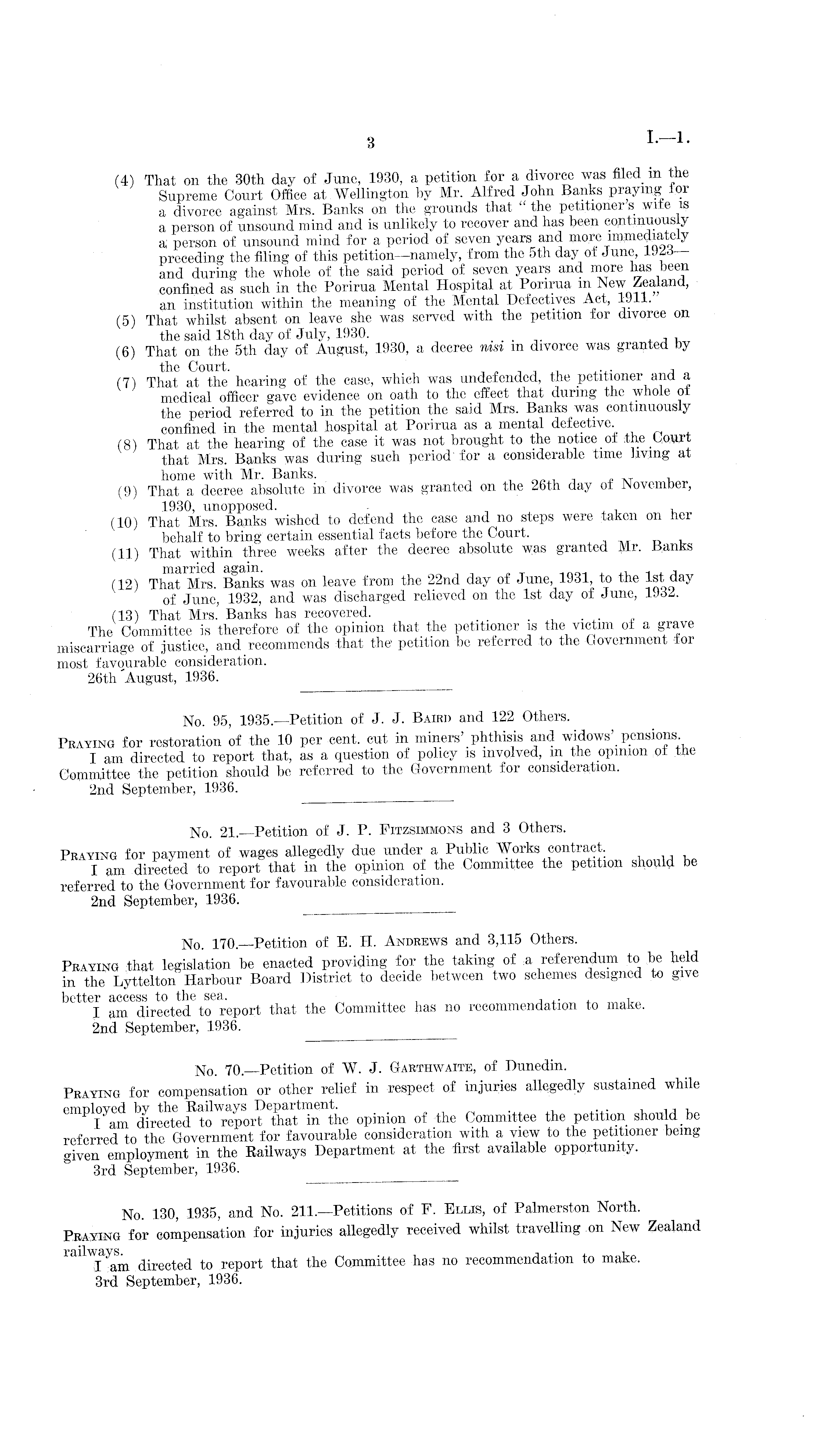 No. 130, 1935, and No. 211.—Petitions of F. Ellis, of Palmerston North. Erasing for compensation for injuries allegedly received whilst travelling on New Zealand report that the Committee has no recommendation to make. 3rd September, 1936.