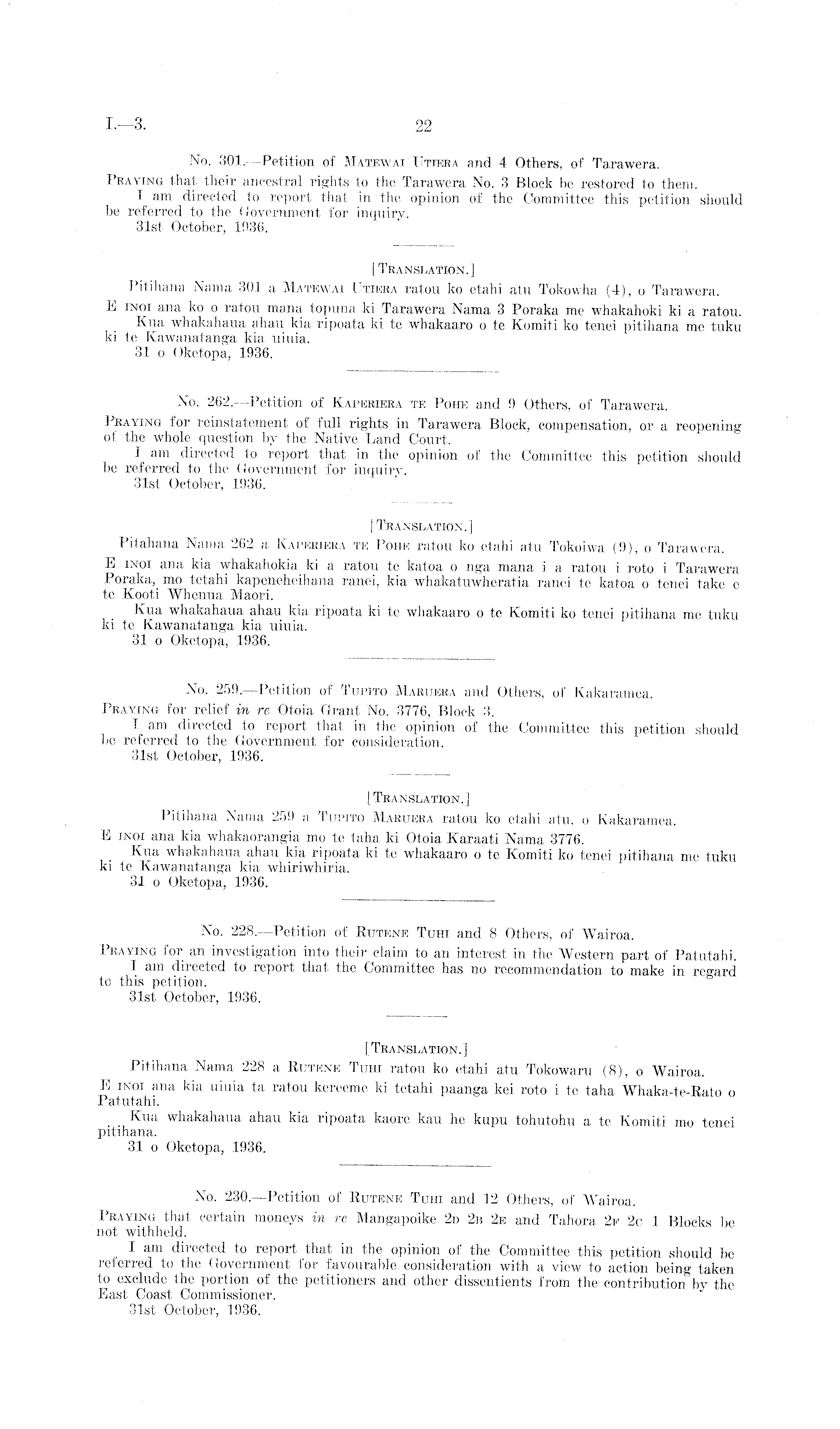 [Translation.] Pitihana Nama 259 a Tupito Maruera ratou ko etahi atu, o Kakaramea. E inoi ana kia whakaorangia mo te taha ki Otoia Karaati Nama 3776. Kua whakahaua ahau kia ripoata kite whakaaro o te Komiti ko tenei pitihana me tuku kite Kawanatanga kia whiriwhiria. 31 o Oketopa, 1936.