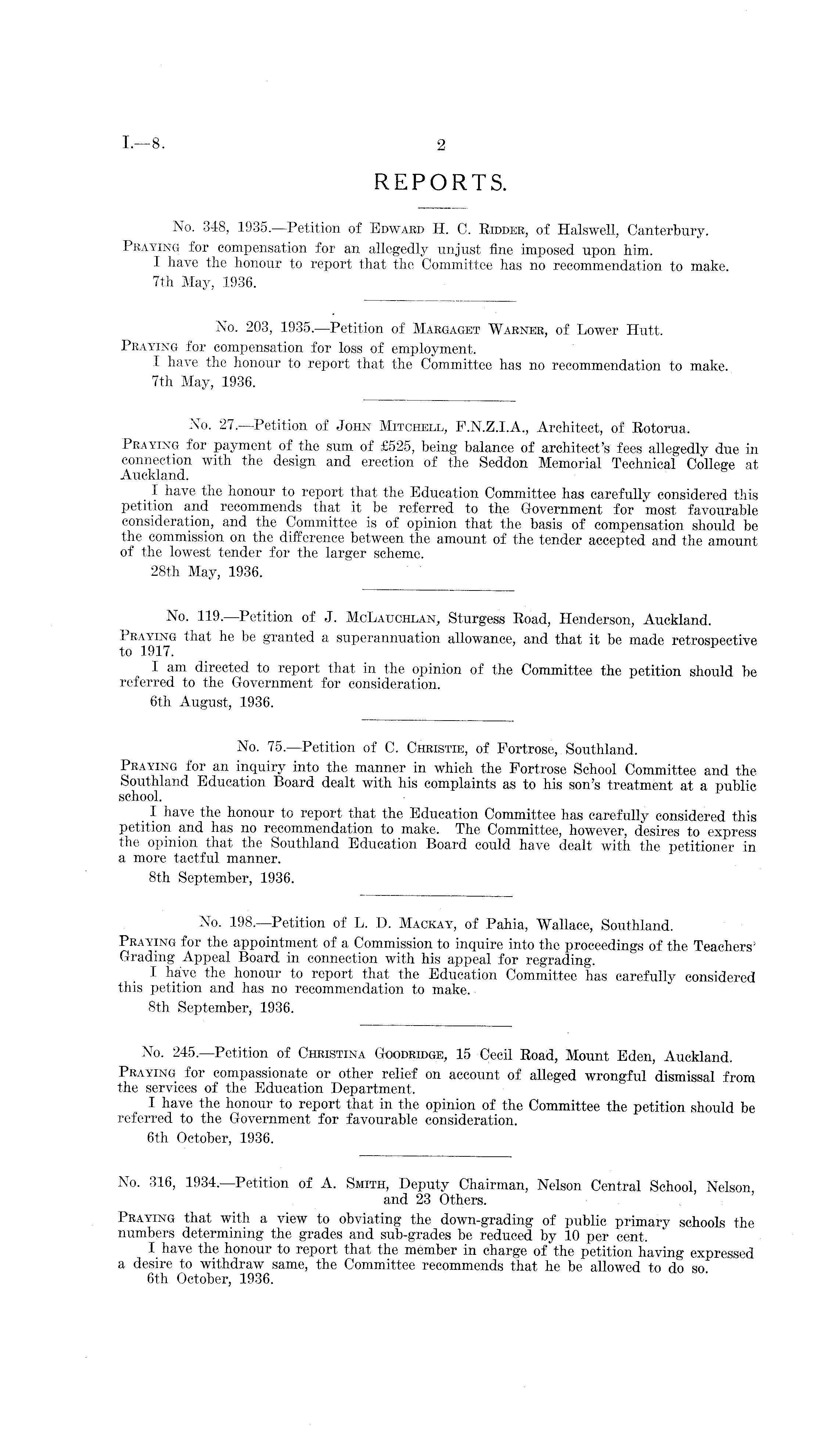 No. 348, 1935.—Petition of Edward H. C. Ridder, of Halswell, Canterbury. Praying for compensation for an allegedly unjust fine imposed upon him. I have the honour to report that the Committee has no recommendation to make. 7th May, 1936.