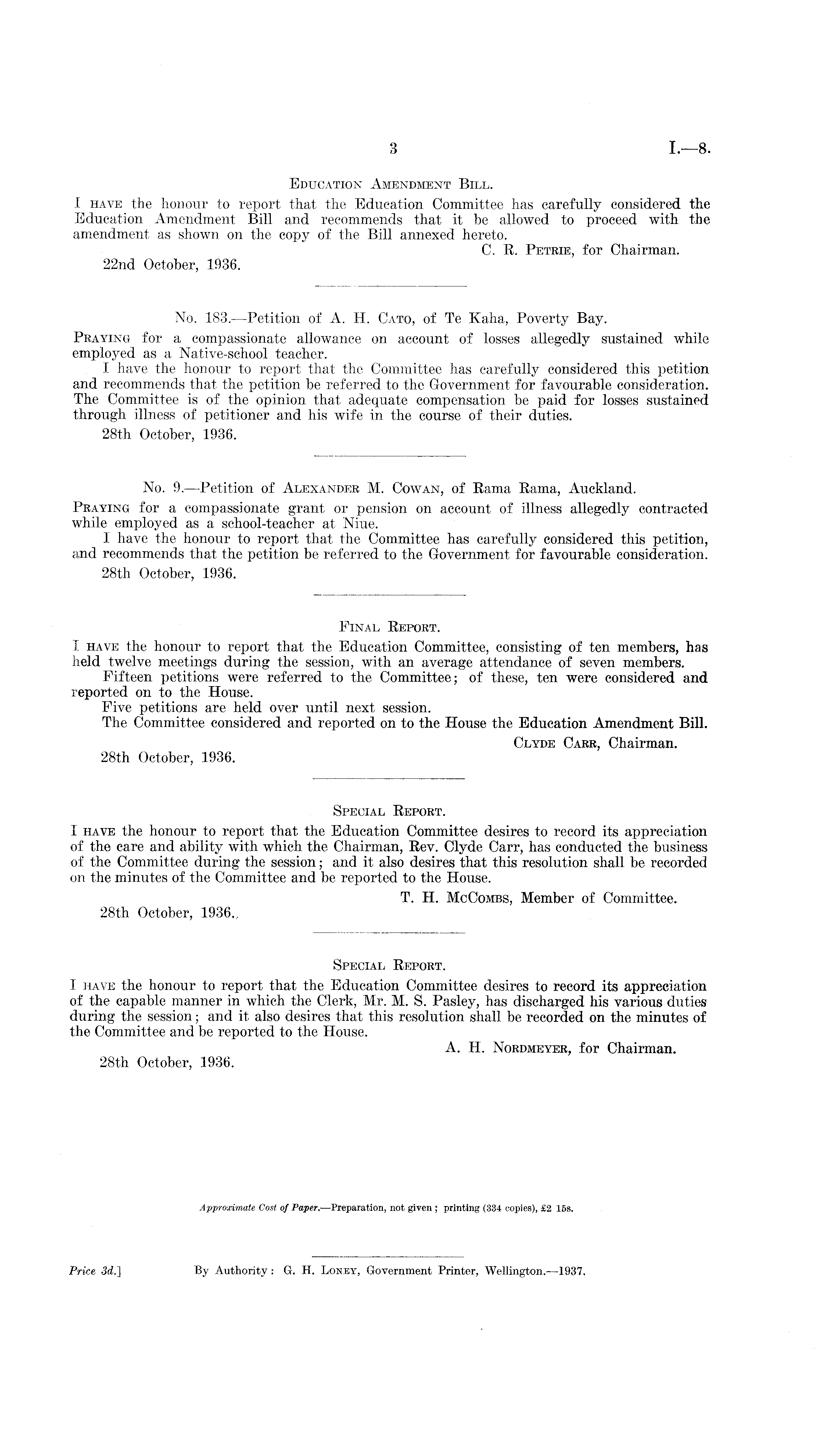 Special Report. I have the honour to report that the Education Committee desires to record its appreciation of the capable manner in which the Clerk, Mr. M. S. Pasley, has discharged his various duties during the session; and it also desires that this resolution shall be recorded on the minutes of the Committee and be reported to the House. A. H. Nordmeyer, for Chairman. 28th October, 1936.