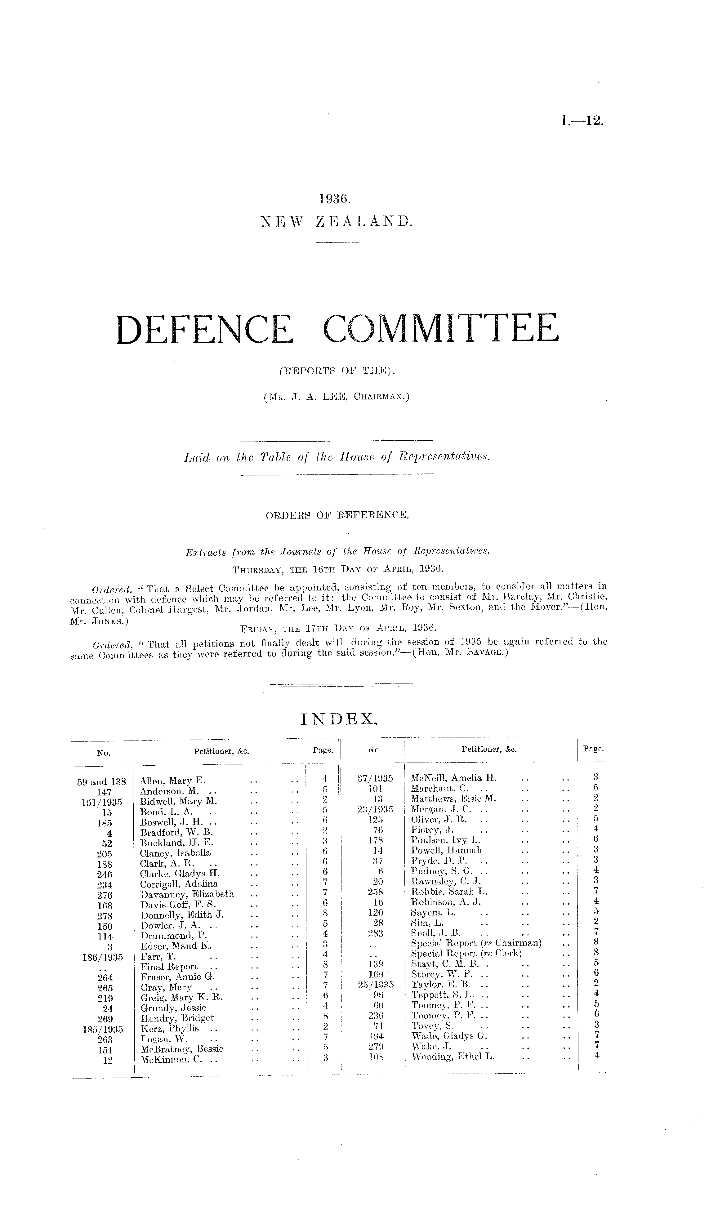 Extracts from the Journals of the Bouse of Representatives. Thursday, the 16th Day of April, 1936. Ordered, " That a Select Committee be appointed, consisting of ten members, to consider all matters in connection with defence which may be referred to it: the Committee to consist of Mr. Barclay, Mr. Christie, Mr. Cullen, Colonel Hargest, Mr. Jordan, Mr. Lee, Mr. Lyon, Mr. Roy, Mr. Sexton, and the Mover."—(Hon. Mr. Jones.) Friday, the 17th Day op April, 1936. Ordered, " That all petitions not finally dealt with during the session of 1935 be again referred to the same Committees as they were referred to during the said session."—(Hon. Mr. Savage.)
