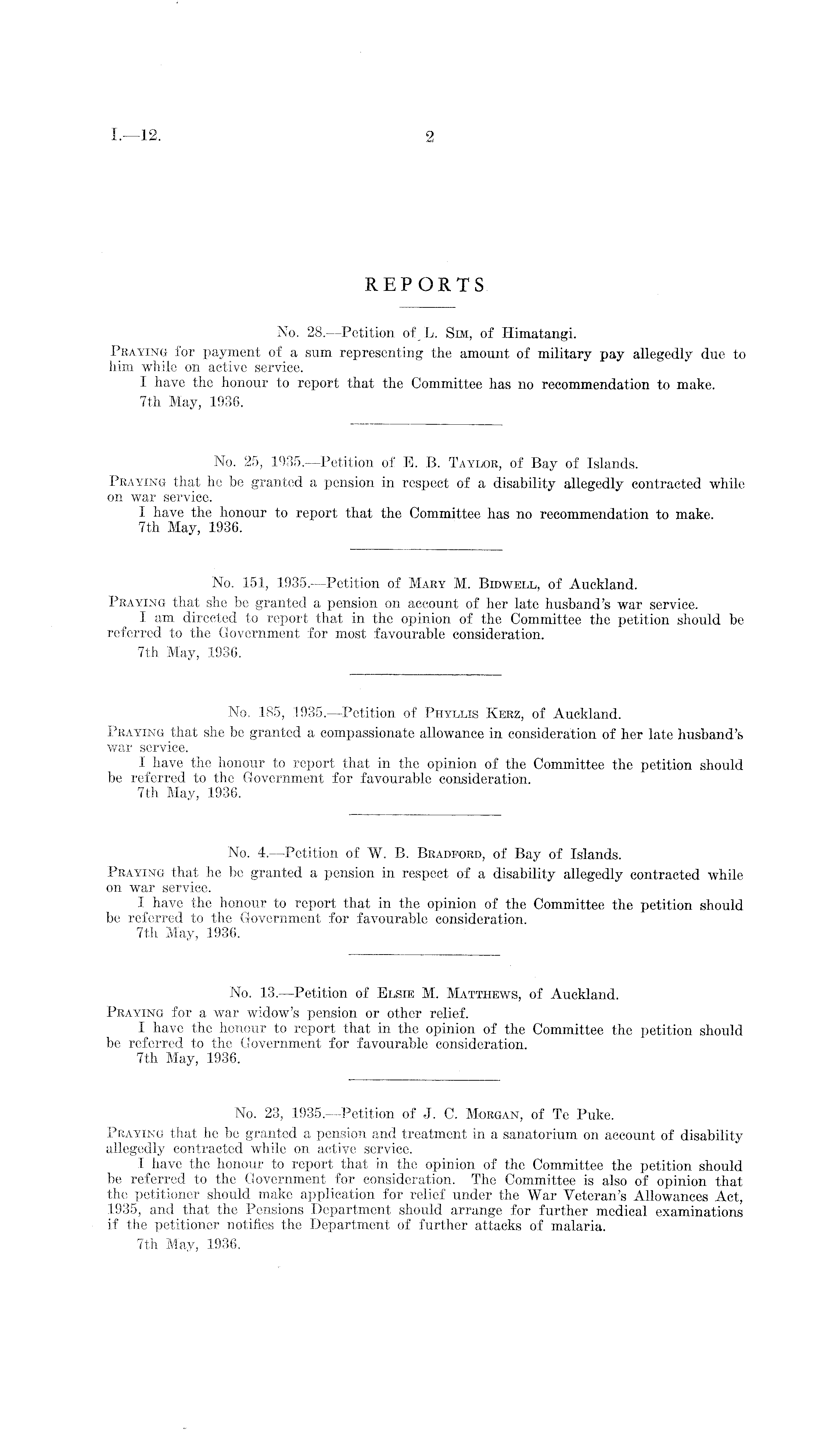 No. 4.—Petition of W. B. Bradford, of Bay of Islands. Praying that he be granted a pension in respect of a disability allegedly contracted while on war service. I have the honour to report that in the opinion of the Committee the petition should be referred to the Government for favourable consideration. 7th May, 1936.