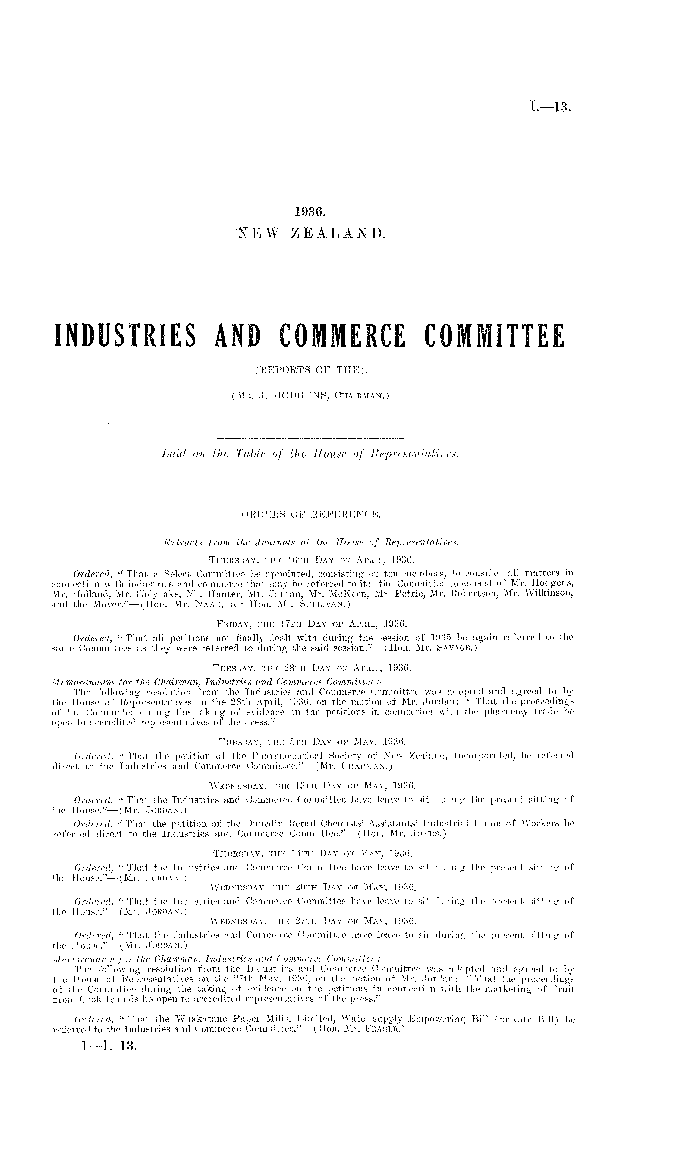 Extracts from the Journals of the House of Representatives. Thursday, the 16th Day of April, 1936. Ordered, " That a Select Committee be appointed, consisting of ten members, to consider all matters in connection with industries and commerce that may bo referred to it: the Committee to consist of Mr. Hodgens, Mr. Holland, Mr. Holyoake, Mr. Hunter, Mr. Jordan, Mr. McKeen, Mr. Petrie, Mr. Robertson, Mr. Wilkinson, and the Mover." —(Hon. Mr. Nash, for Hon. Mr. Sullivan.) Friday, the 17th Day of April, 1936. Ordered, " That all petitions not finally dealt with during the session of 1935 be again referred to the same Committees as they were referred to during the said session." —(Hon. Mr. Savage.) Tuesday, the 28th Day of April, 1936. Memorandum for the Chairman, Industries and Commerce Committee: — The following resolution from the Industries and Commerce Committee was adopted and agreed to by the House of Representatives on the 28th April, 1936, on the motion of Mr. Jordan: " That the proceedings of the Committee during the taking of evidence on the petitions in connection with the pharmacy trade be open to accredited representatives of the press." Tuesday, the sth Day of May, 1936. Ordered, " That the petition of the Pharmaceutical Society of New Zealand, Incorporated, be referred direct to the Industries and Commerce Committee." —(Mr. Chapman.) Wednesday, the 13th Day op May, 1936. Ordered, " That the Industries and Commerce Committee have leave to sit during the present sitting of the House." —(Mr. Jordan.) Ordered, " That the petition of the Dunedin Retail Chemists' Assistants' Industrial Union of Workers be referred direct to the Industries and Commerce Committee." —(Hon. Mr. Jones.) Thursday, the 14th Day of May, 1936. Ordered, " That the Industries and Commerce Committee have leave to sit during the present sitting of the House." —(Mr. Jordan.) Wednesday, the 20th Day of May, 1936. Ordered, " That the Industries and Commerce Committee have leave to sit during the present sitting of the House." —(Mr. Jordan.) Wednesday, the 27th Day of May, 1936. Ordered, " That the Industries and Commerce Committee have leave to sit during the present, sitting of the House." —(Mr. Jordan.) Memorandum for the Chairman, Industries and Commerce Committee: — The following resolution from the Industries and Commerce Committee was adopted and agreed to by the House of Representatives on the 27tli May, 1936, on the motion of Mr. Jordan: "That the proceedings of the Committee during the taking of evidence on the petitions in connection with the marketing of fruit from Cook Islands be open to accredited representatives of the press." Ordered, " That the Whakatane Paper Mills, Limited, Water-supply Empowering Bill (private Bill) be referred to the Industries and Commerce Committee." —(Hon, Mr. Eraser.) I—l. 13.