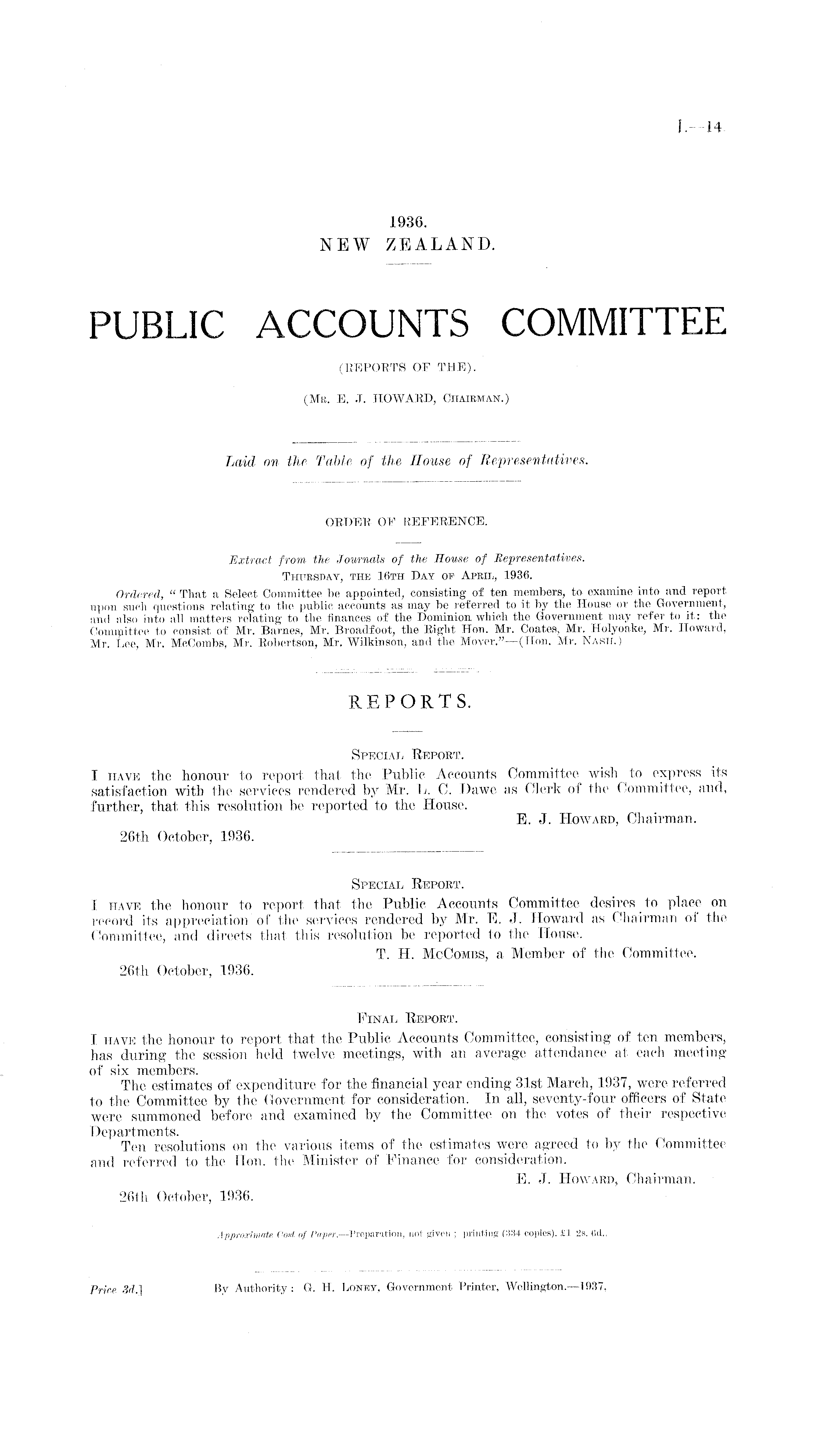 Special Report. 1 have the honour to report that the Public Accounts Committee desires to place on record its appreciation of the services rendered by Mr. E. J. Howard as Chairman of the Committee, and directs that this resolution be reported to the House. T. H. McCombs, a Member of the Committee. 26th October, 1936.