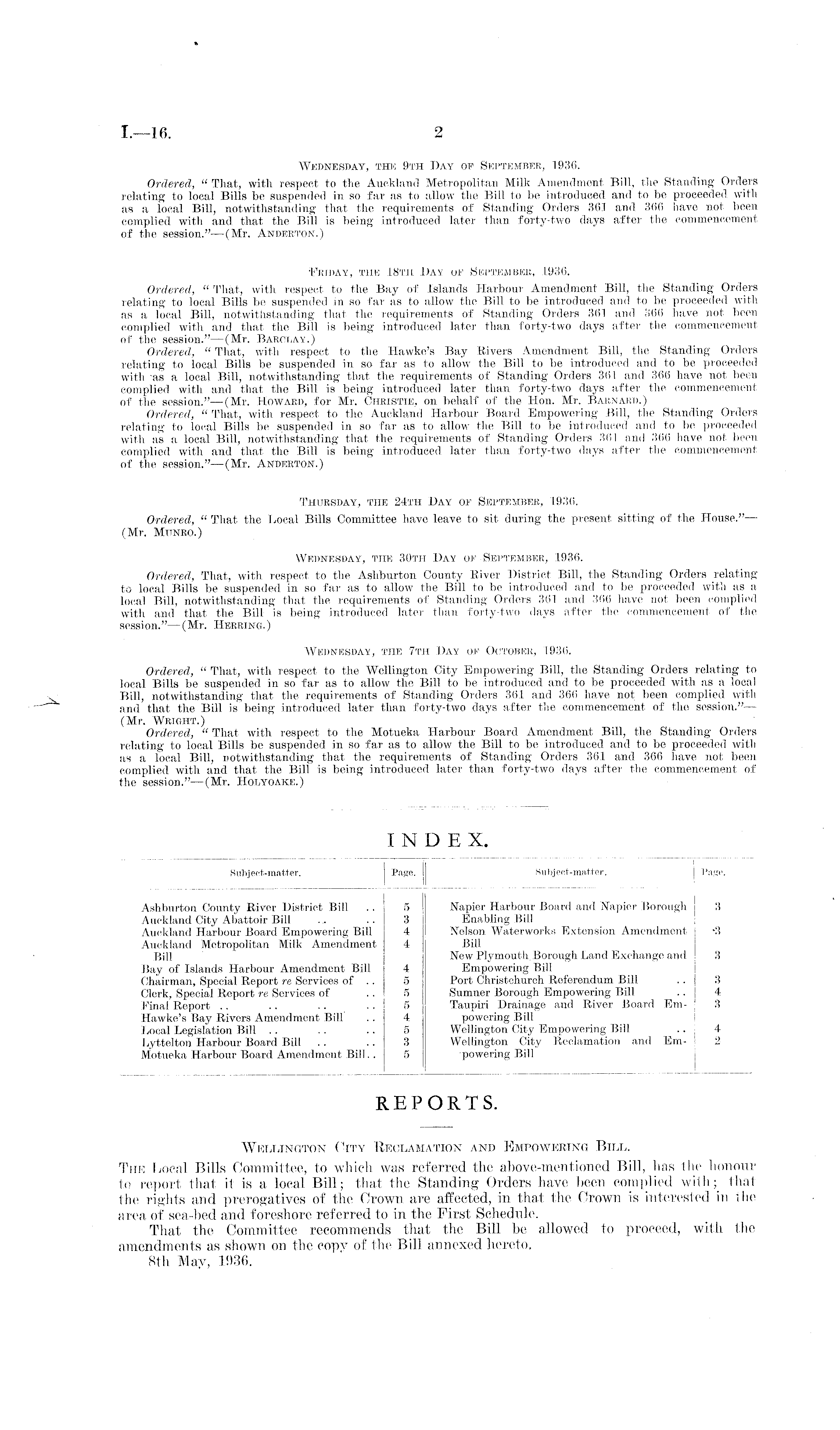 Wednesday, the 9th Day of September, 1936. Ordered, " That, with respect to the Auckland Metropolitan Milk Amendment Bill, the Standing Orders relating to local Bills be suspended in so far as to allow the Bill to be introduced and to be proceeded with as a local Bill, notwithstanding that the requirements of Standing Orders 361 and 366 have not been complied with and that the Bill is being introduced later than forty-two days after the commencement of the session." —(Mr. Anderton.) •Friday, the 18th Day of September, 1936. Ordered, " That, with respect to the Bay of Islands Harbour Amendment Bill, the Standing Orders relating to local Bills be suspended 111 so far as to allow the Bill to be introduced and to be proceeded with as a local Bill, notwithstanding that the requirements of Standing Orders 361 and 366 have not been complied with and that the Bill is being introduced later than forty-two days after the commencement of the session." —(Mr. Barclay.) Ordered, " That, with respect to the Hawke's Bay Rivers Amendment Bill, the Standing Orders relating to local Bills be suspended in so far as to allow the Bill to be introduced and to be proceeded with as a local Bill, notwithstanding that the requirements of Standing Orders 361 and 366 have not been complied with and that the Bill is being introduced later than forty-two days after the commencement of the session." —(Mr. Howard, for Mr. Christie, on behalf of the Hon. Mr. Barnard.) Ordered, " That, with respect to the Auckland Harbour Board Empowering Bill, the Standing Orders relating to local Bills be suspended in so far as to allow the Bill to be introduced and to be proceeded with as a local Bill, notwithstanding that the requirements of Standing Orders 361 and 366 have not been complied with and that the Bill is being introduced later than forty-two days after the commencement of the session." —(Mr. Anderton.) Thursday, the 24th Day of September, 1936. Ordered, " That the Local Bills Committee have leave to sit during the present sitting of the House." — (Mr. Munro.) Wednesday, the 30th Day of September, 1936. Ordered, That, with respect to the Ashburton County River District Bill, the Standing Orders relating to local Bills be suspended in so far as to allow the Bill to be introduced and to be proceeded with as a local Bill, notwithstanding that the requirements of Standing Orders 361 and 366 have not been complied with and that the Bill is being introduced later than forty-two days after the commencement of the session." —(Mr. Herring.) Wednesday, the 7th Day of October, 1936. Ordered, " That, with respect to the Wellington City Empowering Bill, the Standing Orders relating to local Bills be suspended in so far as to allow the Bill to be introduced and to be proceeded with as a local Bill, notwithstanding that the requirements of Standing Orders 361 and 366 have not been complied with and that the Bill is being introduced later than forty-two days after the commencement of the session." — (Mr. WRIGHT.) Ordered, " That with respect to the Motueka Harbour Board Amendment Bill, the Standing Orders relating to local Bills be suspended in so far as to allow the Bill to be introduced and to be proceeded with as a local Bill, notwithstanding that the requirements of Standing Orders 361 and 366 have not been complied with and that the Bill is being introduced later than forty-two days after the commencement of the session." —(Mr. Holyoake.)