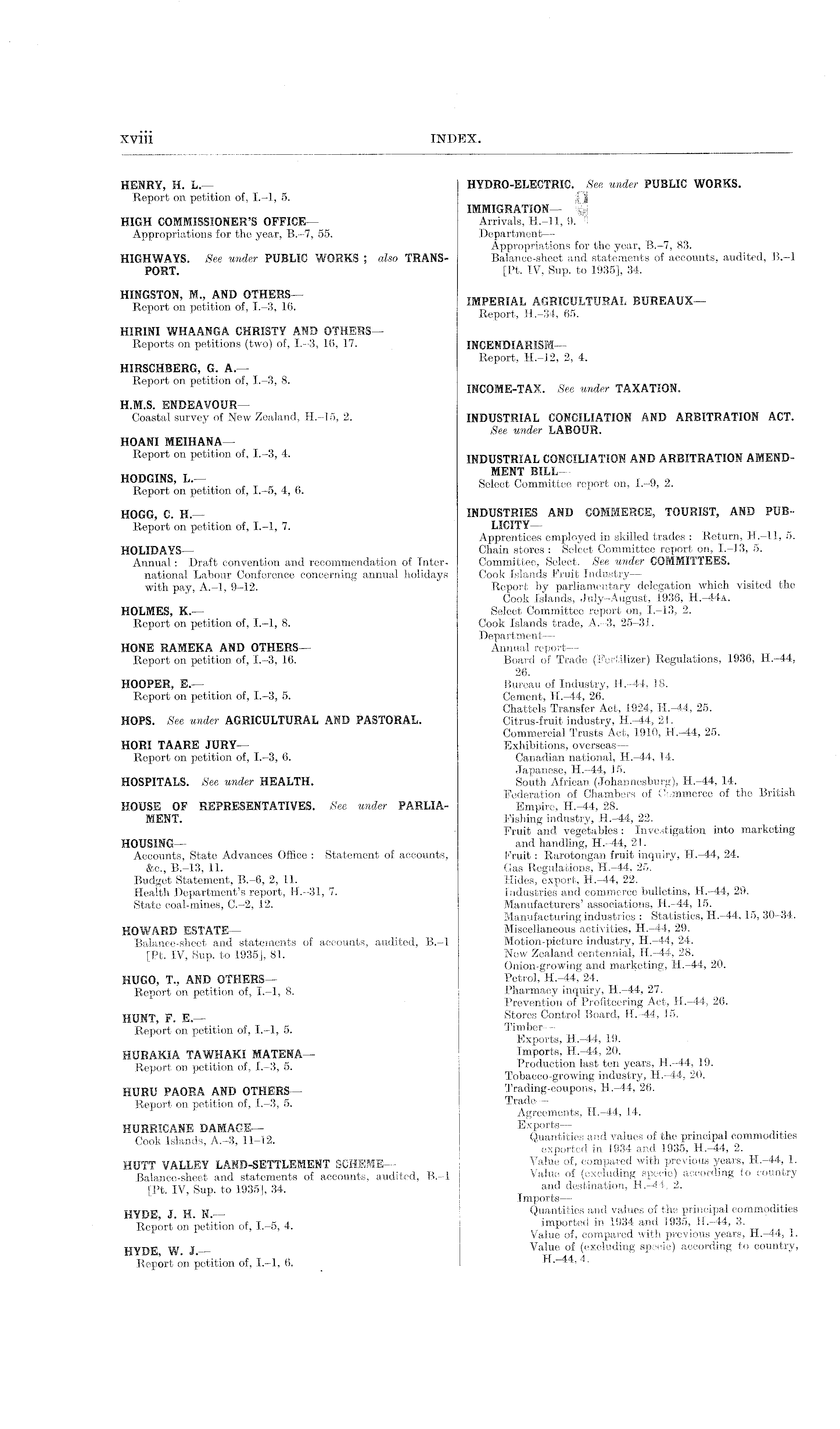 HENRY, H. L. HYDRO-EJjECTRIC. See under PUBLIC WORKS. Report on petition of, 1.-l, 5. [4 $ IMMIGRATION— !& HIGH COMMISSIONER'S OFFICE— Arrivals, H. 11. 9. 1 Appropriations for the year, 8.-7, 55. Department— Appropriations for the year, 8.-7, 83. HIGHWAYS. See under PUBLIC WORKS ; also TRANS- Balance-sheet and statements of accounts, audited, 8.-l PORT. [Pt. IV, Sup. to 1935], 34. "ESSSI IMPERIAL AGRICULTURAL BUREAUX r r Report, 11. .11. 65. HIRINI WHAANGA CHRISTY AND OTHERS— Reports on petitions (two) of. 1.-3, 16. 17. INCENDIARISM — Report. H.-12, 2, 4. HIRSCHBERG, G. A.— Report on petition of, 1.-3, 8. ... _. % , _. „. INCOME-TAX. See under TAXATION. H.M.S. ENDEAVOUR— Coastal survey of New Zealand, H.-15, 2. INDUSTRIAL CONCILIATION AND ARBITRATION ACT. See under LABOUR. HOANI MEIHANA — Report on petition of, 1.-3, 4. INDUSTRIAL CONCILIATION AND ARBITRATION AMENDHonriN s ! T MENT BILL — MUJJuiWo, • Select Committee report on, 1.-9, 2. Report on petition oi, 1.-5, 4, o. HOGG, C. H.— INDUSTRIES AND COMMERCE, TOURIST, AND PUBReport on petition of, 1.-l, 7. LICITY — Apprentices employed in skilled trades : Return, H.-11, 5. HOLIDAYS— Chain stores : Select Committee report on, 1.-13, 5. Annual: Draft convention and recommendation of Inter- Committee, Select. See under COMMITTEES. national Labour Conference concerning annual holidays Cook Islands Fruit Industry— with pay, A.-l, 9-12. Report by parliamentary delegation which visited the Cook Islands, July-August, 1936, H.-44a. HOLMES, K. — Select Committee report on, 1.-13, 2. Report on petition of, 1.-l, 8. Cook Islands trade, A.-3, 25-31. Department— HONE RAMEKA AND OTHERS— Annual reportReport on petition of, 1.-3, 16. Board of Trade (Fertilizer) Regulations, 1936, H.-44, 26. HOOPER, E.— Bureau of Industry, H.-44, 18. Report on petition of, 1.-3, 5. Cement, H.-44, 26. Chattels Transfer Act, 1924, H.-44, 25. HOPS. See under AGRICULTURAL AND PASTORAL. Citrus-fruit industry, H.—44, 21. Commercial Trusts Act, 1910, H.-44, 25. HORI TAARE JURY — Exhibitions, overseas— Report on petition of, 1.-3, 6. Canadian national, H.-44, 14. Japanese, H.-44, 15. HOSPITALS. See under HEALTH. South African (Johannesburg), H.-44, 14. Federation of Chambers of Commerce of the British HOUSE OF REPRESENTATIVES. See under PARLIA» Empire, H.-44, 28. MENT. Fishing industry, H.-44, 22. Fruit and vegetables : Investigation into marketing HOUSING — and handling, H.-44, 21. Accounts, State Advances Office : Statement of accounts, Fruit: Rarotongan fruit inquiry, H.-44, 24. &c., 8.-13, 11. Gas Regulations, H.-44, 25. Budget Statement, 8.-6, 2, 11. Hides, export, H.-44, 22. Health Department's report, H.—3l, 7. Industries and commerce bulletins, H.-44, 29. State coal-mines, C.-2, 12. Manufacturers' associations, H.-44, 15. Manufacturing industries : Statistics, H.-44, 15, 30-34. HOWARD ESTATE — Miscellaneous activities, H.-44, 29. Balance-sheet and statements of accounts, audited, 8.-l Motion-picture industry, H.-44, 24. [Pt. IV, Sup. to 1935], 81. New Zealand centennial, H.-44, 28. Onion-growing and marketing, H.-44, 20. HUGO, T., AND OTHERS— Petrol, H.-44, 24. Report on petition of, 1.-l, 8. Pharmacy inquiry, H.-44, 27. Prevention of Profiteering Act, H.—44, 26. HUNT F. E. Stores Control Board, H.-44, 15. Report on petition of, 1.-l, 5. Timber Exports, H.-44, 19. HURAKIA TAWHAK! MATENA - Imports, H.-44, 20. Report on petition of, 1.-3, 5. Production last ten years fl.-44 19. Tobacco-growing industry, H.-44, 20. HURU PAORA AND OTHERS— Trading-coupons, 11. 44. 26. Report on petition of, 1.-3, 5. Trade Agreements, H.-44, 14. HURRICANE DAMAGE— Exports— .... Cook Islands A.-3 11-12. Quantities and values of the principal commodities exported in 1934 and 1935, H.-44, 2. HUTT VALLEY LAND-SETTLEMENT SCHEME— Vallle of - compared, with previous years, H.-44, 1. Balance-sheet and statements of accounts, audited, 8.-l Value of (excluding specie) according to country [Pt. IV, Sup. to 1935], 34. and destination, 2. Imports— HYDE J H N Quantities and values of the principal commodities Report "on "petition of, 1.-5, 4. tt imported in 1934 and 1935, H .-44, 3 Value of, compared with previous years, 4L.-44, i. HYDE W J Value of (excluding specie) according to country, Report on petition of, 1.-l, 6. ! H.—44.4.