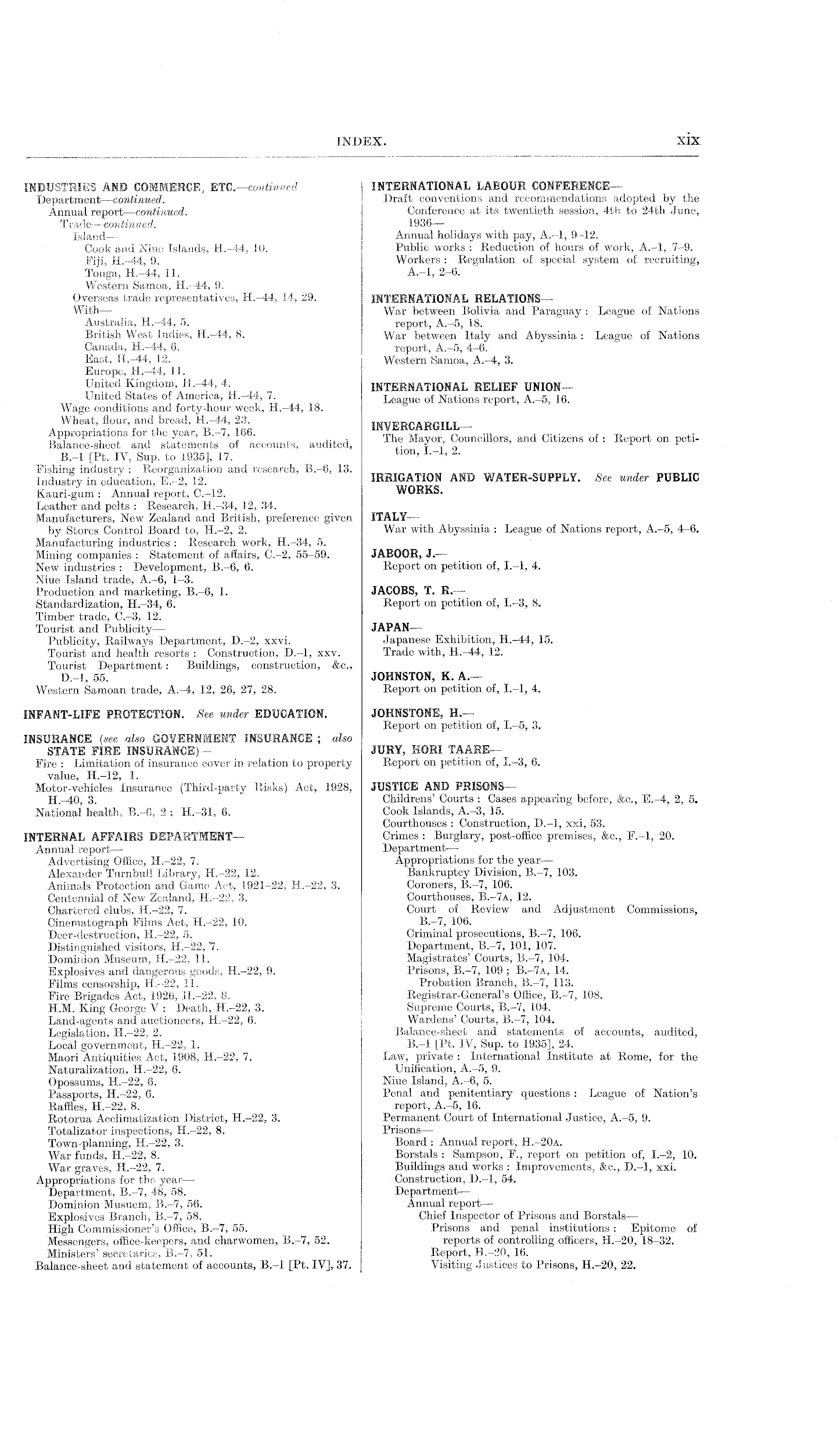 INDUSTRIES AND COMMERCE, ETC.—continued. INTERNATIONAL LABOUR CONFERENCE — Department—continued. Draft conventions and recommendations adopted by the Annual report —continued. Conference at its twentieth session, 4th to 24th June, Trade —continued. 1936— Island — Annual holidays with pay, A.-l, 9-12. Cook and Niue Islands, H.-44, 10. Public works : Reduction of hours of work, A.-l. 7-9. Fiji, H.-44, 9. Workers : Regulation of special system of recruiting, Tonga, H.-44, 11. A.-l, 2-6. Western Samoa, H.-44, 9. Overseas trade representatives, H.-44, 14, 29. INTERNATIONAL RELATIONS — With— War between Bolivia and Paraguay : League of Nations Australia, H.-44, 5. report, A.-5, 18. British West Indies, H.-44, 8. War between Italy and Abyssinia : League of Nations Canada, H.-44, 6. report, A.—s, 4-6. East, H.-44, 12. Western Samoa, A.-4, 3. Europe, M. 44, 11. United Kingdom H.-44, 4 INTERNATIONAL RELIEF UNION— United States of America, H.-44, 7. League of Nations report, A.—s, 16. Wage conditions and forty-hour week, H.-44, 18. Wheat, flour, and bread, H.-44, 23. iMVWRraHru T — Appropriations for the year, B. 7, 166. , r] . , „ , ... ■ u , , ■ t> 1 i , , J , , j .Lhe Mayor, Councillors, and Citizens of : Report on peti-Balance-sheet and statements ol accounts, audited, . . ' 1 1 8.-l [Pt. IV, Sup. to 1935], 17. Won ' *" Fishing industry : Reorganization and research, 8.-6, 13. „ „ , j n! j l)s{ rv j n education, E.—2, 12 IRRIGATION AND WATER-SUPPLY. See under PUBLIC Kauri-gum : Annual report, C.-12. WORKS. Leather and pelts : Research, H.-34, 12, 34. Manufacturers, New Zealand and British, preference given ITALY — by Stores Control Board to, H.-2, 2. War with Abyssinia : League of Nations report, A.-5, 4-6. Manufacturing industries : Research work, H.-34, 5. Mining companies : Statement of affairs, C.-2, 55-59. JABOOR, J. — New industries : Development, 8.-6, 6. Report on petition of, 1.-l, 4. Niue Island trade, A.-6, 1-3. Production and marketing, 8.-6, 1. JACOBS, T. R. — Standardization, H.-34, 6. Report on petition of, 1.-3, 8. Timber trade, C.-3, 12. Tourist and Publicity— JAPAN — Publicity, Railways Department, D.-2, xxvi. Japanese Exhibition, H.-44, 15. Tourist and health resorts : Construction, D.-l, xxv. Trade with, H.-44, 12. Tourist Department: Buildings, construction, (fee., D.-l, 55. JOHNSTON, K. A.— Western Samoan trade, A.-4, 12, 26, 27, 28. Report on petition of, 1.-l, 4. INFANT-LIFE PROTECTION. See under EDUCATION. JOHNSTONE, H.— Report on petition of, 1.-5, 3. INSURANCE (see also GOVERNMENT INSURANCE ; also STATE FIRE INSURANCE)— JURY, HORI TAARE— Fire : Limitation of insurance cover in relation to property Report on petition of, 1.-3, 6. value, H.-12, I. Motor-vehicles Insurance (Third-party Risks) Act, 1928, JUSTICE AND PRISONS— H.-40, 3. Childrens' Courts : Cases appearing before, &c., E.-4, 2, 5. National health, 8.-6, 2 ; H.-31, 6. Cook Islands, A.-3, 15. Courthouses : Construction, D.-l, xxi, 53. INTERNAL AFFAIRS DEPARTMENT — Crimes : Burglary, post-office premises, &c., F.-l, 20. Annual report— Department— Advertising Office, H.-22, 7. Appropriations for the year — Alexander Turnbull Library, H.-22, 12. Bankruptcy Division, 8.-7, 103. Animals Protection and Game Act, 1921-22, H.—22, 3. Coroners, B. --7, 106. Centennial of New Zealand, H.-22, 3. Courthouses, 8.-7 a, 12. Chartered clubs, H.-22, 7. Court of Review and Adjustment Commissions, Cinematograph Films Act, H.-22, 10. 8.-7, 106. Deer-destruction, H.-22, 5. Criminal prosecutions, 8.-7, 106. Distinguished visitors, H.-22, 7. Department, 8.-7, 101, 107. Dominion Museum, H.-22, 11. Magistrates' Courts, 8.-7, 104. Explosives and dangerous goods, H.-22, 9. Prisons, 8.-7, 109 ; 8.-7 a, 14. Films censorship, H.-22, 11. Probation Branch, 8.-7, 113. Fire Brigades Act, 1926, H.-22, 8. Registrar-General's Office, 8.-7, 108. H.M. King George V : Death, H.-22, 3. Supreme Courts, 8.-7, 104. Land-agents and auctioneers, H.-22, 6. Wardens' Courts, B. 7, 104. Legislation, H.-22, 2. Balance-sheet and statements of accounts, audited, Local government, H.-22, 1. 8.-l [Pt. IV, Sup. to 1935], 24. Maori Antiquities Act, 1908, H.-22, 7. Law, private : International Institute at Rome, for the Naturalization, H.-22, 6. Unification, A.-5, 9. Opossums, H.-22, 6. Niue Island, A.-6, 5. Passports, H.-22, 6. Penal and penitentiary questions : League of Nation's Raffles, H.-22, 8. report, A.-5, 16. Rotorua Acclimatization District, H.-22, 3. Permanent Court of International Justice, A.-5, 9. Totalizator inspections, H.-22, 8. Prisons — Town-planning, H.-22, 3. Board : Annual report, H.-20a. War funds, H.-22, 8. Borstals: Sampson, F., report on petition of, 1.-2, 10. War graves, H.-22, 7. Buildings and works : Improvements, &c., D.-l, xxi. Appropriations for the year — Construction, D.—l, 54. Department, 8.-7, 48, 58. Department— Dominion Musuem, 8.-7, 56. Annual report— Explosives Branch, 8.-7, 58. Chief Inspector of Prisons and Borstals— High Commissioner's Office, 8.-7, 55. Prisons and penal institutions : Epitome of Messengers, office-keepers, and charwomen, 8.-7, 52. reports of controlling officers, H.-20, 18-32. Ministers' secretaries, B. 7, 51. Report, H.-20, 16. Balance-sheet and statement of accounts, 8.-l [Pt. IV], 37. Visiting Justices to Prisons, H.-20, 22.