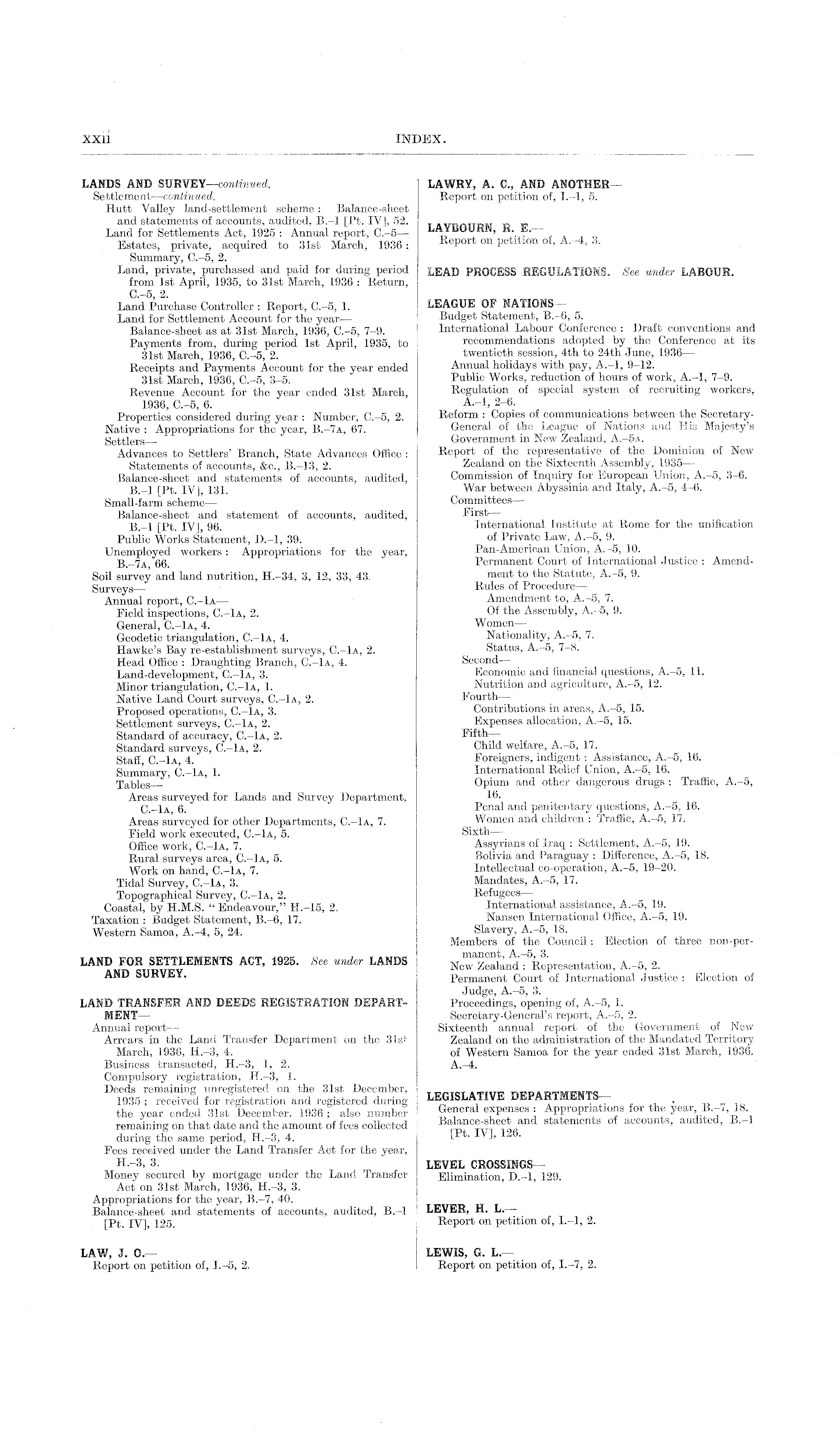 LANDS AND SURVEY —continued. LA WRY, A. C., AND ANOTHER - Settlement —continued. Report on petition of, I.—l, 5. Hutt Valley land-settlement scheme : Balance-sheet and statements of accounts, audited, 8.-l [Pt. IV], 52. _ Land for Settlements Act, 1925 : Annual report, C.-5— LAYBOUKN, K. b. . . Estates, private, acquired to 31st March, 1936 : Report on petition of, A.-4, 3. Summary, C.-5, 2. Land, private, purchased and paid for during period LEAD PROCESS REGULATIONS. See under LABOUR, from Ist April, 1935, to 31st March, 1936 : Return, C.-5, 2. Land Purchase Controller : Report, C.-5, 1. LEAGUE OF NATIONS Land for Settlement Account for the year — Budget Statement, 8.-6, 5. Balance-sheet as at 31st March, 1936, C.-5, 7-9. International Labour Conference : Draft conventions and Payments from, during period Ist April, 1935, to recommendations adopted by the Conference at its 31st March 1936 C.-5 2. twentieth session, 4th to 24th June, 1936— Receipts and Payments Account for the year ended Annual holidays with pay, A.-l, 9-12. 31st March 1936 C.-5 3-5. Public Works, reduction of hours of work, A.-l, 7-9. Revenue Account for' the year ended 31st March, Regulation of special system of recruiting workers, 1936, C.-5, 6. A.-1, 2-6. Properties considered during year : Number, C.-5, 2. Reform : Copies of communications between the SecretaryNative : Appropriations for the year, B.- 7a, 67. General of the League of Nations and Lis Majesty's Settlers Government in New Zealand, A.—sa. Advances to Settlers' Branch, State Advances Office : Report of the representative of the Dominion of New Statements of accounts, &c., 8.-13, 2. Zealand on the Sixteenth Assembly, 1935— Balance-sheet and statements of accounts, audited, Commission of Inquiry for European Union, A.-5, 3-6. [pt. IV], 131. War between Abyssinia and Italy, A.-5, 4-6. Small-farm scheme — Committees Balance-sheet and statement of accounts, audited, First 8.-l [Pt. IV], 96. International Institute at Rome for the unification Public Works Statement, D.-l, 39. of Private Law, A.-5, 9. Unemployed workers : Appropriations for the year, Pan-American Union, A.-5, 10. 8.-7 a 66. Permanent Court of International Justice : AmendSoil survey and land nutrition, H.-34, 3, 12, 33, 43. ment to the Statute, A.-5, 9. Surveys * Rules of Procedure— Annual report, C.-lA— Amendment to, A.-5, 7. Field inspections, C.-IA, 2. Of the Assembly, A.-5, 9. General, C.-IA, 4. Women— Geodetic triangulation, C.-IA, 4. Nationality, A.-5, 7. Hawke's Bay re-establishment surveys, C.-la, 2. Status, A.-5, 7-8. Head Office : Draughting Branch, C.-IA, 4. Second — Lan d -dpvplrvnment 0-1 a 'i Economic and financial questions, A.-5, 11. C.il Nutrition and agriculture, A.-5, 12. Native Land Court surveys, C.-la, 2. Fourth — Proposed operations, C.-la, 3. Contributions in areas, A.-5, 15. Settlement surveys, C.-IA, 2. Expenses allocation, A.-5, 15. Standard of accuracy, C.-la, 2. Fifth — Standard surveys, C.-IA, 2. C !llild welfare, A.-5, 17. Staff C.-Ia 4. Foreigners, indigent : Assistance, A.-5, 16. Summary, C.-IA, 1. International Relief Union, A.-5, 16. Talbles Opium and other dangerous drugs : Traffic, A.-5, Areas surveyed for Lands and Survey Department, 16-C.-1a 6. Penal and penitentary questions, A.-5, 16. Areas surveyed for other Departments, C.-IA, 7. Women and children : Traffic, A.-5, 17. Field work executed, C.-IA, 5. Sixth — Office work C.-lA 7. Assyrians of Iraq : Settlement, A.-5, 19. Rural surveys area, C.—la, 5. Bolivia and Paraguay : Difference, A.—s, 18. Work on hand C.-lA 7. Intellectual co-operation, A.-5, 19-20. Tidal Survey, C.-IA, 3. ' Mandates, A.-5, 17. Topographical Survey, C.-la, 2. Refugees Coastal, by H.M.S. " Endeavour," H.-15, 2. International assistance, A.-5, 19. Taxation : Budget Statement, 8.-6, 17. Nansen International Office, A.-5, 19. Western Samoa, A.-4, 5, 24. Slavery, A.-5, 18. Members of the Council: Election of three non-per-UN ™fI,Sv LI ™ ENTS ACT ' 1925 ' See Under LANDS NeTzeakndT Representation, A.-5, 2. AND SURVEY. Permanent Court of International Justice : Election of Judge, A.-5, 3. LAND TRANSFER AND DEEDS REGISTRATION DEPART- Proceedings, opening of, A.-5, 1. MENT — Secretary-General's report, A.-5, 2. Annual report — Sixteenth annual report of the Government of New Arrears in the Land Transfer Department on the 31st Zealand on the administration of the Mandated Territory March, 1936, H.-3, 4. of Western Samoa for the year ended 31st March, 1936. Business transacted, H.-3, 1, 2. A.-4. Compulsory registration, H.-3, 1. Deeds remaining unregistered on the 31st, December, »ttvw rafBIBTMMTt--1935; received for registration and registered during LUbISLiA. l uarAKlivmn IB , ■ the year ended 31st December, 1936 f also number general expenses: Appropriations for the year 8.-7 18 remaining on that date and the amount of fees collected statements of accounts, audited, 8.-l during the same period, H.-3, 4. [Pt- IVJ, '- >• Fees received under the Land Transfer Act for the year, H.-3, 3. LEVEL CROSSINGS Money secured by mortgage under the Land Transfer Elimination D.-l 129. Act on 31st March, 1936, H.-3, 3. Appropriations for the year, 8.-7, 40. Balance-sheet and statements of accounts, audited, 8.-l LEVER, H. L. [Pt. IV], 125. Report on petition of, 1.-l, 2. LAW, J. o.— LEWIS, G. L. _ Report on petition of, 1.-5, 2. Report on petition of, 1.-7, 2.