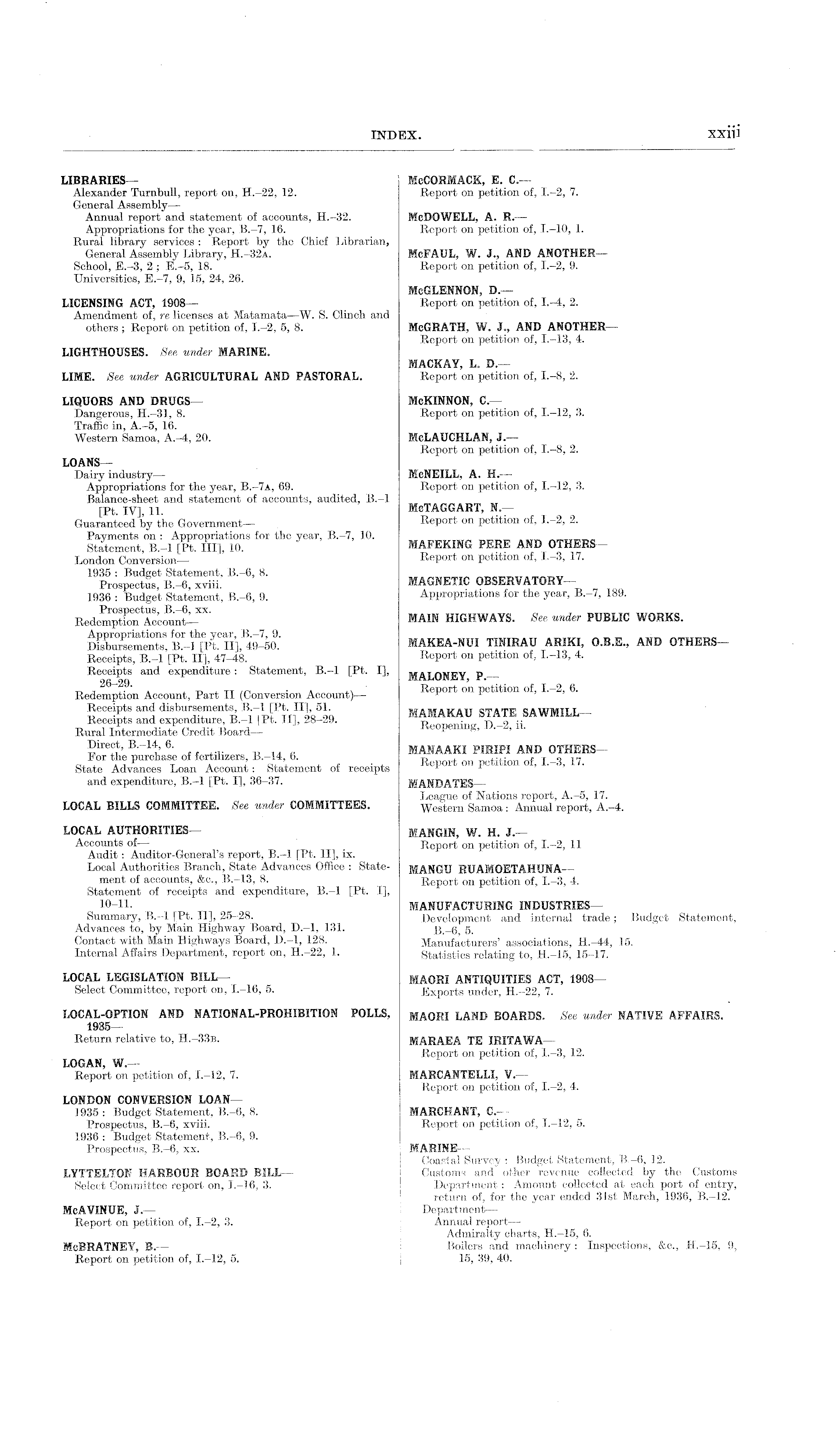LIBRARIES — McCORMACK, E. C.Alexander Turnbull, report on, H.-22, 12. Report on petition of, 1.-2, 7. General Assembly— Annual report and statement of accounts, H.-32. McDQWELL, A. R. — Appropriations for the year, 8.-7, 16. Report on petition of, 1.-10, 1. Rural library services : Report by the Chief Librarian, General Assembly Library, H.-32A. McFAUL, W. J., AND ANOTHER — School, E.-3, 2 ; E.-5, 18. Report on petition of, 1.-2, 9. Universities, E.-7, 9, 15, 24, 26. McGLENNON, D.— LICENSING ACT, 1908 — Report on petition of, 1.-4, 2. Amendment of, re licenses at Matamata—W. S. Clinch and others ; Report on petition of, 1.-2, 5, 8. MeGRATH, W. J., AND ANOTHER — Report on petition of, 1.—13, 4. LIGHTHOUSES. See under MARINE. MACKAY, L. D. LIME. See under AGRICULTURAL AND PASTORAL. Report on petition of, 1.-8, 2. LIQUORS AND DRUGS — McKINNON. C. Dangerous, H.-31, 8. Report on petition of, 1.-12, 3. Traffic in, A.-5, 16. Western Samoa, A.-4, 20. McLAUCHLAN, J. — Report on petition of, 1.-8, 2. LOANS— Dairy industry— fficNEILL, A. H. — Appropriations for the year, 8.-7 a, 69. Report on petition of, Ī.-12, 3. Balance-sheet and statement of accounts, audited, B.—l [Pt IV] 11 McTAGGART, N. — Guaranteed by the Government— Report on petition of, 1.-2, 2. Payments on : Appropriations for the year, 8.-7, 10. Statement, B. -1 [Pt. Ill], 10. ' MAFEKING PERE AND OTHERS— London Conversion— Report on petition of, 1.-3, 17. 1935 : Budget Statement, 8.-6, 8. Prospectus, 8.-6, xviii. MAGNETIC OBSERVATORY - 1936 : Budget Statement, 8.-6, 9. Appropriations for the year, 8.-7, 189. RedemptTon Accomt- X ' MAIN HIGHWAYS. See under PUBLIC WORKS. Appropriations for the year, 8.-7, 9. Disbursements, 8.-J [Pt. ll], 49-50. MAKEA-NUI TiNIRAU ARIKI, 0.8. E., AND OTHERS— Receipts, 8.-l [Pt. ll], 47-48. Report on petition of, 1.-13, 4. Receipts and expenditure : Statement, 8.-l [Pt. I], MALONEY P i . -n tt m • a i \ Report on petition of, 1.-2, 6. Redemption Account, Part 11 (Conversion Account) — 1 1 Receipts and disbursements B -1 [Pt ll] 5L MAMAKAU STATE SAWMILLReceipts and expenditure, 8.-l [Pt. ll], 28-29. T) -9 ii Rural Intermediate Credit Board — P ■ &> • > Direct 8.-14 6. MANAAKI PIRIPI AND OTHERS— For the purchase of fertoersi, 8.-14 6. Report on petition of, 1.-3, 17. State Advances Loan Account: Statement ot receipts L r and expenditure, 8.-l [Pt. I], 36-37. MANDATES League of Nations report, A.-5, 17. LOCAL BILLS COMMITTEE. See under COMMITTEES. Western Samoa: Annual report, A.-4. LOCAL AUTHORITIES— MANGIN, W. H. J — Accounts of— Report on petition of, 1.-2, 11 Audit: Auditor-General's report, 8.-l [Pt. ll], ix. Local Authorities Branch, State Advances Office : State- MANGU RUAMOETAHUNA — ment of accounts, &c., 8.-13, 8. Report on petition of, 1.-3, 4. Statement of receipts and expenditure, 8.-l [Pt. I], 10-11. MANUFACTURING INDUSTRIES— Summary, 8.-l [Pt. ll], 25-28. Development and internal trade; Budget Statement, Advances to, by Main Highway Board, D.-l, 131. g_g 5 Contact with Main Highways Board, D.-l, 128. Manufacturers' associations, H.-44, 15. Internal Affairs Department, report on, H.-22, 1. Statistics relating to, H.-15, 15-17. LOCAL LEGISLATION BILL— MAORI ANTIQUITIES ACT, 1908— Select Committee, report on, 1.-16, 5. Exports under, H.-22, 7. LOCAL-OPTION AND NATIONAL-PROHIBITION POLLS, MAORI LAND BOARDS. See under NATIVE AFFAIRS. 1935— Return relative to, H.-33b. MARAEA TE IRITAWA— Report on petition of, 1.-3, 12. LOGAN, W.— Report on petition of, 1.—12, 7. MARCANTELLI, V.— Report on petition of, 1.-2, 4. LONDON CONVERSION LOAN 1935 : Budget Statement, 8.—6, 8. MARCHANT, C.— Prospectus, 8.-6, xviii. Report on petition of, 1.—12, 5. 1936 : Budget Statement. 8.-6, 9. Prospectus, 8.-6, xx. MARINE— Coastal Survey : Budget Statement, 8.-6, 12. LYTTELTON HARBOUR BOARD BILL— Customs and other revenue collected by the Customs Select Committee report on, I. 16. 3. Department: Amount collected at each port of entry, return of, for the year ended 31st March, 1936, 8.-12. McAVINUE, J. — Department — Report on petition of, 1.-2, 3. Annual report — Admiralty charts, H.-15, 6. MeBRATNEY, B. — i Boilers and machinery: Inspections, &c., H.-15, 9, Report on petition of, 1.-12, 5, j 15, 39, 40.