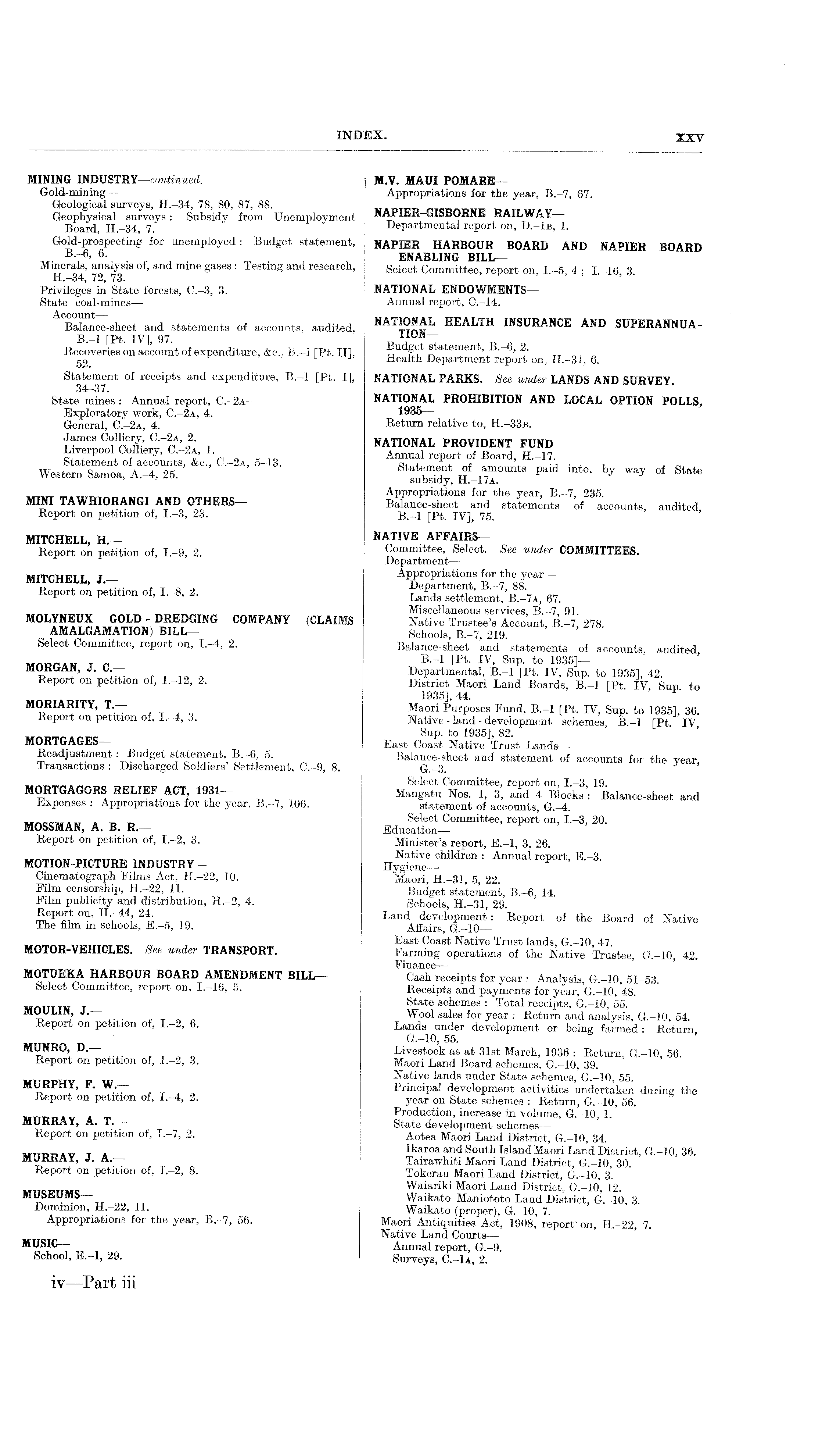 MINING INDUSTRY —continued. M.V. MAUI POMARE— Gold-mining— Appropriations for the year, 8.-7, 67. Geological surveys, H.-34, 78, 80, 87, 88. Geophysical surveys : Subsidy from Unemployment N APIER-GISBORNE RAILWAY Board H.-34 7. Departmental report on, D.-Ib, 1. Gold-prospecting for unemployed: Budget statement, NAPIER HARBOUR BOARD AND NAPIER BOARD B -~ 6 ' 6 - ENABLING BILL— Minerals, analysis of, and mine gases : Testing and research, gelect( Committee, report on, 1.-5 4• I -16 3 H.-34, 72, 73. ' Privileges in State forests, C.-3, 3. NATIONAL ENDOWMENTS — State coal-mines — Annual report, C.-14. Balance-sheet and statements of accounts, audited, HEALTH INSURANCE AND SUPERANNUA-8.-l [Pt. IV], 97. ■ iiua Recoveries on account of expenditure, -&c., 8.-l [Pt. ll], a^en J en *'> 8.-6, 2. 5 2 Health Department report on, H.-31, 6. Statement of receipts and expenditure, 8.-l [Pt. I], NATIONAL PARKS. See under LANDS AND SURVEY 34—37. State mines : Annual report, C.-2a— NATIONAL PROHIBITION AND LOCAL OPTION POLLS, Exploratory work, C.-2a, 4. 1935 — General, C.-2a, 4. Return relative to, H.-33b. James Colliery, C.-2a, 2. NATIONAL PROVIDENT FUND Liverpool Colliery, C-2a, 1 Annual report of Board, H.-l 7. statement of accounts, &c., C.-2a, 5-13. t \ -j-.i , Western Samoa, A.-4, 25. subridy H_m ° State Appropriations for the year, 8.-7. 235. MINI TAWHIORANGI AND OTHERS Balance-sheet and statements of accounts, audited, Keport on petition of, 1.-3, 23. 8.-l [Pt. IV], 75. MITCHELL, H.— NATIVE AFFAIRS— Report on petition of, 1.—9, 2. Committee, Select. See under COMMITTEES. Department— bh jrrr uir r i t Appropriations for the year— MITCHELL, JT.— Department, 8.-7, 88. Report on petition of, 1.-8, 2. La „ (ls settlement, 8.-7 a, 67. . Miscellaneous services, 8.-7, 91. MOLYNEUX GOLD - DREDGING COMPANY (CLAIMS Native Trustee's Account, B. 7 278. AMALGAMATION) BILL— Schools, 8.-7, 219. Select Committee, report on, 1.-4, 2. Balance-sheet and statements of accounts, audited MORGAN I r [ pt - P. Sup. to 1935]MOHUAM, J. C. Departmental, 8.-l [Pt. IV, Sup. to 1935], 42. Report on petition of, 1.-12, 2. District Maori Land Boards, 8.-l [Pt IV Sup to MORI ARITY T- „ 1935] ' 44 ' MUKIAKHY, r. Maori Purposes Fund, 8.-l [Pt. IV, Sup. to 1935], 36. Report on petition of, 1.-4, 3. Native . land . development schemes, 8.-l [Pt IV Sup. to 1935], 82. .. .. ~ , East Coast Native Trust Lands— Readjustment: Budget statement, 8.-6 5. Balance-sheet and statement of accounts for the year, Transactions : Discharged Soldiers Settlement, C.-9, 8. G.-3. _ Select Committee, report on, 1.-3 19 MORTGAGORS RELIEF ACT 1931- Mangatu Nos. 1, 3 an P d 4 Blocksßalance-sheet and Expenses : Appropriations for the year, 8.-7, 106. statement of accounts, G.^t. „ Select Committee, report on, 1.-3, 20. MOSSMAN, A. B. R. EducationReport on petition of, Ī.-2, 3. Minister's report, E.-l, 3 26 MOTION-PICTURE INDUSTRYCinematograph Films Act, H.-22, 10. Maori H.-31 5 22 Film censorship, H.-22, 11. Budget statement, 8.-6, 14. Film publicity and distribution, H.-2, 4. Schools H.-31 29. Report on, H.-44 24. Land development : Report of the Board of Native Ine film m schools, E.-5, 19. Affairs G.-10 East Coast Native Trust lands, G.—lo 47. MOTOR-VEHICLES. See under TRANSPORT. Farming operations of the Native Trustee, G.-10, 42. Finance— MOTUEKA HARBOUR BOARD AMENDMENT BILL— Cash receipts for year : Analysis G.-10 51-53. Select Committee, report on, 1.-16, 5. Receipts and payments for year, G.-10, 48. . State schemes : Total receipts, G.-10, 55. V» 4 ,T n „ Wool sales for year: Return and analysis, G.-10, 54. Report on petition of, 1.-2, 6. Lands under development or being farmed : Return G.-10, 55. MUNRO, D.— Livestock as at 31st March, 1936 : Return, G.-10, 56. Report on petition of, 1.-2, 3. Maori Land Board schemes, G.-10, 39. Na,tive lands under State schemes,'G.-10, 55. , ® ' ".*. , - Principal development activities undertaken during the Report on petition of, 1.-4, 2. year on gt a te schemes : Return, G.-10, 56. Production, increase in volume, G.-10, I.' MURRAY, A. T. State development schemes— Report on petition of, 1.-7, 2. Aotea Maori Land District, G.-10, 34. „ . , Ikaroa and South Island Maori Land District, G.-10, 36. MUKKAY, J. A.— Tairawhiti Maori Land District, G.-10 30 Report on petition of, 1.-2, 8. Tokerau Maori Land District, G.-10, 3. wiiei-riMc Waiariki Maori Land District, G.-10, 12. „ „„ ~ Waikato-Maniototo Land District, G.-10, 3. Dominion, H.-22, 11. Waikato (proper), G.—lo, 7. Appropriations for the year, 8.-7, 56. Maori Antiquities Act, 1908, report" on, H.-22, 7. Native Land Courts— MUSIC-— Annual report, G.-9. School, E.-l, 29. I Surveys, C.-la, 2.