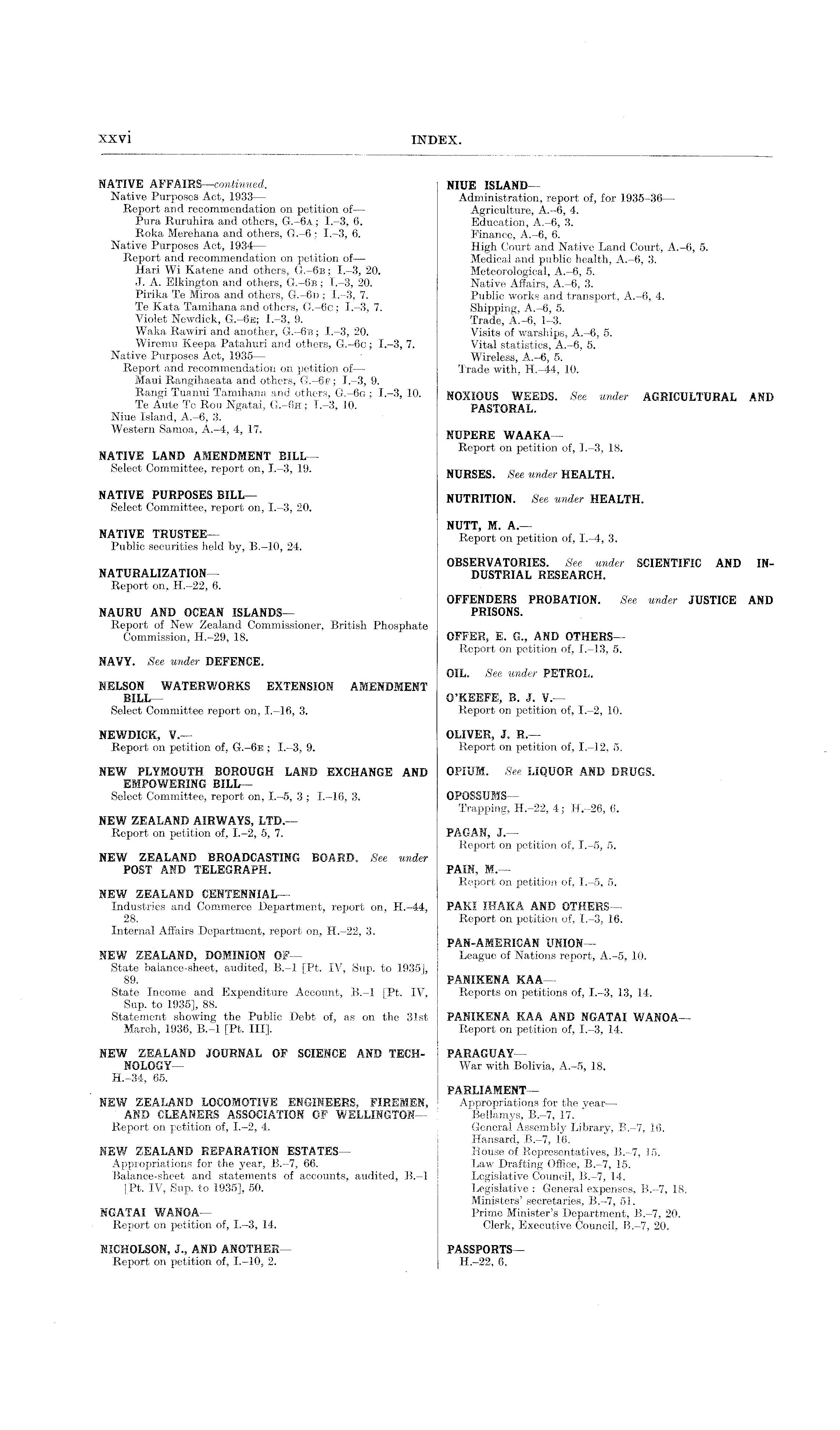 NATIVE AFFAIRS —continued. NIUE ISLAND— Native Purposes Act, 1933— Administration, report of, for 1935-36— Report and recommendation on petition of — Agriculture, A.-6, 4. Pura Ruruhira and others, G.-6a ; 1.-3, 6. Education, A.-6, 3. Roka Merehana and others, G.-6 ■ Ī.-3, 6. Finance, A.-6, 6. Native Purposes Act, 1934 — High Court and Native Land Court, A.-6, 5. Report and recommendation on petition of— Medical and public health, A.-6, 3. Hari Wi Katene and others, G.-6b ; Ī.-3, 20. Meteorological, A.-6, 5. ,T. A. Elkington and others, G.-6b ; 1.-3, 20. Native Affairs, A.-6, 3. Pirika Te Miroa and others, G.—6i>; 1.-3, 7. Public works and transport, A.—6, 4. Te Kata Tamihana and others, G.-6c; 1.-3, 7. Shipping, A.-6, 5. Violet Newdick, G.-6e; 1.-3, 9. Trade, Ā.-6, 1-3. Waka Rawiri and another, G.-6b ; 1.-3, 20. Visits of warships, A.-6, 5. Wiremu Keepa Patahuri and others, G.-6c; 1.-3, 7. Vital statistics, A.-6, 5. Native Purposes Act, 1935— Wireless, A.-6, 5. Report and recommendation on petition of— Trade with, H.-44, 10. Maui Rangihaeata and others, G.-6f ; 1.-3, 9. Rangi Tuanui Tamihana and others, G.-6o; 1.-3, 10. NOXIOUS WEEDS. See under AGRICULTURAL AND Te Aute Te Ron Ngatai, G.-6h ; 1.-3, 10. PASTORAL. Nine Island, A.-6, 3. Western Samoa, A.-4, 4, 17. NUPERE WAAKA— _ . Report on petition of, Ī.-3, 18. NATIVE LAND AMENDMENT BILL — r Select Committee, report on, 1.-3, 19. NURSES. See under HEALTH. NATIVE PURPOSES BILL-- NUTRITION. See under HEALTH. Select Committee, report on, 1.-3, 20. NUTT M A NATIVE TRUSTEE— Report on petition of, 1.-4, 3. Public securities held by, 8.-10, 24. OBSERVATORIES. See under SCIENTIFIC AND INNATURALIZATION— DUSTRIAL RESEARCH. Report on, H.-22, 6. OFFENDERS PROBATION. See under JUSTICE AND NAURU AND OCEAN ISLANDS— PRISONS. Report of New Zealand Commissioner, British Phosphate Commission, H.-29, 18. OFFER, E. G., AND OTHERS — Report on petition of, 1.—13, 5. NAVY. See under DEFENCE. OIL. See under PETROL. NELSON WATERWORKS EXTENSION AMENDMENT BILL— O'KEEFE, B. J. V,— Select Committee report on, 1.-16, 3. Report on petition of, 1.-2, 10. NEWDICK, V.— OLIVER, J. R.— Report on petition of, G.-6e ; 1.-3, 9. Report on petition of, 1.-12, 5. NEW PLYMOUTH BOROUGH LAND EXCHANGE AND OPIUM. See LIQUOR AND DRUGS. EMPOWERING BILL— Select Committee, report on, 1.-5, 3 ; 1.-16, 3. OPOSSUMS — Trapping. H.-22, 4; H.-26, 6. NEW ZEALAND AIRWAYS, LTD.— Report on petition of, 1.-2, 5, 7. PAGAN, J. — Report on petition of, 1.-5, 5. NEW ZEALAND BROADCASTING BOARD. See under POST AND TELEGRAPH. PAIN, M.— Report on petition of, 1.-5, 5. NEW ZEALAND CENTENNIAL - Industries and Commerce Department, report on, H.-44, PAKI IHAKA AND OTHERS — 28. Report on petition of, I. -3, 16. Internal Affairs Department, report on, H.-22, 3. PAN-AMERICAN UNIONNEW ZEALAND, DOMINION OF — League of Nations report, A.-5, 10. State balance-sheet, audited, 8.-l [Pt. IV, Sup. to 1935], 89. PANIKENA KAA— State Income and Expenditure Account, 8.-l [Pt. IV, Reports on petitions of, 1.-3, 13, 14. Sup. to 1935], 88. Statement showing the Public Debt of, as on the 31st PANIKENA KAA AND NGATAI WANOA— March, 1936, 8.-l [Pt. lII]. Report on petition of,. 1.-3, 14. NEW ZEALAND JOURNAL OF SCIENCE AND TECH- PARAGUAY— NOLOGY — War with Bolivia, A.-5, 18. H.-34, 65. PARLIAMENTNEW ZEALAND LOCOMOTIVE ENGINEERS, FIREMEN, Appropriations for the year— AND CLEANERS ASSOCIATION OF WELLINGTON— Bellamys, 8.-7, 17. Report on petition of, 1.-2, 4. General Assembly Library, 8.-7, 16. Hansard, 8.-7, 16. NE¥/ ZEALAND REPARATION ESTATES — House of Representatives, 8.-7, 15. Appropriations for the year, 8.-7, 66. Law Drafting Office, 8.-7, 15. Balance-sheet and statements of accounts, audited, 8.-l Legislative Council, 8.-7, 14. [Pt. IV, Sup. to 1935], 50. Legislative : General expenses, 8.-7, 18. Ministers' secretaries, 8.-7, 51. NGATAI WANOA — Prime Minister's Department, 8.-7, 20. Report on petition of, 1.-3, 14. Clerk, Executive Council, 8.-7, 20. NICHOLSON, J., AND ANOTHER— PASSPORTS— Report on petition of, I.—lo, 2. H.-22, 6.