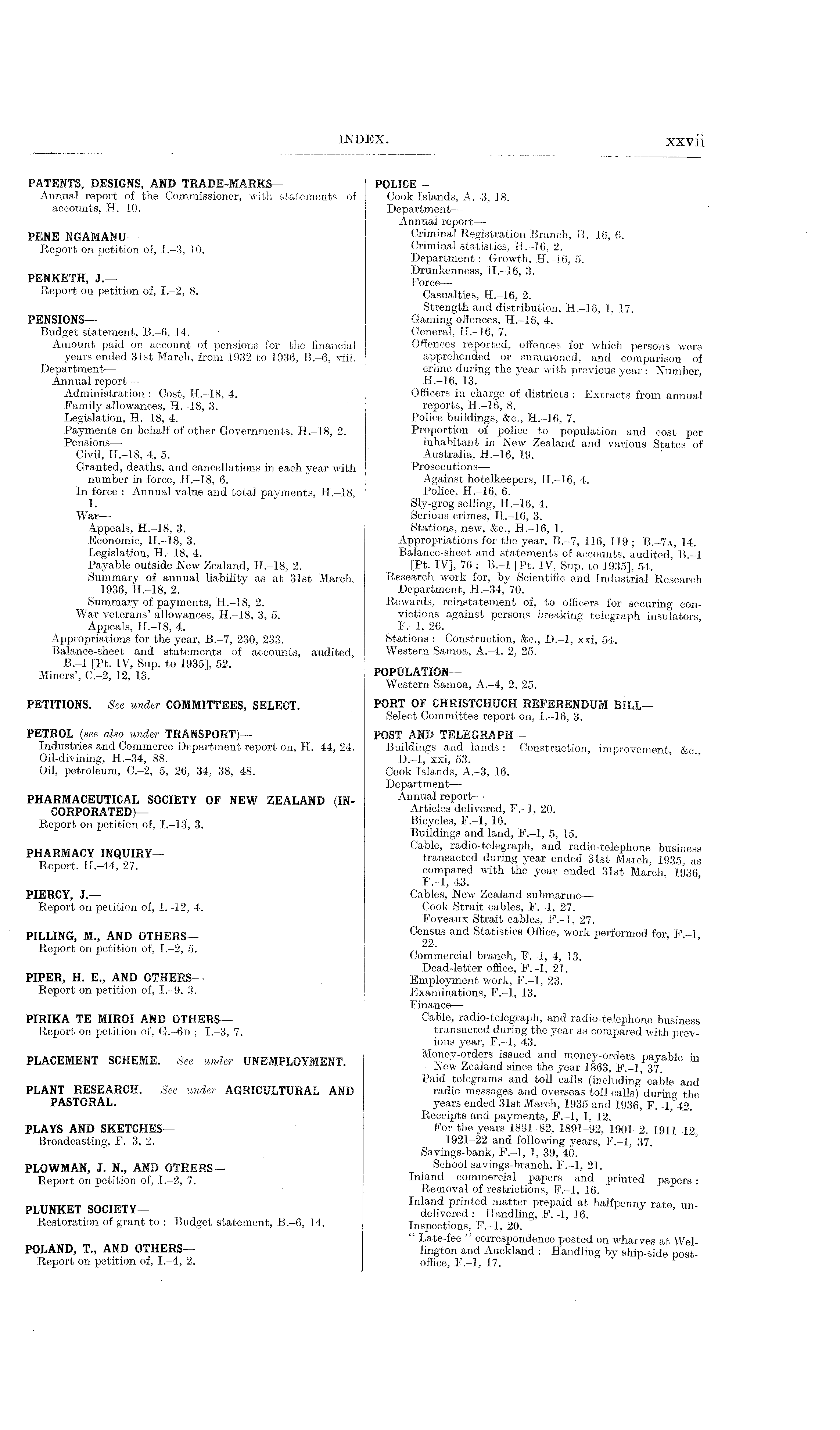 PATENTS, DESIGNS, AND TRADE-MARKS POLICE - Annual report of the Commissioner, with statements of Cook Islands, A.-3, 18. accounts, H.—lo. Department— Annual report — PENE NGAMANU Criminal Registration Branch, H.-16, 6. Report on petition of, 1.-3, 10. Criminal statistics, H.-16, 2. Department: Growth, H.-16, 5. PENKETH, J.- Force— nn6SS ' 6 ' Report on petition of, 1.-2, 8. Casualties, H.-16, 2. Strength and distribution, H.-16, 1. 17. PENSIONS — Gaming offences, H.-16, 4. Budget statement, 8.-6, 14. General, If. 16. 7. Amount paid on account of pensions for the financial Offences reported, offences for which persons were years ended 31st March, from. 1932 to 1936, 8.-6, xiii. apprehended or summoned, and comparison of Department— crime during the year with previous year: Number, Annual report — H.-16, 13. Administration : Cost, H.-18, 4. Officers in charge of districts : Extracts from annual Family allowances, H.-18, 3. reports, H.-16, 8. Legislation, H.-18, 4. Police buildings, &c., H.-16, 7. Payments on behalf of other Governments, H.-18, 2. Proportion of police to population and cost per Pensions — inhabitant in New Zealand and various States of Civil, H.-18, 4, 5. Australia, H.-16, 19. Granted, deaths, and cancellations in each year with Prosecutions — number in force, H.-18, 6. Against hotelkeepers, H.-16, 4. In force : Annual value and total payments, H.-18, Police, H.-16, 6. 1. Sly-grog selling, H.-16, 4. War— Serious crimes, H.-16, 3. Appeals, H.-18, 3. Stations, new, &c., H.-16, 1. Economic, H.-18, 3. Appropriations for the year, 8.-7, 116, 119 ; 8.-7 a, 14. Legislation, H.-18, 4. Balance-sheet and statements of accounts, audited, 8.-l Payable outside New Zealand, H.-18, 2. [Pt. IV], 76 ; 8.-l [Pt. IV, Sup. to 1935], 54. Summary of annual liability as at 31st March, Research work for, by Scientific and Industrial Research 1936, H.-18, 2. Department, H.-34, 70. Summary of payments, H.-18, 2. Rewards, reinstatement of, to officers for securing conWar veterans' allowances, H.-18, 3, 5. victions against persons breaking telegraph insulators, Appeals, H.-18, 4. F.-l, 26. Appropriations for the year, 8.-7, 230, 233. Stations : Construction, See., D.-l, xxi, 54. Balance-sheet and statements of accounts, audited, Western Samoa, A.-4, 2, 25. 8.-l [Pt. IV, Sup. to 1935], 52. Miners', C.-2, 12, 13. POPULATION— Western Samoa, A.-4, 2. 25. PETITIONS. See under COMMITTEES, SELECT. PORT OF CHRISTCHUCH REFERENDUM BILL— Select Committee report on, 1.—16, 3. PETROL (see also under TRANSPORT)— POST AND TELEGRAPH— Industries and Commerce Department report on, H.-44, 24, Buildings and lands : Construction, improvement &c. Oil-divining, H.-34, 88. D.-l, xxi, 53. Oil, petroleum, C.-2, 5, 26, 34, 38, 48. Cook Islands, A.-3, 16. Department— PHARMACEUTICAL SOCIETY OF NEW ZEALAND (IN- Annual report— CORPORATED) Articles delivered, F.-l, 20. Report on petition of, 1.—13, 3. Bicycles, i.-l, 16. Buildings and land, F.-l, 5, 15. PTJ4RMIW TwniTTCV Gable ' radi °-telegraph, and radio-telephone business p . 1197 transacted during year ended 3.lst March, 1935, as P ' ' ' compared with the year ended 31st March, 1936 F.-l, 43. PIERCY, J. — Cables, New Zealand submarine— Report on petition of, 1.-12, 4. Cook Strait cables, F.-l, 27. Foveaux Strait cables, F.-l, 27. PILLING, M., AND OTHERS Census and Statistics Office, work performed for, F.-l, Report on petition of, 1.-2, 5. „ 22 " ~ , ,_, , , „ Commercial branch, F.-l, 4, 13. Dead-letter office, F.-l, 21. PIPER, H. E., AND OTHERS— Employment work, F.-l, 23. Report on petition of, Ī.-9, 3. Examinations, F.-l, 13. Finance— PIRIKA TE MIROI AND OTHERS— Cable, radio-telegraph, and radio-telephone business Report on petition of, G.-6.D ; 1.-3, 7. transacted during the year as compared with previous year, F.-l, 43. PLACEMENT SCHEME, See under UNEMPLOYMENT. ™ Paid telegrams and toll calls (including cable and PLANT RESEARCH. See under AGRICULTURAL AND radio messages and overseas toll calls) during the PASTORAL. years ended 31st March, 1935 and 1936, F.-l, 42. Receipts and payments, F.-l, 1, 12. PLAYS AND SKETCHES— For the years 1881-82, 1891-92, 1901-2, 1911-12, Broadcasting, F.-3, 2. 1921-22 and following years, F.-l, 37. Savings-bank, F.-l, 1, 39, 40. PLOWMAN, J. N., AND OTHERS— _ School savings-branch, F.-l, 21. Report on petition of, Ī.-2, 7. Inland commercial papers and printed papers : Removal of restrictions, F.-l, 16. m TTMKI7T cnriPTV Inland printed matter prepaid at halfpenny rate, unPLUNKET SOCIETY— delivered : Handling, F.-l, 16. Restoration of grant to : Budget statement, 8.-6, 14. Inspections, F-1 20 " Late-fee " correspondence posted on wharves at WelPOLAND, T., AND OTHERS — lington and Auckland : Handling by ship-side nostReport on petition of, 1.-4, 2. office, F.-l, 17.