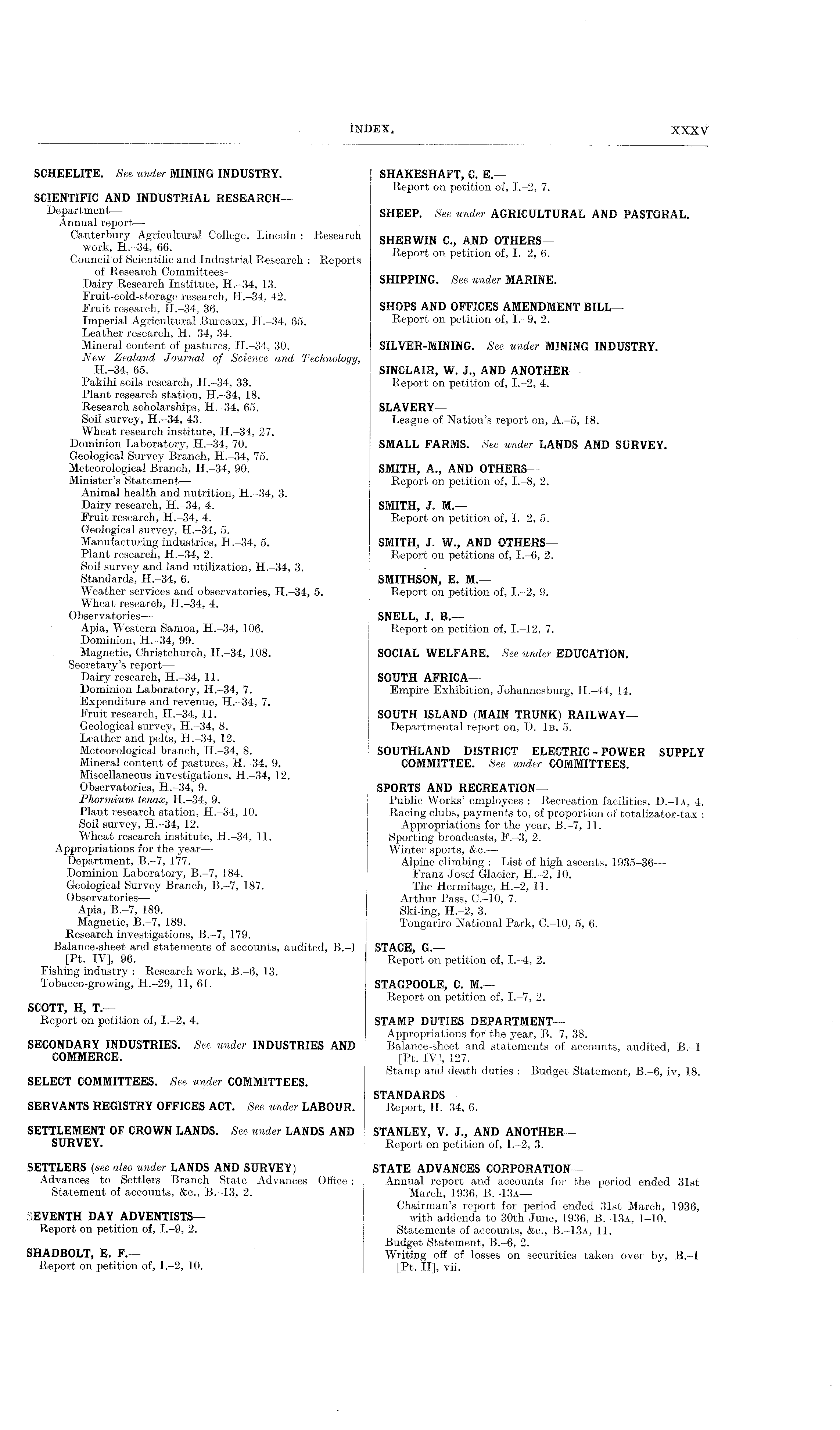 SCHEELJTE. See under MINING INDUSTRY. SHAKESHAFT, C. E.— Report on petition of, 1.-2, 7. SCIENTIFIC AND INDUSTRIAL RESEARCH - Department— SHEEP. See under AGRICULTURAL AND PASTORAL. Annual report — Canterbury Agricultural College, Lincoln Research SHERWIN C AND OTHERS work, H.-34, 66. >> , .... * T o * n •] .f o • ,•£ j t i i • it> i -r» i Report on petition of, 1.-2, 6. Council of fecientinc and Industrial Research : Reports of Research Committees— « 7 _ Dairy Research Institute, H.-34, 13. SHIPPING. See under MARINE. Fruit-cold-storage research, H.-34, 42. Fruit research, H.-34, 36. SHOPS AND OFFICES AMENDMENT BILL— Imperial Agricultural Bureaux, H.-34, 65. Report on petition of, 1.-9, 2. Leather research, H.-34, 34. Mineral content of pastures, H.-34, 30. SILVER-MINING. See under MINING INDUSTRY. New Zealand Journal of Science and Technology, H.-34, 65. SINCLAIR, W. J., AND ANOTHER— Pakihi soils research, H.-34, 33. Report on petition of, 1.-2, 4. Plant research station, H.-34, 18. Research scholarships, H.-34, 65. SLAVERY— Soil survey, H.-34, 43. League of Nation's report on, A.-5, 18. Wheat research institute, H.-34, 27. Dominion Laboratory, H.-34, 70. SMALL FARMS. See under LANDS AND SURVEY. Geological Survey Branch, H.-34, 75. Meteorological Branch, It. 34, 90. SMITH, A., AND OTHERS — Minister's Statement — Report on petition of, 1.-8, 2. Animal health and nutrition, H.-34, 3. Dairy research, H.-34, 4. SMITH, J. M.— Fruit research, H.-34, 4. Report on petition of, 1.—2, 5. Geological survey, H.-34, 5. Manufacturing industries, H. 34, 5. SMITH, J. W., AND OTHERS— Plant research, H.-34, 2. Report on petitions of, 1.-6, 2. Soil survey and land utilization, H.-34, 3. Standards, H.-34, 6. SMITHSON, E. M.— Weather services and observatories, H.-34, 5. Report on petition of, 1.-2, 9. Wheat research, H.-34, 4. Observatories — SNELL, J. B. — Apia, Western Samoa, H.-34, 106. Report on petition of, 1.-12, 7. Dominion, H.-34, 99. Magnetic, Christchurch, H.-34, 108. SOCIAL WELFARE. See under EDUCATION. Secretary's report — Dairy research, H.-34, 11. SOUTH AFRICA— Dominion Laboratory, H.-34, 7. Empire Exhibition, Johannesburg, H.-44, 14. Expenditure and revenue, H.-34, 7. Fruit research, H.-.34, 11. SOUTH ISLAND (MAIN TRUNK) RAILWAY— Geological survey, H.-34, 8. Departmental report on, D.-Ib, 5. Leather and pelts, H.-34, 12. Meteorological branch, H.-34, 8. SOUTHLAND DISTRICT ELECTRIC - POWER SUPPLY Mineral content of pastures, 11. 34, 9. COMMITTEE. See under COMMITTEES. Miscellaneous investigations, H.-34, 12. Observatories, 1134, 9. SPORTS AND RECREATION— Phormium tenax, H.-34, 9. Public Works' employees : Recreation facilities, D.-la, 4. Plant research station, H.-34, 10. Racing clubs, payments to, of proportion of totalizator-tax : Soil survey, H.-34, 12. Appropriations for the year, 8.-7, 11. Wheat research institute, H.-34, 11. Sporting broadcasts, F.-3, 2. Appropriations for the year— Winter sports, &c.— Department, 8.-7, 177. Alpine climbing : List of high ascents, 1935-36— Dominion Laboratory, 8.-7, 184. Franz Josef Glacier, H.-2, 10. Geological Survey Branch, 8.-7, 187. The Hermitage, H.-2, 11. Observatories — Arthur Pass, C.-10, 7. Apia, 8.-7, 189. Ski-ing, H.-2, 3. Magnetic, 8.-7, 189. Tongariro National Park, C.-10, 5, 6. Research investigations, 8.-7, 179. Balance-sheet and statements of accounts, audited, 8.-l STACE, G. — [Pt. IV], 96. Report on petition of, 1.—4, 2. Fishing industry : Research work, 8.-6, 13. Tobacco-growing, H.-29, 11, 61. STAGPOOLE, C. M.— Report on petition of, 1.-7, 2. SCOTT, H, T.— Report on petition of, 1.-2, 4. STAMP DUTIES DEPARTMENT— Appropriations for the year, 8.-7, 38. SECONDARY INDUSTRIES. See under INDUSTRIES AND Balance-sheet and statements of accounts, audited, 8.-l COMMERCE. [Pt. IV], 127. Stamp and death duties : Budget Statement, 8.-6, iv, 18. SELECT COMMITTEES. See under COMMITTEES. STANDARDSSERVANTS REGISTRY OFFICES ACT. See under LABOUR. Report, H.-34, 6. SETTLEMENT OF CROWN LANDS. See under LANDS AND STANLEY, V. J., AND ANOTHER— SURVEY. Report on petition of, 1,— 2, 3. SETTLERS (see also under LANDS AND SURVEY)— STATE ADVANCES CORPORATION— Advances to Settlers Branch State Advances Office : Annual report and accounts for the period ended 31st Statement of accounts, &c., 8.-13, 2. March, 1936, 8.~13a— Chairman's report for period ended 31st March, 1936, SEVENTH DAY ADVENTISTS — with addenda to 30th June, 1936, 8.-13 a, 1-10. Report on petition of, 1.-9, 2. Statements of accounts, &c., 8.-13 a, 11. Budget Statement, 8.-6, 2. SHADBOLT, E. F. — Writing off of losses on securities taken over by, 8.-l Report on petition of, 1.-2, 10. [Pt,. ll], vii.