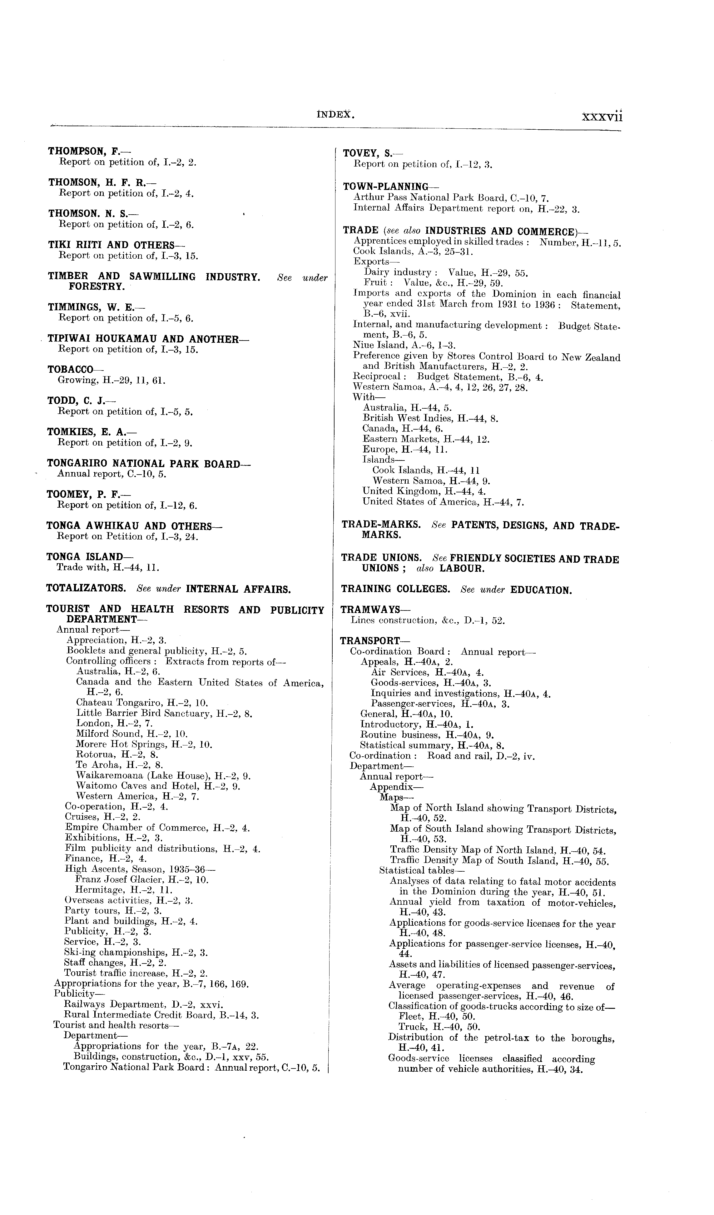 THOMPSON, F.— TOVEY, S. Report on petition of, 1.-2, 2. Report on petition of, 1.—12, 3. THOMSON, H. F. R.— TOWN-PLANNING— Report on petition of, 1.-2, 4. Arthur Pass National Park Board, C.-10, 7. THOMSON N S • Internal Affairs Department report on, H.-22, 3. Report on petition of, 1.-2, 6. TRADE (see also INDUSTRIES AND COMMERCE)— TIKI RIITI AND OTHERS Apprentices employed in skilled trades : Number, H.-U, 5. Report on petition of, 1.-3, 15. Exports- A '~ 3 ' ' TIMBER AND SAWMILLING INDUSTRY. See under £ air f in^ ustr y : V^l ue ' H C? 9 ' 55> FORESTRY -rrurt : Value, &c., M.~29, 59. Imports and exports of the Dominion in each financial TIMMINGS, W. E. year end .® d 31st March from 1931 to 1936 : Statement, Report on petition of, 1.-5, 6. „ , Internal, and manufacturing development: Budget StateTIPIWAI HOUKAMAU AND ANOTHER— xr ™ 6 ?*,' "VH \ Report on petition of, 1.-3, 15. ? lu f s ' anc^» Preference given by Stores Control Board to New Zealand TOBACCO British Manufacturers, H.-2, 2. Growing H.-29 11 61 Reciprocal: Budget Statement, 8.-6, 4. Western Samoa, A.-4, 4, 12, 26, 27, 28. TODD, C. J.— With— Report on petition of, 1.-5, 5. Australia, H.-44,0. British West Indies, H.-44, 8. TOMKIES, E. A.— Canada, H.-44, 6. Report on petition of, 1.-2, 9. Eastern Markets, H.-44, 12. r Europe, H.-44, 11. TONGARIRO NATIONAL PARK BOARD— Islands— Annual report, C.-10, 5. Cook Islands, H.-44, 11 Western Samoa, H.-44, 9. TOOMEY P. F. United Kingdom, H.-44, 4. Report'on'petition of, 1.-12, 6. United States of America, H.-44, 7. TONGA AWHIKAU AND OTHERS— TRADE-MARKS. See PATENTS, DESIGNS, AND TRADEReport on Petition of, 1.—3, 24. MARKS. TONGA ISLAND— TRADE UNIONS. See FRIENDLY SOCIETIES AND TRADE Trade with, H.-44, 11. UNIONS ; also LABOUR. TOTALIZATORS. See under INTERNAL AFFAIRS. TRAINING COLLEGES. See under EDUCATION. TOURIST AND HEALTH RESORTS AND PUBLICITY TRAMWAYSDEPARTMENT— Lines construction, &c., D.-l, 52. Annual report— Appreciation, H.-2, 3. TRANSPORT— Booklets and general publicity, H.-2, 5. Co-ordination Board : Annual report— Controlling officers : Extracts from reports of— Appeals, H.-40a, 2. Australia, H.-2, 6. Air Services, H.-40a, 4. Canada and the Eastern United States of America, Goods-services, H.-40A, 3. H.-2, 6. Inquiries and investigations, H.-40a, 4. Chateau Tongariro, H.-2, 10. Passenger-services, H.-40a, 3. Little Barrier Bird Sanctuary, JI.-2, 8. General, H.-40a, 10. London, H.-2, 7. Introductory, H.-40A, 1. Milford Sound, H. -2, 10. Routine business, H.-40a, 9. Morere Hot Springs, H.-2, 10. Statistical summary, H.-40a, 8. Rotorua, H.-2, 8. Co-ordination : Road and rail, D.-2, iv. Te Aroha, 11. 2, 8. Department— Waikaremoana (Lake House), H.-2, 9. Annual report — Waitomo Caves and Hotel, H.-2, 9. Appendix— Western America, H.-2, 7. Maps— Co-operation, H.-2, 4. Map of North Island showing Transport Districts, Cruises, H.-2, 2. H.-40, 52. Empire Chamber of Commerce, H.-2, 4. Map of South Island showing Transport Districts Exhibitions, H.-2, 3. H.-40, 53. Film publicity and distributions, H.-2, 4. ; Traffic Density Map of North Island, H.-40, 54. Finance, H.-2, 4. Traffic Density Map of South Island, H.-40, 55. High Ascents, Season, 1935—36— Statistical tables — Franz Josef Glacier, H.-2, 10. Analyses of data relating to fatal motor accidents Hermitage, H.-2, 11. in the Dominion during the year, H.-40, 51. Overseas activities, H.-2, 3. Annual yield from taxation of motor-vehicles, Party tours, H.-2, 3. H.-40, 43. Plant and buildings, H.-2, 4. Applications for goods-service licenses for the year Publicity, H.-2, 3. H.-40, 48. Service, H.-2, 3. Applications for passenger-service licenses, H.-40, Ski-ing championships, H.-2, 3. 44. Staff changes, H.-2, 2. Assets and liabilities of licensed passenger-services, Tourist traffic increase, H.-2, 2. H.-40, 47. Appropriations for the year, 8.-7, 166, 169. Average operating-expenses and revenue of Publicity— licensed passenger-services, 46. Railways Department, D.-2, xxvi. Classification of goods-trucks according to size of— Rural Intermediate Credit Board, 8.-14, 3. Fleet, H.-40, 50. Tourist and health resorts — Truck, H.-40, 50. Department— Distribution of the petrol-tax to the boroughs, Appropriations for the year, 8.-7 a, 22. H.-40, 41. Buildings, construction, &c„ D.-l, xxv, 55. Goods-service licenses classified according Tongariro National Park Board: Annual report, C.-10, 5. number of vehicle authorities, 34.