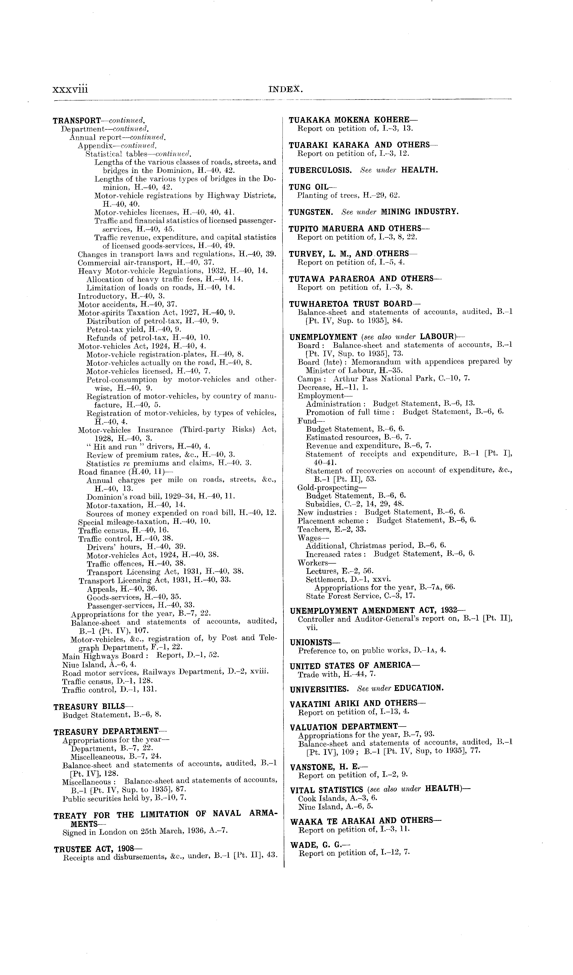 TRANSPORT —continued. TUAKAKA MOKENA KOHERE— Department—continued. Report on petition of, 1.-3, 13. Annual report—continued. Appendix—continued. TUARAKI KARAKA AND OTHERS — Statistical tables —continued. Report on petition of, 1.-3, 12. Lengths of the various classes of roads, streets, and bridges in the Dominion, 11. 40, 42. TUBERCULOSIS. See under HEALTH. Lengths of the various types of bridges in the Dominion, H.-40, 42. TUNG OIL — Motor-vehicle registrations by Highway Districts, Planting of trees, H.-29, 62. H.-40, 40. Motor-vehieles licenses, H.-40, 40, 41. TUNGSTEN. See under MINING INDUSTRY. Traffic and financial statistics of licensed passengerservices, H.-40, 45. TUPITO MARUERA AND OTHERS— Traffic revenue, expenditure, and capital statistics Report on petition of, 1.-3, 8, 22. of licensed goods-services, H.-40, 49. Changes in transport laws and regulations, H.-40, 39. TURVEY, L. M., AND OTHERS — Commercial air-transport, H.-40, 37. Report on petition of, 1.-5, 4. Heavy Motor-vehicle Regulations, 1932, H.-40, 14. Allocation of heavy traffic fees, H.-40, 14. TUTAWA PARAEROA AND OTHERS — Limitation of loads on roads, H. 40, 14. Report on petition of, 1.-3, 8. Introductory, H.-40, 3. Motor accidents, H.-40, 37. TUWHARETOA TRUST BOARD— Motor-spirits Taxation Act, 1927, H.-40, 9. Balance-sheet and statements of accounts, audited, 8.-l Distribution of petrol-tax, 11.-40, 9. [Pt. IV, Sup. to 1935], 84. Petrol-tax yield, H.-40, 9. Refunds of petrol-tax, H.-40, 10. UNEMPLOYMENT (see also under LABOUR) — Motor-vehicles Act, 1924, H.-40, 4. Board : Balance-sheet and statements of accounts, 8.-l Motor-vehicle registration-plates, H.-40, 8. [Pt. IV, Sup. to 1935], 73. Motor-vehicles actually on the road, H.-40, 8. Board (late) : Memorandum with appendices prepared by Motor-vehicles licensed, H.-40, 7. Minister of Labour, H.-35. Petrol-consumption by motor-vehicles and other- Camps : Arthur Pass National Park, C.-10, 7. wise, H.-40, 9. Decrease, H.-11, 1. Registration of motor-vehicles, by country of maim- Employment — facture, H.-40, 5. Administration : Budget Statement, 8.-6, 13. Registration of motor-vehicles, by types of vehicles, Promotion of full time : Budget Statement, 8.-6, 6. H.-40, 4. Fund— Motor-vehicles Insurance (Third-party Risks) Act, Budget Statement, 8.-6, 6. 1928, H.-40, 3. Estimated resources, 8.-6, 7. " Hit and run " drivers, H.-40, 4. Revenue and expenditure, 8.-6, 7. Review of premium rates, &c., H.-40, 3. Statement of receipts and expenditure, 8.-l [Pt. I], Statistics re premiums and claims, H.-40, 3 . 40-41. Road finance (H. 40, 11) — Statement of recoveries on account, of expenditure, &c., Annual charges per mile on roads, streets, &c., 8.-l [Pt. ll], 53. H.-40, 13. Gold-prospecting — Dominion's road bill, 1929-34, 11.-40, 11. Budget Statement, 8.-6, 6. Motor-taxation, H.—4o, 14. Subsidies, C.—2, 14, 29, 48. Sources of money expended on road bill, H.-40, 12. New industries : Budget Statement, 8.-6, 6. Special mileage-taxation, H.-40, 10. Placement scheme : Budget Statement, 8.-6, 6. Traffic census, 11. 40, 16. Teachers, E.—2, 33. Traffic control, H.-40, 38. Wages— Drivers' hours, H.-40, 39. Additional, Christmas period, 8.-6, 6. Motor-vehicles Act, 1924, H.-40, 38. Increased rates : Budget Statement, 8.-6, 6. Traffic offences, H.-40, 38. Workers — Transport Licensing Act, 1931, H.-40, 38. Lectures, E.-2, 56. Transport Licensing Act, 1931, H.—4o, 33. Settlement, D.—l, xxvi. Appeals, H.-40, 36. Appropriations for the year, 8.-7 a, 66. Goods-services, H.-40, 35. State Forest Service, C.-3, 17. AppropSSorte feiTrtV-i 22. UNEMPLOYMENT AMENDMENT ACT, 1932-Balance-sheet and statements of accounts, audited, Controller and Auditor-Geneial s report on, B. 1 [Pt. ll], 8.-l (Pt. IV), 107. vu - Motor-vehicles, &c„ registration of, by Post and Tele- UNIONISTS— graph Department, F/-1, 22. Preference to, on public works, D.-la, 4. Main Highways Board : Report, D.-l, 52. Niue Island, A.-6, 4. UNITED STATES OF AMERICA — Road motor services, Railways Department, D.-2, xvm. Trade with, H.-44, 7. Traffic census, D.-l, 128. Traffic control, D.-l, 131. UNIVERSITIES. See under EDUCATION. TREASURY BILLS- VAKATINI ARIKI AND OTHERSBudget Statement, 8.-6, 8. Report on petition of, 1.-13, 4. -TDPacxmv nsrpARTMFNT - VALUATION DEPARTMENT— TREASURY DEPARTM Appropriations for the year, 8.-7, 93. Appropriations for the yeai Balance-sheet and statements of accounts, audited, 8.-l Department, 8.-7, 22 iy IQ9 B_, [pt _ IV , S up, to 1935], 77. Miscellaneous, 13.-7, z4. L Balance-sheet and statements of accounts, audited, B.—l VANSTONE, H. E.— [Pt. IV], 128. Report on petition of, 1.-2, 9. Miscellaneous : Balance-sheet and statements of accounts, r 8.-l [Pt. IV, Sup. to 1935], 87. VITAL STATISTICS (see also under HEALTH)— Public securities held by, 8.-10, 7. Cook Islands, A.-3, 6. Niue Island, A.-6, 5. TREATY FOR THE LIMITATION OF NAVAL ARMAMENTS- WAAKA TE ARAKAI AND OTHERSSigned in London on 25th March, 1936, A.-7. Report on petition of, 1.-3, 11. Te S clFpts tnd'dlsbur7ements, &c„ under, 8.-l [Pt. ll], 43. of, L-12, 7.