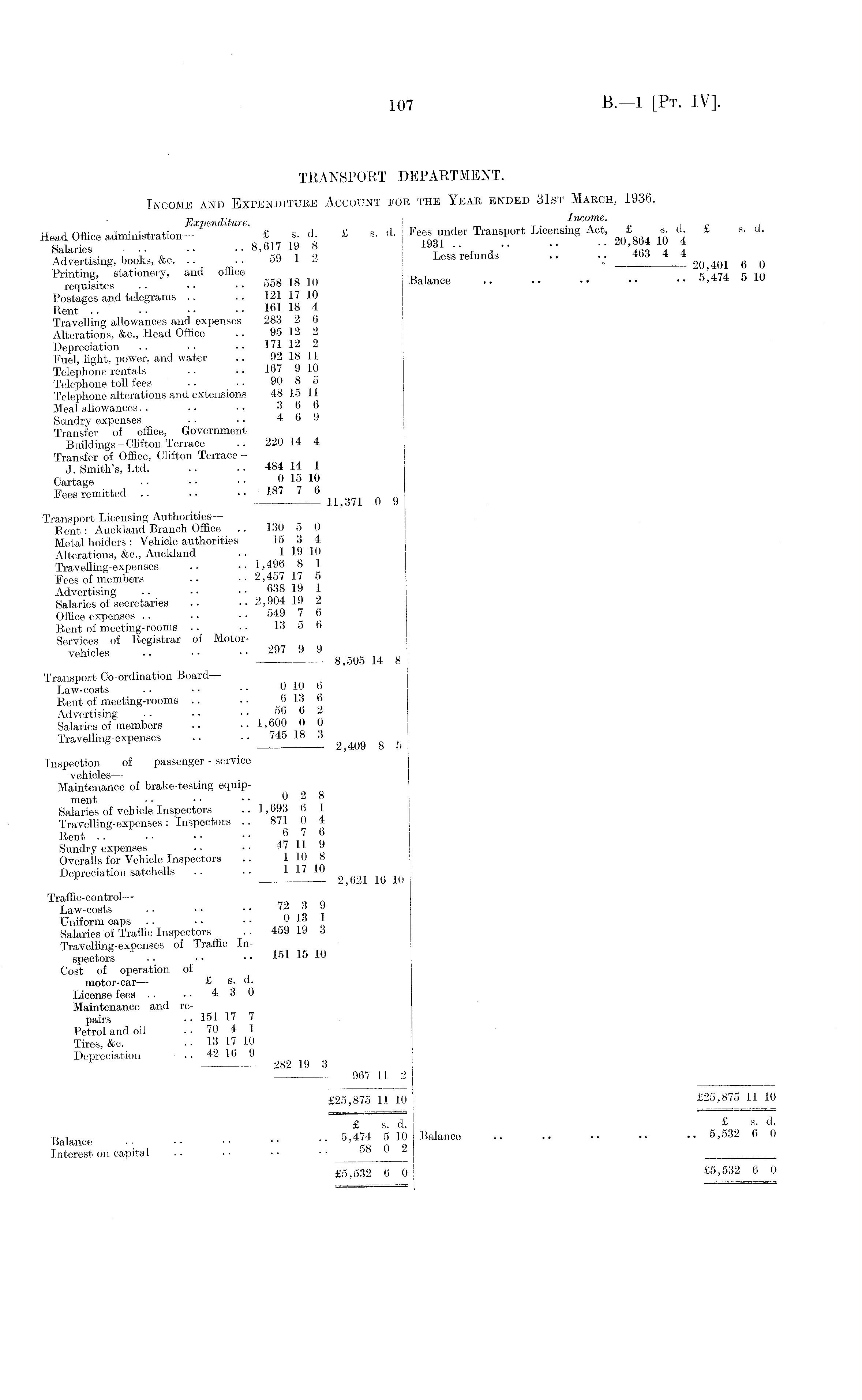 TRANSPORT DEPARTMENT. Income and Expenditure Account for the Year ended 31st March, 1936. Expenditure ' Income. Head Office administration- £ b. d. £ s. d. Fees under Transport Licensing Act, * cl. £ 8 . d. Salaries .. .. • • 8,617 19 8 • • 'jaq a. a. Advertising, books, &c 59 1 2 Less refunds .. V 463 4420 m Q Q Printing, stationery, and office Balance 5',474 510 requisites .. •• •• 558 18 10 .Balance Postages and telegrams .. .. 121 17 10 Rent .. 16 .1 if 4 Travelling allowances and expenses 283 2 6 Alterations, &c., Head Office .. 95 12 2 Depreciation ■ • • • ■ • 171 12 2 Fuel, light, power, and water .. 92 18 11 Telephone rentals . • • • 167 910 Telephone toll fees .. • • 90 8 5 Telephone alterations and extensions 48 15 11 Meal allowances.. • • • • 3 6 6 Sundry expenses .. • • 4 6 9 Transfer of office, Government Buildings - Clifton Terrace .. 220 14 4 Transfer of Office, Clifton Terrace - J. Smith's, Ltd. .. • • 484 14 1 Cartage • • • ■ • • 0 15 10 Fees remitted 187 n, 3 71 0 9 Transport Licensing Authorities Rent: Auckland Branch Office .. 130 5 0 Metal holders : Vehicle authorities 15 3 4 Alterations, &c., Auckland .. 1 19 10 Travelling-expenses .. •• 1,496 8 1 Fees of members .. •• 2,457 17 5 Advertising ■ • • • • • 638 19 1 Salaries of secretaries .. 2,904 19 2 Office expenses .. . • • • 549 7 6 Rent of meeting-rooms .. •• 13 5 6 Services of Registrar of MotorVeMoIeS _!!!_!_! 8,505 14 8 Transport Co-ordination Board — Law-costs . • • • • • 0 10 Rent of meeting-rooms .. • • 6 13 b Advertising . ■ • • ■ • ® -* Salaries of members .. 1,600 0 0 Travelling-expenses .. •• 745 18 3 2,409 8 5 Inspection of passenger - service vehicles — Maintenance of brake-testing equipment ■ • '' '' a< o c ? Salaries of vehicle Inspectors ..1,693 b 1 Travelling-expenses: Inspectors .. 871 0 4 Rent ® 1 ® Sundry expenses . • • ■ 41 ' " Overalls for Vehicle Inspectors .. 110 8 Depreciation satchells .. .. 117 10 r 2,b21 lb 10 Traffic-control — Law-costs .. • • • • 72 3 9 Uniform caps .. • ■ ■ • "la 1 Salaries 'of Traffic Inspectors .. 459 19 3 Travelling-expenses of Traffic Inspectors -■ I®l 1® 10 Cost of operation of motor-car — £ s. d. License fees .. • • 4 3 0 Maintenance and repairs •• 151 17 7 Petrol and oil 70 4 1 Tires, &c. • • 13 17 10 Depreciation • • 42 lb 9 282 19 3 967 11 2 £25,875 11 10 £25,875 11 10 I — ■ £ s. d. £ s. d. Balance 5,4 « n 5,532 b 0 Interest on capital .. • • • • • • 6 ° £5,532 b 0 £5,532 6 0