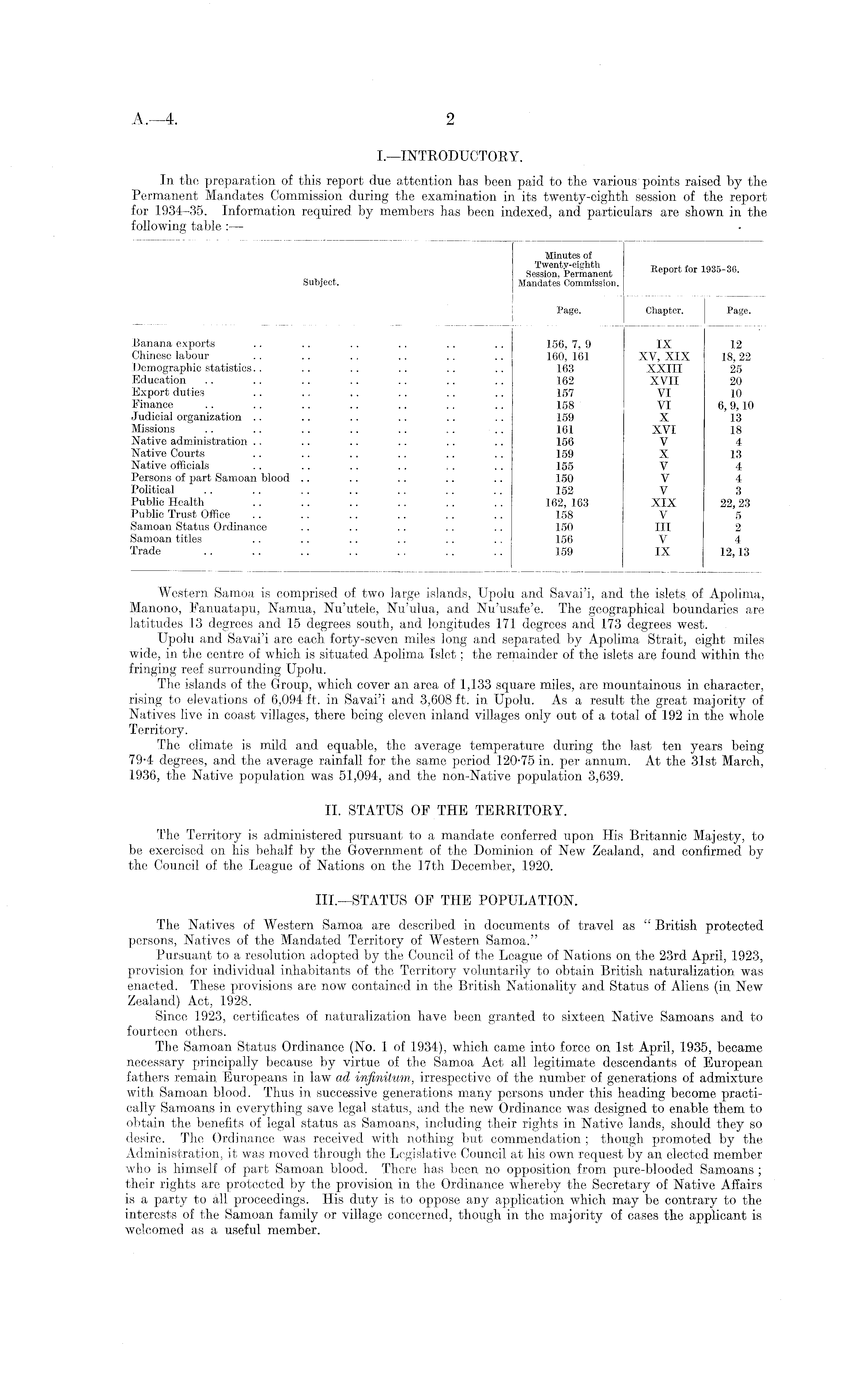 I.—INTRODUCTORY. In the preparation of this report due attention has been paid to the various points raised by the Permanent Mandates Commission during the examination in its twenty-eighth session of the report for 1934-35. Information required by members has been indexed, and particulars are shown in the following table : —