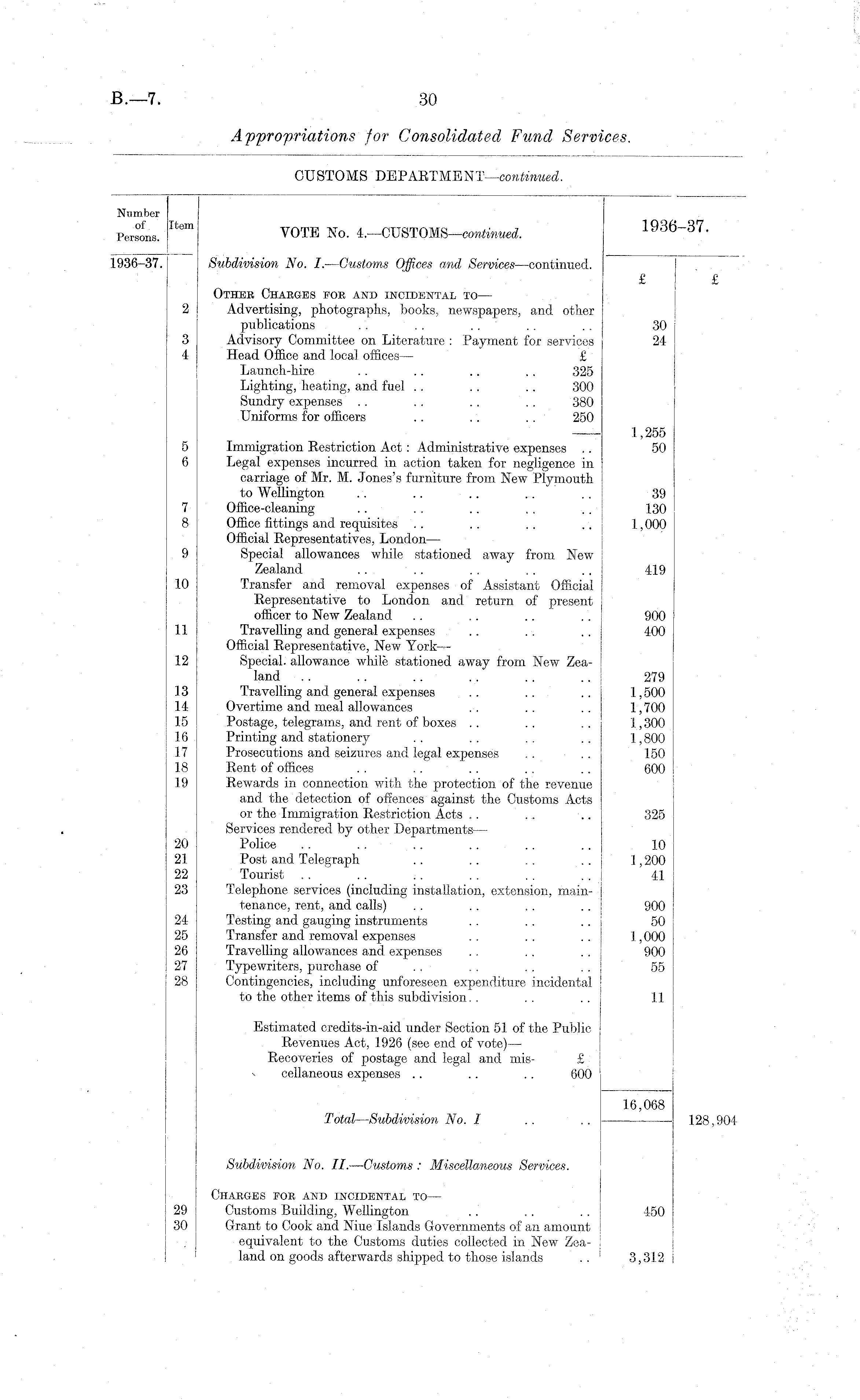 Number Persons. Item VOTE No. 4. —CUSTOMS —continued. 1936-37. 1936-37. Subdivision No. I. —Customs Offices and Services —continued. £ I £ Other Charges foe and incidental to — 2 Advertising, photographs, books, newspapers, and other publications . . . . . . . . . . 30 3 Advisory Committee on Literature : Payment for services 24 4 Head Office and local offices — £ Launch-hire . . .. .. . . 325 Lighting, heating, and fuel .. . . . . 300 Sundry expenses .. .. .. .. 380 Uniforms for officers .. . . . . 250 1,255 5 Immigration Restriction Act : Administrative expenses .. 50 6 Legal expenses incurred in action taken for negligence in carriage of Mr. M. Jones's furniture from New Plymouth to Wellington .. .. .. . . . . 39 7 Office-cleaning .. . , .. . . . . 130 8 Office fittings and requisites .. . . . . .. 1,000 Official Representatives, London — 9 Special allowances while stationed away from New Zealand . . . . . . . . . , 419 10 Transfer and removal expenses of Assistant Official Representative to London and return of present officer to New Zealand .. .. .. .. 900 11 Travelling and general expenses .. . . . . 400 Official Representative, New York— 12 Special, allowance while stationed away from New Zealand . . .. . . . . .. .. 279 13 Travelling and general expenses .. .. .. 1,500 14 Overtime and meal allowances .. .. .. 1,700 15 Postage, telegrams, and rent of boxes .. .. .. 1,300 16 Printing and stationery .. .. .. 1,800 17 Prosecutions and seizures and legal expenses . . . . 150 18 Rent of offices .. . . . . . . . . 600 19 Rewards in connection with the protection of the revenue and the detection of offences against the Customs Acts or the Immigration Restriction Acts . . . . .. 325 Services rendered by other Departments— 20 Police . . . . .. .. .. . . 10 21 Post and Telegraph . . .. . . . . 1,200 22 Tourist . . . . . . . . . . , . 41 23 Telephone services (including installation, extension, maintenance, rent, and calls) . . .. . . .. 900 24 Testing and gauging instruments . . .. .. ! 50 25 Transfer and removal expenses . . . . . . j 1,000 26 Travelling allowances and expenses . . .. . . I 900 27 Typewriters, purchase of . . . . . . ... j 55 28 Contingencies, including unforeseen expenditure incidental | to the other items of this subdivision.. .. .. j 11 I Estimated credits-in-aid under Section 51 of the Public Revenues Act, 1926 (see end of vote) — Recoveries of postage and legal and mis- £ v cellaneous expenses .. .. .. 600 16,068 Total—Subdivision No. I .. .. 128,904 Subdivision No. II.—Customs : Miscellaneous Services. Charges for and incidental to — 29 Customs Building, Wellington . . . . . . 450 30 Grant to Cook and Niue Islands Governments of an amount equivalent to the Customs duties collected in New Zealand on goods afterwards shipped to those islands .. ! 3,312 I