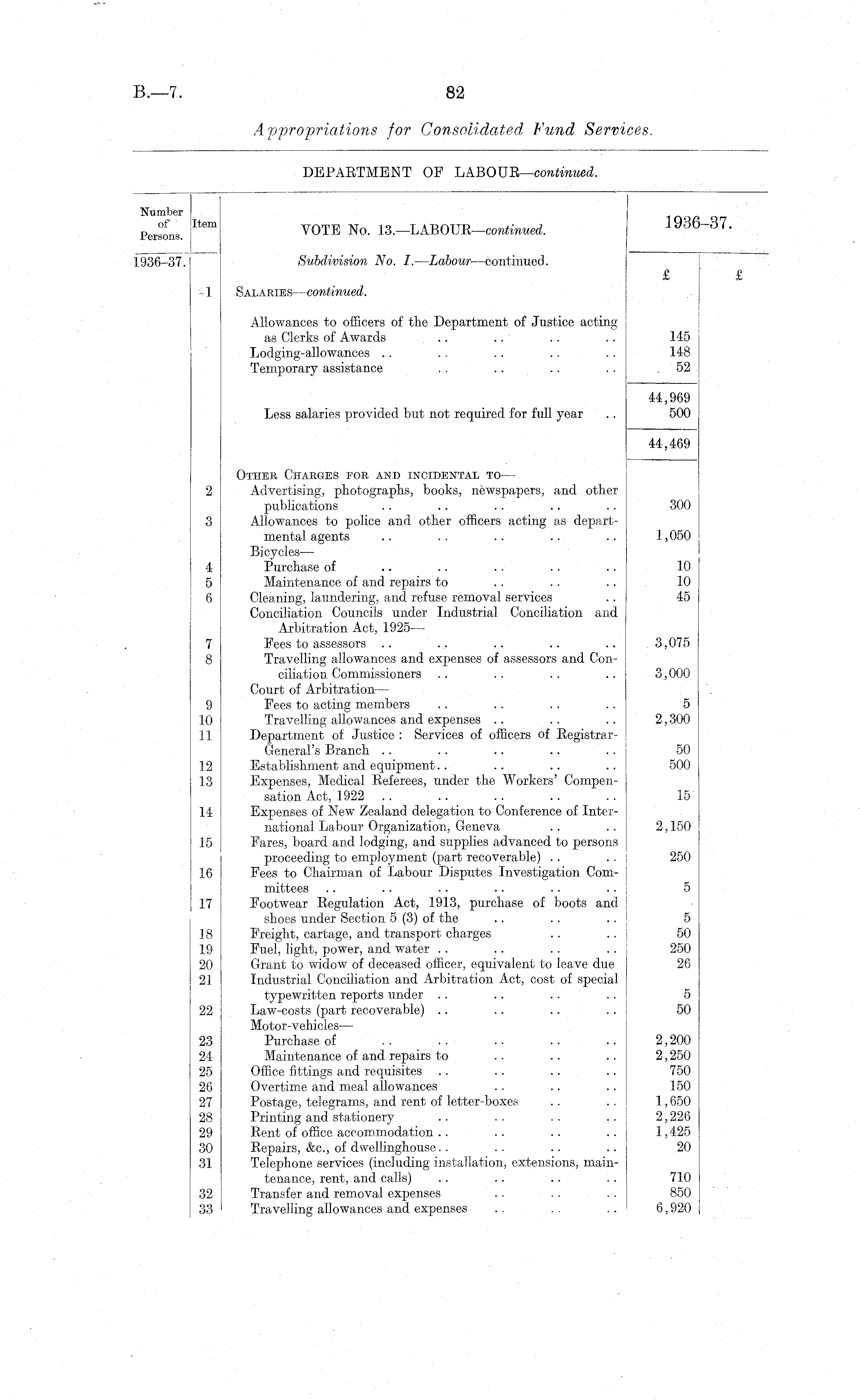 Number -t < < Persons. j It6m V0TE No - 13. —LABOUR —continued. 1936-37 1936-37. Subdivision No. I. —Labour—continued. £ ! 1 Salaries —continued. Allowances to officers of the Department of Justice acting as Clerks of Awards .. .. . . . . 145 Lodging-allowances . . . . .. .. . . 148 Temporary assistance . . .. .. . . 52 44,969 Less salaries provided but not required for full year .. 500 44,469 Other Charges for and incidental to — 2 Advertising, photographs, books, newspapers, and other publications .. .. . . .. . . 300 3 Allowances to police and other officers acting as departmental agents .. .. .. .. .. 1,050 Bicycles — 4 Burchase of .. .. .. . . .. 10 5 Maintenance of and repairs to .. .. .. 10 6 Cleaning, laundering, and refuse removal services .. 45 Conciliation Councils under Industrial Conciliation and Arbitration Act, 1925— 7 Fees to assessors .. . . .. .. .. 3,075 8 Travelling allowances and expenses of assessors and Conciliation. Commissioners .. . . . . .. 3,000 Court of Arbitration — 9 Fees to acting members .. .. . . .. 5 10 Travelling allowances and expenses .. . . .. 2,300 11 Department of Justice : Services of officers of RegistrarGeneral's Branch .. .. .. .. .. 50 12 Establishment and equipment.. .. .. .. 500 13 Expenses, Medical Referees, under the Workers' Compensation Act, 1922 .. .. .. .. .. 15 14 Expenses of New Zealand delegation to Conference of International Labour Organization, Geneva .. . . 2,150 15 Fares, board and lodging, and supplies advanced to persons proceeding to employment (part recoverable) . . .. 250 16 Fees to Chairman of Labour Disputes Investigation Committees .. .. .. .. .. .. | 5 17 Footwear Regulation Act, 1913, purchase of boots and shoes under Section 5 (3) of the .. .. .. 5 18 Freight, cartage, and transport charges .. .. 50 19 Fuel, light, power, and water .. .. . . . . 250 20 Grant to widow of deceased officer, equivalent to leave due 26 21 Industrial Conciliation and Arbitration Act, cost of special typewritten reports under .. .. .. .. 5 22 Law-costs (part recoverable) .. .. .. . . 50 Motor-vehicles — 23 Burchase of . . . • • • ■ • .. 2,200 24 Maintenance of and repairs to . . . . . . 2,250 25 Office fittings and requisites .. .. .. .. 750 26 Overtime and meal allowances . . .. .. 150 27 Bostage, telegrams, and rent of letter-boxes .. .. 1,650 28 Brinting and stationery . . . . . . .. 2,226 29 Rent of office accommodation .. . . . . . . 1,425 30 Repairs, &c., of dwellinghouse.. .. .. .. 20 31 Telephone services (including installation, extensions, maintenance, rent, and calls) .. . . .. . . 710 32 Transfer and removal expenses . . . . . . 850 33 Travelling allowances and expenses . . . . . . 6,920