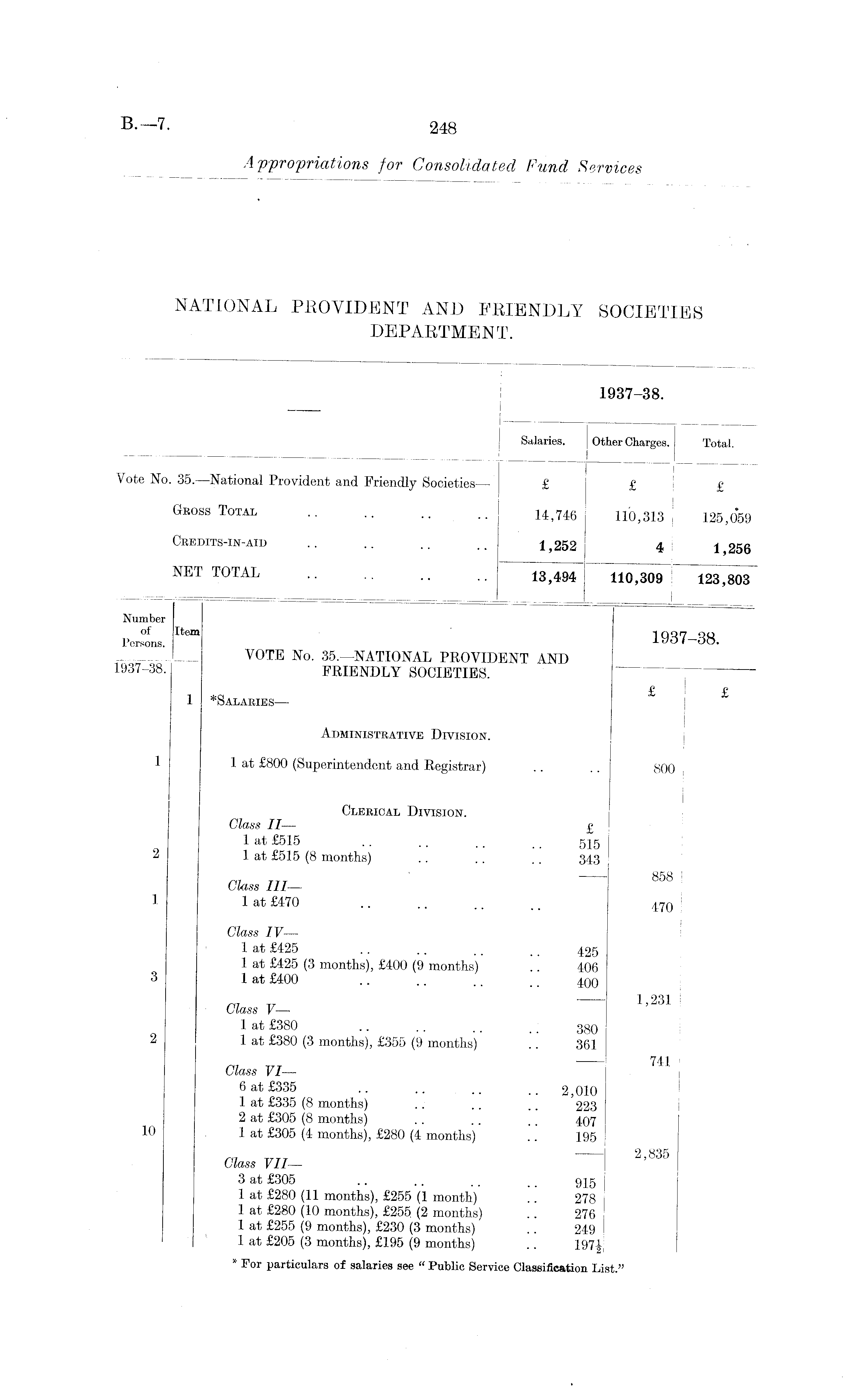 1937-38. I j — | Salaries. Other Charges. Total. Vote No. 35. National Provident and Friendly Societies— £ £ £ Gross Total M>746 no,313 j 125,059 Credits-in-aid 1)252 4 1)256 NET TOTAL .. .. 13,494 110,309 j 123,803 Number of Item i QQ7 qu Persons. ±y0/-00. - VOTE No. 35,— NATIONAL PROVIDENT AND 1937-38. FRIENDLY SOCIETIES. 1 *Salaries—Administrative Division. 1 1 at £800 (Superintendent and Registrar) .. .. 800 Clerical Division. Class II — £ 1 at £515 .. .. ,. 515 2 1 at £515 (8 months) .. .. .. 343 Class III - 1 1 at £470 .. .. .. .. 470 Class IV— 1 at £425 .. .. .. _ _ 425 1 at £425 (3 months), £400 (9 months) .. 406 3 1 at £400 .. .. .. _ 4 00 Class V— 1,231 1 at £380 .. .. , _ _ ggO 2 1 at £380 (3 months), £355 (9 months) .. 361 741 Class VI— 6 at £335 .. .. ., .. 2 010 1 at £335 (8 months) .. .. .. 223 2 at £305 (8 months) .. .. .. 407 10 1 at £305 (4 months), £280 (4 months) .. 195 Class 7/7— 2,835 3 at £305 .. .. .. _ _ 915 1 at £280 (11 months), £255 (1 month) .. 278 1 at £280 (10 months), £255 (2 months) .. 276 1 at £255 (9 months), £230 (3 months) .. 249 1 at £205 (3 months), £195 (9 months) .. 197J * For particulars of salaries see " Public Service Classification List."