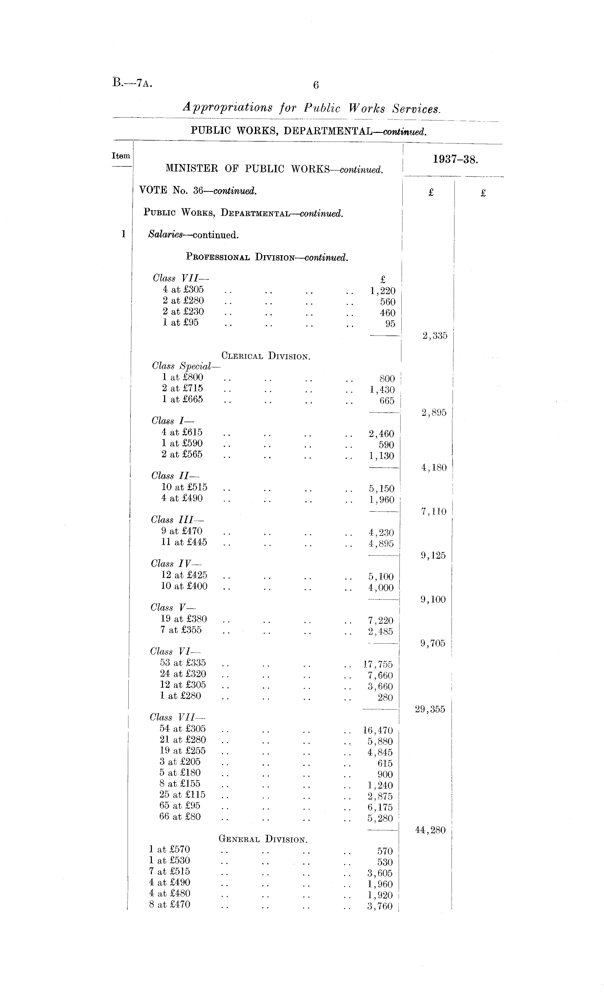 item 1937—38 MINISTER OP PUBLIC WORKS—continued. ' VOTE No. 36—continued. £ £ Public Works, Departmental—continued. 1 Salaries—continued. Professional Division—continued. Class VII— £ 4 at £305 .. .. .. .. 1,220 2 at £280 .. .. .. .. 560 2 at £230 .. .. .. .. 460 1 at £95 .. .. .. .. 95 2,335 Clerical Division. Class Special— 1 at £800 .. .. .. 800 2 at £715 .. .. .. .. 1,430 ! 1 at £665 .. .. .. .. 665 2,895 Class I— 4 at £615 .. .. .. .. 2,460 1 at £590 .. .. .. .. 590 2 at £565 .. .. .. .. l,130 — 4,180 Class II— 10 at £515 .. .. .. .. 5,150 4 at £490 .. .. .. .. 1,960 7,110 Class III— 9 at £470 .. .. .. .. 4,230 11 at £445 .. .. .. .. 4,895 9,125 Class IV— 12 at £425 .. .. .. .. 5,100 10 at £400 .. .. .. .. 4,000 9,100 Class V— 19 at £380 .. .. .. .. 7,220 7 at £355 .. .. .. .. 2^485 — 9,705 Class VI— 53 at £335 .. .. .. .. 17,755 24 at £320 .. .. .. .. 7,660 12 at £305 .. .. .. .. 3,660 1 at £280 .. .. .. .. 280 29,355 Class VII— 54 at £305 .. .. .. .. 16,470 21 at £280 .. .. .. 19 at £255 .. .. .. .. 4,845 3 at £205 .. .. .. .. '615 5 at £180 .. .. .. .. 900 8 at £155 .. .. .. .. 1,240 25 at £115 .. .. .. .. 2^875 65 at £95 .. .. .. .. 6,175 66 at £80 .. .. .. .. 5^80 44,280 General Division. 1 at £570 .. .. .. .. 570 1 at £530 .. .. .. .. 530 7 at £515 .. .. .. .. 3,605 4 at £490 .. .. .. .. \,960 4 at £480 .. .. .. .. 1'920 8 at £470 .. .. .. .. 3'760