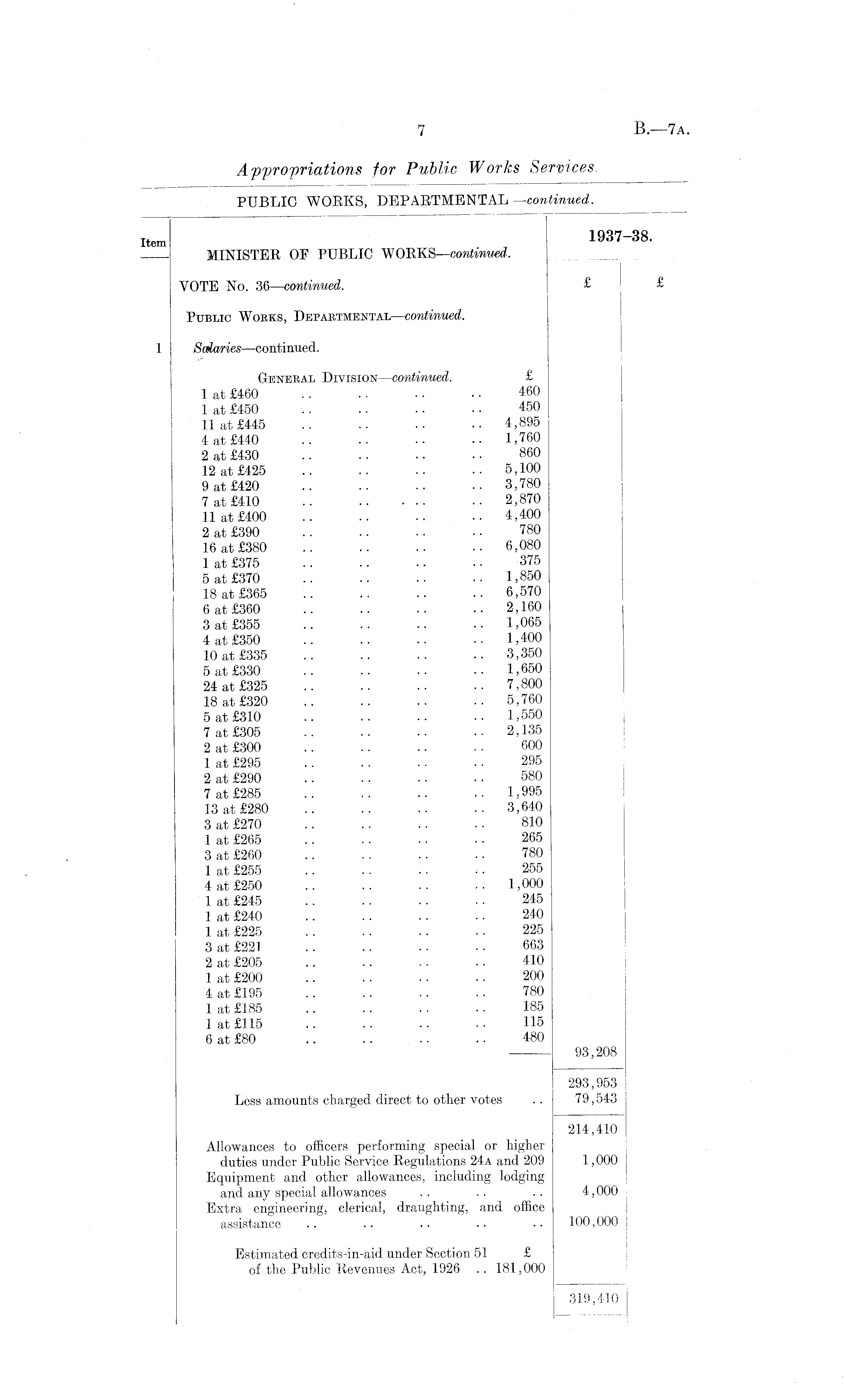 It em 1937-38. MINISTER OF PUBLIC WORKS—continued. VOTE No. 36—continued. £ £ Public Works, Departmental—continued. 1 Salaries —continued. General Division —continued. £ 1 at £460 .. .. ■ • • • 460 1 at £450 .. • • ■ • • ■ 450 11 at £445 .. .. •• •• 4,895 4 at £440 .. .. .. .. 1,760 2 at £430 .. .. • • •• 860 12 at £425 .. .. .. .. 5,100 9 at £420 .. .. .. .. 3,780 7 at £410 .. •• 2,870 11 at £400 .. .. •• 4,400 2 at £390 .. .. .. •• 780 16 at £380 .. .. .. .. 6,080 1 at £375 .. .. .. 375 5 at £370 .. .. .. .. 1,850 18 at £365 .. .. .. .. 6,570 6 at £360 .. .. •• •• 2,160 3 at £355 .. .. .. .. 1,065 4 at £350 .. .. .. 1,400 10 at £335 .. .. .. •• 3,350 5 at £330 .. .. .. •• 1,650 24 at £325 .. .. .. •• 7,800 18 at £320 .. .. .. .. 5,760 5 at £310 .. .. •• ■■ 1,550 7 at £305 .. .. .. .. 2,135 2 at £300 .. .. • • • • 600 1 at £295 .. .. .. • • 295 2 at £290 .. .. .. .. 580 7 at £285 .. .. .. .. 1,995 13 at £280 .. .. .. .. 3,640 3 at £270 .. .. .. •• 810 1 at £265 .. .. .. • • 265 3 at £260 .. .. • • •• 780 1 at £255 .. .. .. •• • 255 4 at £250 .. .. .. .. 1,000 1 at £245 .. .. . . • ■ 245 1 at £240 .. .. .. • • 240 1 at £225 .. .. .. • • 225 3 at £221 663 2 at £205 .. .. .. • • 410 1 at £200 .. .. ■• ■• 200 4 at £195 .. .. .. •• 780 1 at £185 .. .. ■. •■ 185 1 at £115 .. .. .. ■• 115 6 at £80 .. .. •. •• 480 93,208 293,953 Less amounts charged direct to other votes .. 79,543 214,410 Allowances to officers performing special or higherduties under Public Service Regulations 24a and 209 1,000 Equipment and other allowances, including lodging and any special allowances . . .. . . 4,000 Extra engineering, clerical, draughting, and office assistance .. .. .. •• •• 100,000 Estimated credits-in-aid under Section 51 £ of the Public Revenues Act, 1926 .. 181,000 319,410