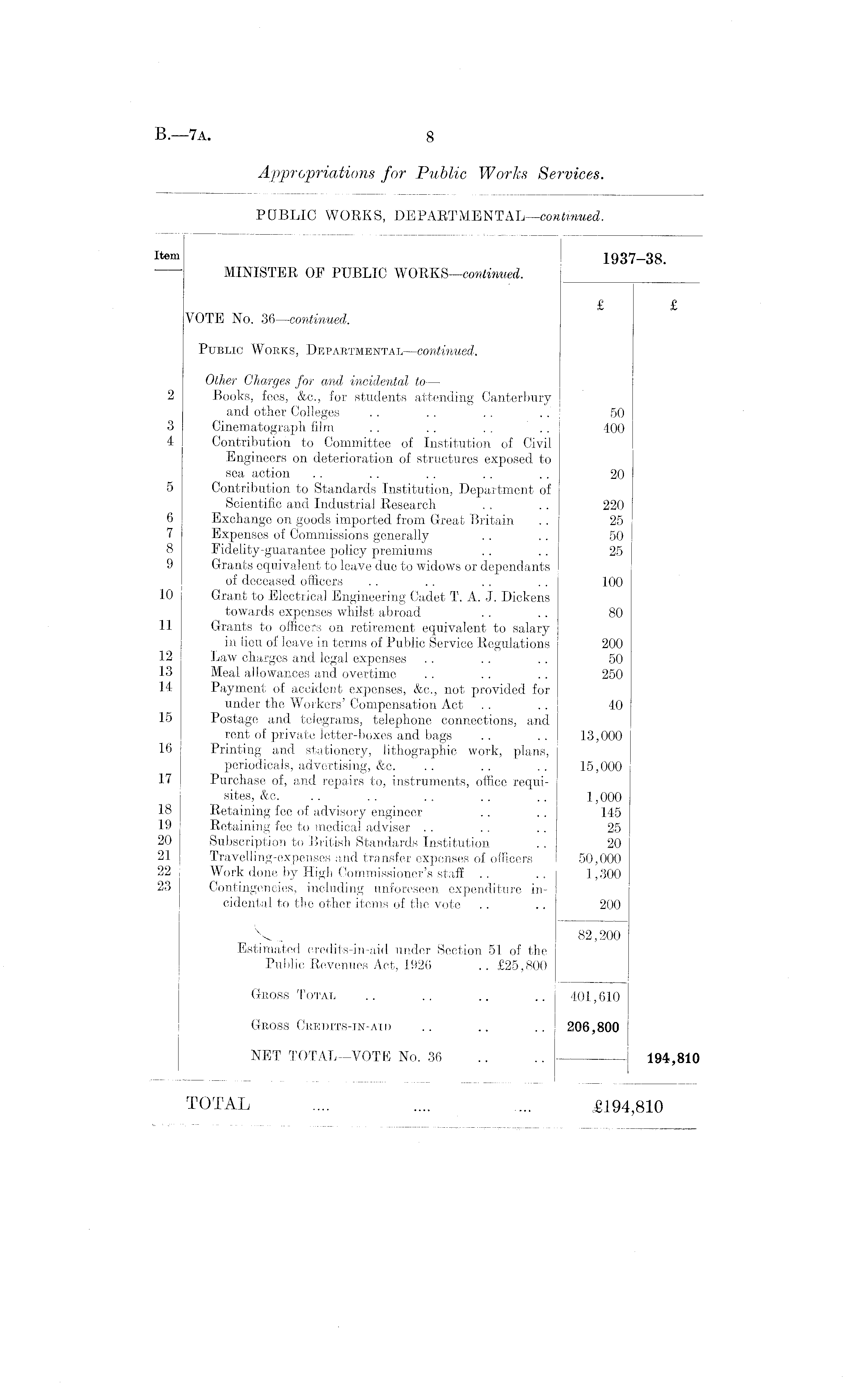 Item 1937-38. — MINISTER OF PUBLIC WORES —continued. £ £ VOTE No. 36 —continued. Public Works, Departmental—continued. Other Charges for and incidental to - 2 Books, fees, &c., for students attending Canterbury and other Colleges .. .. . . .. 50 3 Cinematograph film . . . . . . .. 400 4 Contribution to Committee of Institution of Civil Engineers on deterioration of structures exposed to sea action .. . . .. . . . . 20 5 Contribution to Standards Institution, Department of Scientific and Industrial Research . . . . 220 6 Exchange on goods imported from Great Britain .. 25 7 Expenses of Commissions generally .. .. 50 8 Fidelity-guarantee policy premiums .. .. 25 9 Grants equivalent to leave due to widows or dependants of deceased officers .. . . .. .. 100 10 Grant to Electrical Engineering Cadet T. A. J. Dickens towards expenses whilst abroad . . . . 80 11 Grants to officers on retirement equivalent to salary in lieu of leave in terms of Public Service Regulations 200 12 Law charges and legal expenses .. . . .. 50 13 Meal allowances and overtime .. .. .. 250 14 Payment of accident expenses, &c., not provided for under the Workers' Compensation Act .. .. 40 15 Postage and telegrams, telephone connections, and rent of private letter-boxes and bags .. .. 13,000 16 Printing and stationery, lithographic work, plans, periodicals, advertising, &c. .. .. .. 15,000 17 Purchase of, and repairs to, instruments, office requisites, &c. .. .. .. .. .. 1,000 18 Retaining fee of advisory engineer .. .. 14-5 19 Retaining fee to medical adviser . . .. .. 25 20 Subscription to British Standards Institution . . 20 21 Travelling-expenses and transfer expenses of officers 50,000 22 Work done by High Commissioner's staff .. .. 1,300 23 Contingencies, including unforeseen expenditure incidental to the other items of the vote .. .. 200 V- 82,200 Estimated credits-in-aid under Section 51 of the Public Revenues Act, 1926 .. £25,800 Gross Total .. .. .. .. 401,610 Gross Credits-in-aid .. .. .. 206,800 NET TOTAL—VOTE No. 36 .. .. 194,810 TOTAL .... .... .... ,£194,810