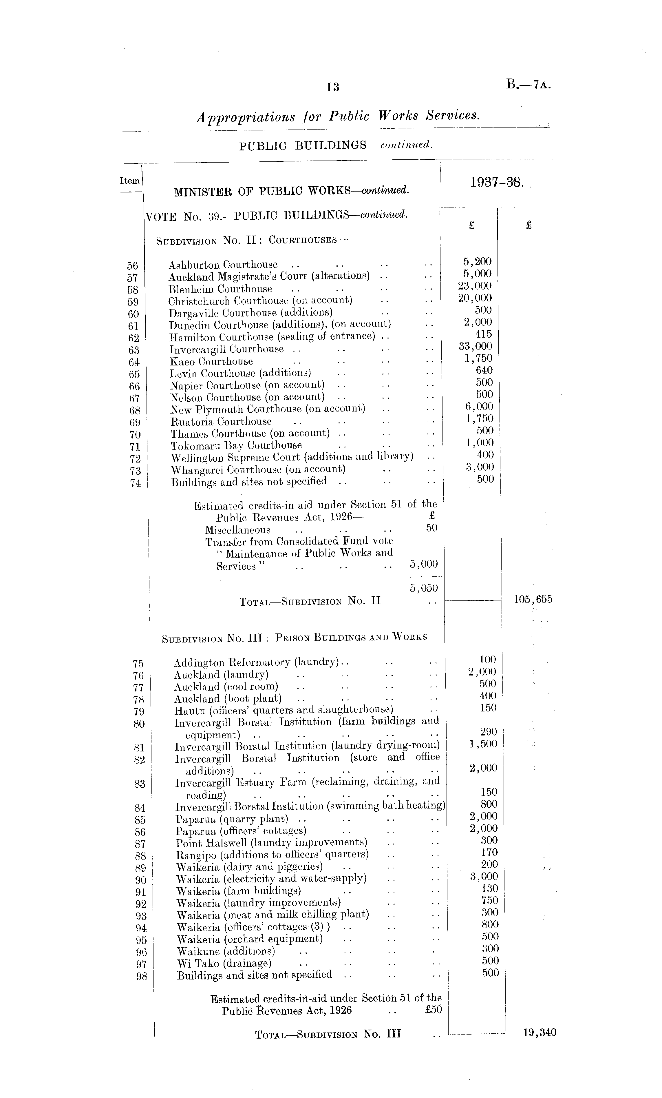 Item 1937-38 MINISTER OF PUBLIC WORKS—continued. VOTE No. 39. —PUBLIC BUILDINGS —continued. £ £ Subdivision No. II: Courthouses— 56 Ashburton Courthouse .. •• •• 5,200 57 Auckland Magistrate's Court (alterations) .. .. 5,000 58 Blenheim Courthouse .. •• •• 23,000 59 Christchurch Courthouse (on account) .. •• 20,000 60 Dargaville Courthouse (additions) • • • • 500 61 Dunedin Courthouse (additions), (on account) .. 2,000 62 Hamilton Courthouse (sealing of entrance) .. ■ • 415 63 Invercargill Courthouse .. •• •• •• 33,000 64 Kaeo Courthouse . . • • • • ■ • 1»750 65 Levin Courthouse (additions) . . • ■ ■ • 640 66 Napier Courthouse (on account) .. ■ • • • 500 67 Nelson Courthouse (on account) . . • • • • 500 68 New Plymouth Courthouse (on account) .. 6,000 69 Ruatoria Courthouse .. ■ ■ • • ■ • 1 > 750 70 Thames Courthouse (on account) . . ■ ■ ■ • 500 71 Tokomaru Bay Courthouse .. •• 1,000 72 1 Wellington Supreme Court (additions and library) . . 400 73 Whangarei Courthouse (on account) .. •• 3,000 74 Buildings and sites not specified . . . . ■ • 500 Estimated credits-in-aid under Section 51 of the Public Revenues Act, 1926— £ Miscellaneous . • • • • • 50 Transfer from Consolidated Fund vote " Maintenance of Public Works and Services" .. •• •• 5,000 5,050 Total —Subdivision No. II .. 105,655 I • ~ ' Subdivision No. Ill: Prison Buildings and Works — 75 Addington Reformatory (laundry).. .. • • 100 76 Auckland (laundry) . . ■ ■ • • ■ • 2,000 77 Auckland (cool room) . . • • ■ • • ■ 500 78 Auckland (boot plant) . . . • • • ■ • 400 79 Hautu (officers' quarters and slaughterhouse) . . 150 80 Invercargill Borstal Institution (farm buildings and equipment) .. .. ■ • ■ • • • 290 81 Invercargill Borstal Institution (laundry drying-room) 1,500 82 Invercargill Borstal Institution (store and office additions) .. •• 2,000 83 Invercargill Estuary Farm (reclaiming, draining, and roading) •• •• •• 150 84 Invercargill Borstal Institution (swimming bath heating) 800 85 Paparua (quarry plant) .. .. .. •• 2,000 86 Paparua (officers' cottages) . . • • • • 2,000 87 ! Point Halswell (laundry improvements) . . . • 300 88 ' Rangipo (additions to officers' quarters) . . • • 170 89 I Waikeria (dairy and piggeries) .. . . • • 200 90 Waikeria (electricity and water-supply) .. .. 3,000 91 Waikeria (farm buildings) .. ■ ■ ■ • 130 92 Waikeria (laundry improvements) . . ■ • 750 93 Waikeria (meat and milk chilling plant) . . . . 300 94 Waikeria (officers' cottages (3) ) . . . ■ • • 800 95 Waikeria (orchard equipment) . . . . ■ • 500 96 Waikune (additions) .. • • ■ ■ • • 300 97 Wi Tako (drainage) .. ■ • • • • ■ 500 98 Buildings and sites not specified .. .. ■ ■ 500 Estimated credits-in-aid under Section 51 of the Public Revenues Act, 1926 .. £50 Total —Subdivision No. Ill .. 1 19,340