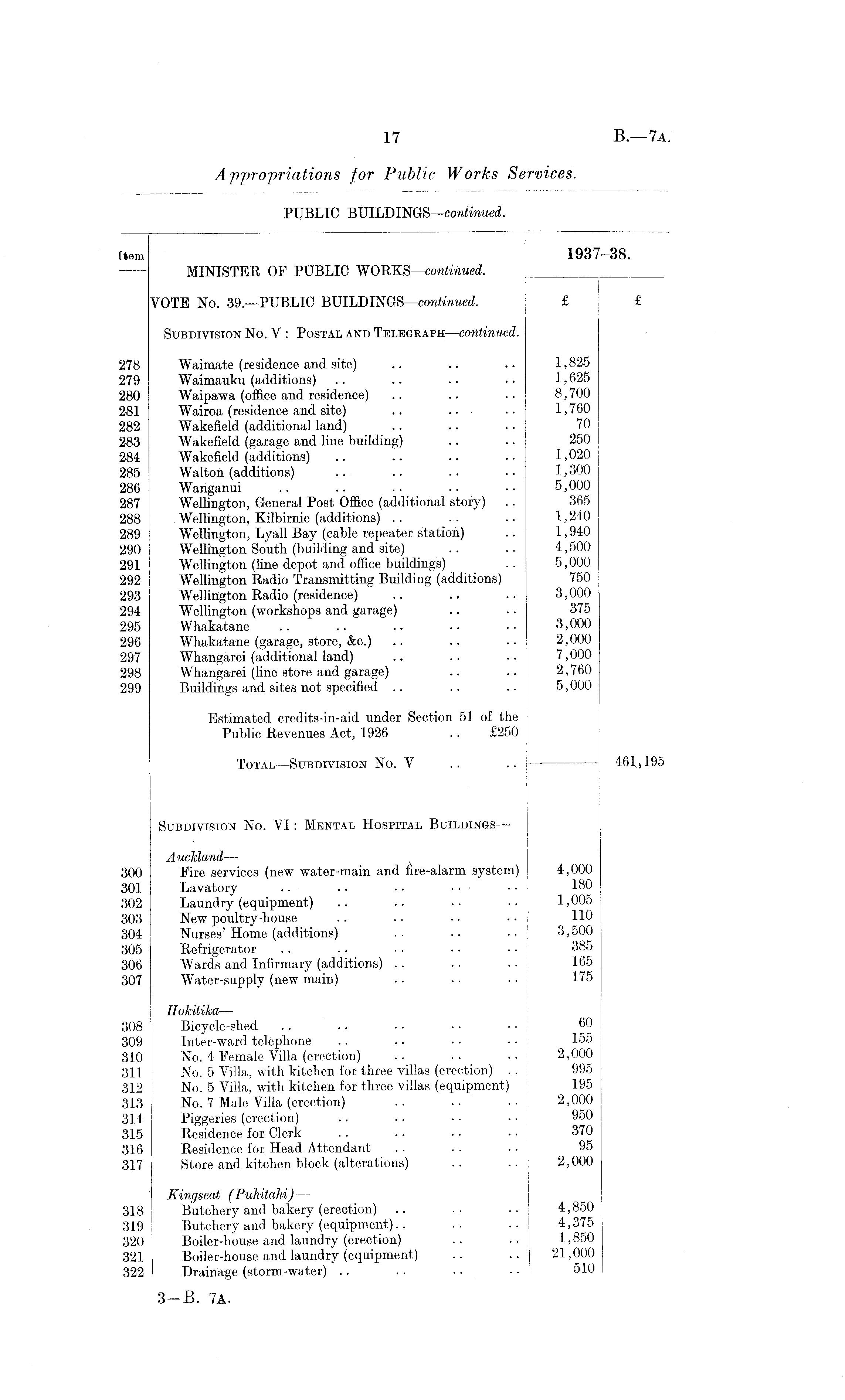Item 1937-38. MINISTER OP PUBLIC WORKS -continued. VOTE No. 39.—PUBLIC BUILDINGS —continued. £ £ Subdivision No. V : Postal and Telegraph—continued. 278 Waimate (residence and site) .. .. .. 1,825 279 Waimauku (additions) .. .. .. •• 1,625 280 Waipawa (office and residence) .. .. •• 8,700 281 Wairoa (residence and site) .. .. •• 1,760 282 Wakefield (additional land) .. .. . ■ 70 283 Wakefield (garage and line building) .. .. 250 284 Wakefield (additions) .. .. .. •• 1,020 285 Walton (additions) .. .. .. ■ • 1,300 286 Wanganui .. .. .. •• •• 5,000 287 Wellington, General Post Office (additional story) .. 365 288 Wellington, Kilbirnie (additions) .. .. .. 1,240 289 Wellington, Lyall Bay (cable repeater station) .. 1,940 290 Wellington South (building and site) .. .. 4,500 291 Wellington (line depot and office buildings) .. 5,000 292 Wellington Radio Transmitting Building (additions) 750 293 Wellington Radio (residence) .. .. .. 3,000 294 Wellington (workshops and garage) .. .. 375 295 Whakatane .. .. •• •• •• 3,000 296 Whakatane (garage, store, &c.) .. .. 2,000 297 Whangarei (additional land) .. .. .. 7,000 298 Whangarei (line store and garage) .. .. 2,760 299 Buildings and sites not specified .. .. .. 5,000 Estimated credits-in-aid under Section 51 of the Public Revenues Act, 1926 .. £250 Total —Subdivision No. Y .. .. 461., 195 Subdivision No. VI: Mental Hospital Buildings— Auckland — 300 Fire services (new water-main and fire-alarm system) 4,000 301 Lavatory .. .. • • ■ ■ • • 180 302 Laundry (equipment) .. .. •• •• 1,005 303 New poultry-house .. . ■ • • • • i 110 304 Nurses' Home (additions) .. • ■ • • i 3,500 305 Refrigerator .. .. • • • • • • 385 306 Wards and Infirmary (additions) . . .. .. j 165 307 Water-supply (new main) . . • • • ■ 175 Hokitika — ! 308 Bicycle-shed .. .. • ■ • • • • I 60 309 Inter-ward telephone .. .. ■ ■ • • 155 310 No. 4 Female Villa (erection) .. .. •• 2,000 311 No. 5 Villa, with kitchen for three villas (erection) . . 1 995 312 No. 5 Villa, with kitchen for three villas (equipment) 195 313 No. 7 Male Villa (erection) .. • • • • 2,000 314 Piggeries (erection) .. • • • ■ ■ ■ 950 315 Residence for Clerk .. .. .. • • 370 316 Residence for Head Attendant .. .. • ■ 95 317 Store and kitchen block (alterations) .. .. 2,000 1 King seat (Puhitahi) — 318 Butchery and bakery (erection) .. •• 4,850 319 Butchery and bakery (equipment).. .. .. 4,375 320 Boiler-house and laundry (erection) . . • • 1,850 321 Boiler-house and laundry (equipment) .. .. 21,000 322 Drainage (storm-water) . . .. • • • • 510
