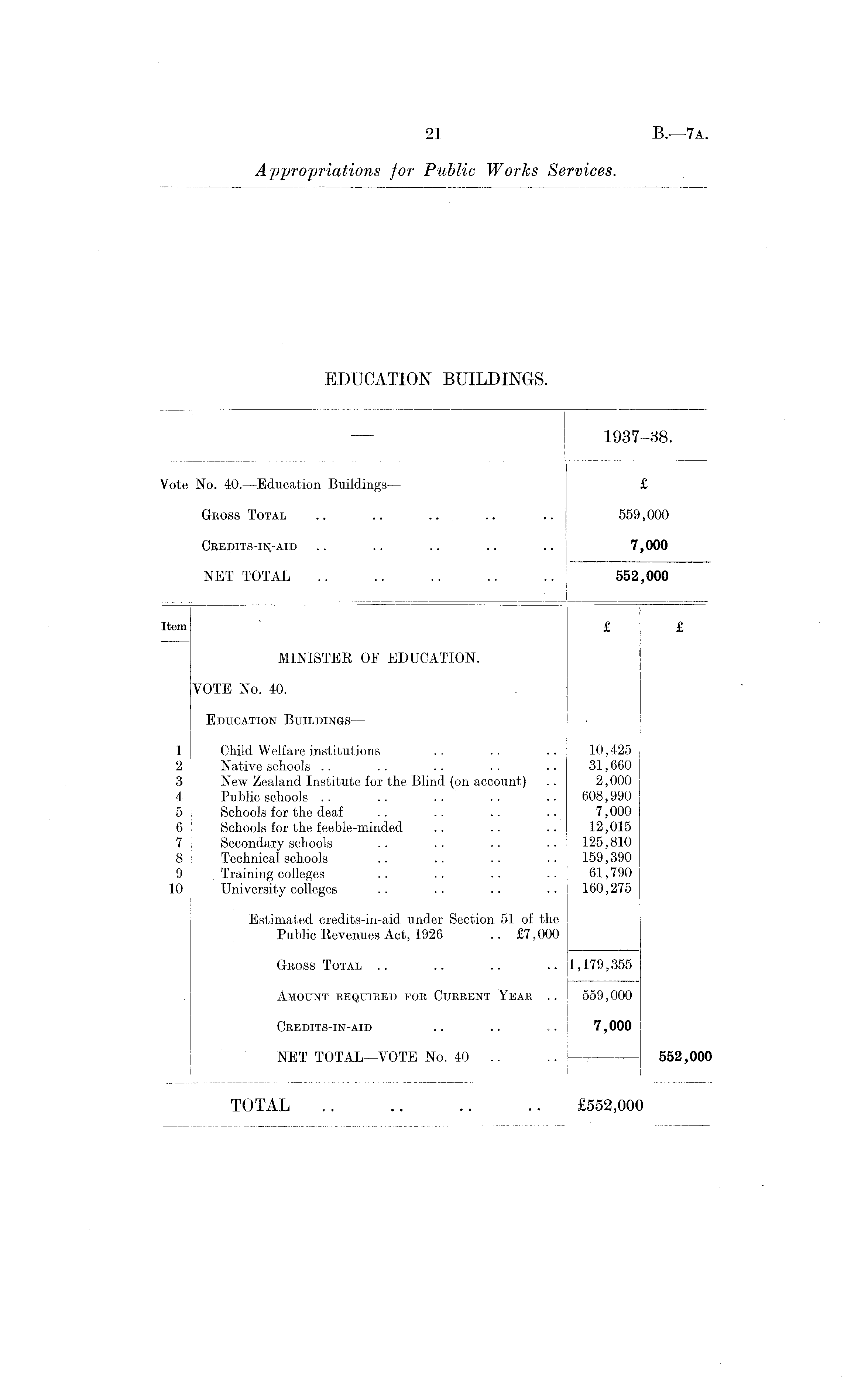 — 1937-38. Vote No. 40.—Education Buildings— £ GROSS TOTAL .. .. .. .. .. 559,000 .. .. .. .. .. 7,000 NET TOTAL 552,000 Item £ £ MINISTER OE EDUCATION. VOTE No. 40. Education Buildings— 1 Child Welfare institutions .. .. .. 10,425 2 Native schools .. .. .. .. .. 31,660 3 New Zealand Institute for the Blind (on account) .. 2,000 4 Public schools .. .. .. .. .. 608,990 5 Schools for the deaf . . .. .. .. 7,000 6 Schools for the feeble-minded .. .. .. 12,015 7 Secondary schools .. .. .. .. 125,810 8 Technical schools .. .. .. . • 159,390 9 Training colleges .. .. .. .. 61,790 10 University colleges .. .. .. .. 160,275 Estimated credits-in-aid under Section 51 of the Public Revenues Act, 1926 .. £7,000 GROSS Total .. .. .. .. 1,179,355 Amount required for Current Year .. 559,000 Credits-in-aid .. .. .. 7,000 NET TOTAL—VOTE No. 40 .. .. — r — 552,000 TOTAL . . .. .. .. £552,000