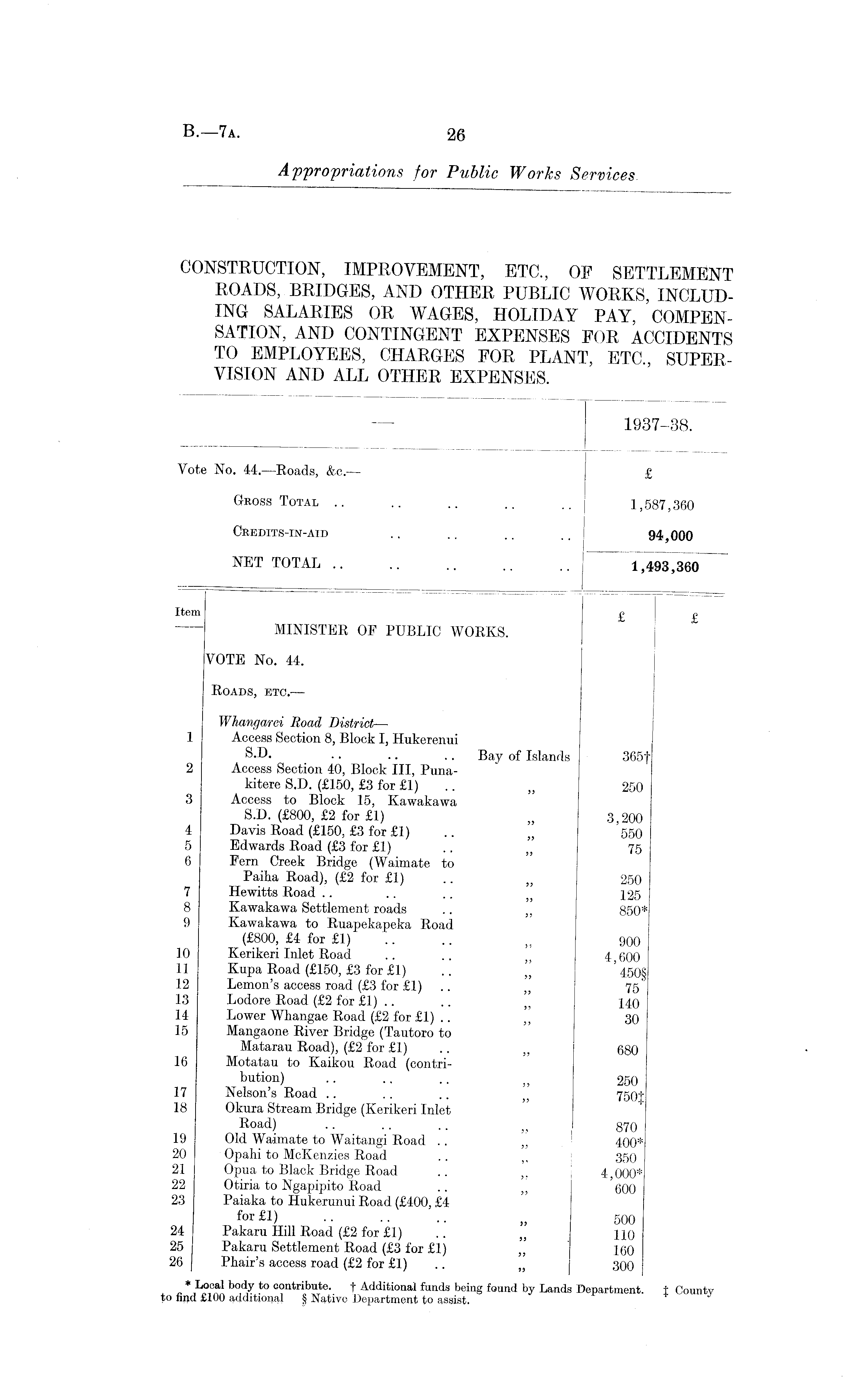 — 1937-38. Vote No. 44. —Roads, &c.— £ GROSS TOTAL .. .. .. .. .. 1,587,360 Credits-in-AID .. .. .. .. 94,000 NET TOTAL 1,493,360 Item £ £ MINISTER OP PUBLIC WORKS. VOTE No. 44. Roads, etc. — Whangarei Road District— 1 Access Section 8, Block I, Hukerenui S-D. .. .. .. Bay of Islands 365f 2 Access Section 40, Block III, Punakitere S.D. (£150, £3 for £1) .. „ 250 3 Access to Block 15, Kawakawa S.D. (£800, £2 for £1) „ 3,200 4 Davis Road (£150, £3 for £1) .. „ 550 5 Edwards Road (£3 for £1) .. j; 75 6 Fern Creek Bridge (Waimate to Paiha Road), (£2 for £1) .. „ 250 7 Hewitts Road .. .. .. 125 8 Kawakawa Settlement roads .. ,, 850* 9 Kawakawa to Ruapekapeka Road (£800, £4 for £1) .. .. n 900 10 Kerikeri Inlet Road .. .. „ 4 600 11 Kupa Road (£150, £3 for £1) .. ' 450§ 12 Lemon's access road (£3 for £1) .. „ 75" 13 Lodore Road (£2 for £1) .. .. " 140 14 Lower Whangae Road (£2 for £1) .. 30 15 Mangaone River Bridge (Tautoro to Matarau Road), (£2 for £1) .. ' 680 16 Motatau to Kaikou Road (contribution) .. .. .. „ 250 17 Nelson's Road .. . . .. ;; 750J 18 Oknra Stream Bridge (Kerikeri Inlet Road) .. .. .. I 870 19 Old Waimate to Waitangi Road . . „ 400* 20 Opahi to McKenzies Road .. ,, 350 21 Opua to Black Bridge Road .. 4 000* 22 Otiria to Ngapipito Road .. 600 23 Paiaka to Hukerunui Road (£400, £4 for £1) .. .. .. 500 24 Pakaru Hill Road (£2 for £1) .. " HO 25 Pakaru Settlement Road (£3 for £1) 160 26 Phair's access road (£2 for £1) „ 300 * Local body to contribute. f Additional funds being found by Lands Department. t County to find £100 additional § Native Department to assist.