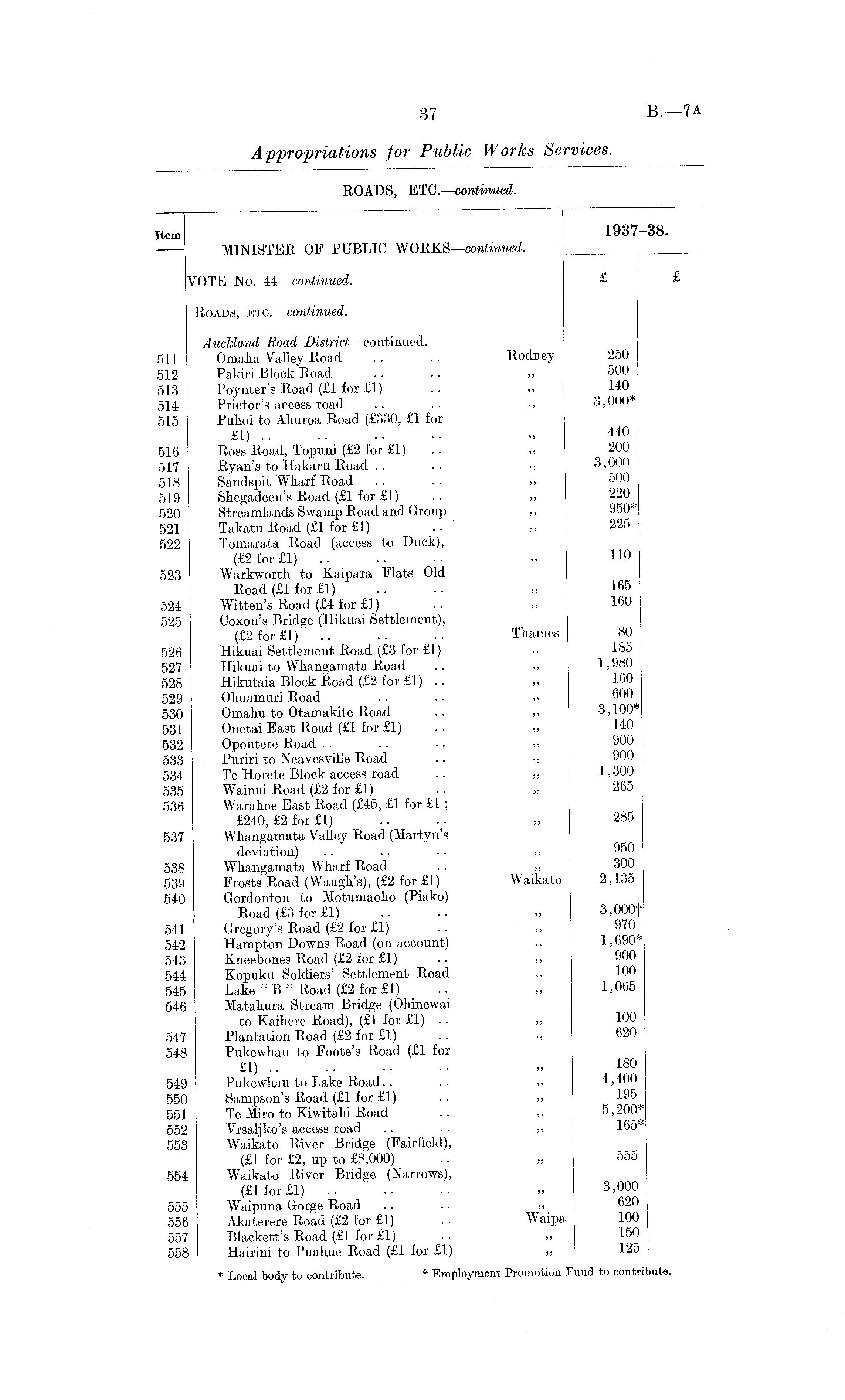Item 1937-38. MINISTER OF PUBLIC WORKS —continued. VOTE No. 44 —continued. £ £ Roads, etc. —continued. Auckland Road District —continued. 511 Omaha Valley Road .. .. Rodney 250 512 Pakiri Block Road .. .. >> 500 513 Poynter's Road (£1 for £1) .. » 140 514 Prictor's access road .. .. >> 3,000* 515 Puhoi to Aliuroa Road (£330, £1 for £1) .. .. .. 516 Ross Road, Topuni (£2 for £1) .. „ 200 517 Ryan's to Hakaru Road .. .. „ 3,000 518 Sandspit Wharf Road .. .. ,> 500 519 Shegadeen's Road (£1 for £1) .. >, 220 520 Streamlands Swamp Road and Group „ 950* 521 Takatu Road (£1 for £1) . • „ 225 522 Tomarata Road (access to Duck), (£2 for £1) „ 110 523 Warkworth to Kaipara Flats Old Road (£1 for £1) .. .. „ 165 524 Witten's Road (£4 for £1) . • >, 160 525 Coxon's Bridge (Hikuai Settlement), (£2 for £1) .. .. • ■ Thames 80 526 Hikuai Settlement Road (£3 for £1) ,, 185 527 Hikuai to Whangamata Road .. „ 1,980 528 Hikutaia Block Road (£2 for £1) .. „ 160 529 Ohuamuri Road .. .. » 600 530 Omahu to Otamakite Road .. ,, 3,100* 531 Onetai East Road (£1 for £1) .. >> HO 532 Opoutere Road . . .. .. » 900 533 Puriri to Neavesville Road .. ,, 900 534 Te Horete Block access road .. „ 1,300 535 Wainui Road (£2 for £1) .. „ 265 536 Warahoe East Road (£45, £1 for £1 ; £240, £2 for £1) .. .. „ 285 537 Whangamata Valley Road (Martyn's deviation) .. .. • • >> 950 538 Whangamata Wharf Road .. „ 300 539 Frosts Road (Waugh's), (£2 for £1) Waikato 2,135 540 Gordonton to Motumaoho (Piako) Road (£3 for £1) .. .. „ 3,000f 541 Gregory's Road (£2 for £1) .. >> 970 542 Hampton Downs Road (on account) ,, 1,690* 543 Kneebones Road (£2 for £1) .. ,, 900 544 Kopuku Soldiers' Settlement Road „ 100 545 Lake " B" Road (£2 for £1) .. „ 1,065 546 Matahura Stream Bridge (Ohinewai to Kaihere Road), (£1 for £1) .. ,, 100 547 Plantation Road (£2 for £1) .. „ 620 548 Pukewhau to Foote's Road (£1 for £1) » 180 549 Pukewhau to Lake Road.. .. ,, 4,400 550 Sampson's Road (£1 for £1) .. ,, 195 551 Te Miro to Kiwitahi Road .. „ 5,200* 552 Vrsaljko's access road .. • • „ 165* 553 Waikato River Bridge (Fairfield), (£1 for £2, up to £8,000) .. » 555 554 Waikato River Bridge (Narrows), (£1 for £1) .. .. » 3,000 555 Waipuna Gorge Road .. .. » 620 556 Akaterere Road (£2 for £1) .. Waipa 100 557 Blackett's Road (£1 for £1) .. „ 150 558 Hairini to Puahue Road (£1 for £1) „ 125 * Local body to contribute. t Employment Promotion Fund to contribute.