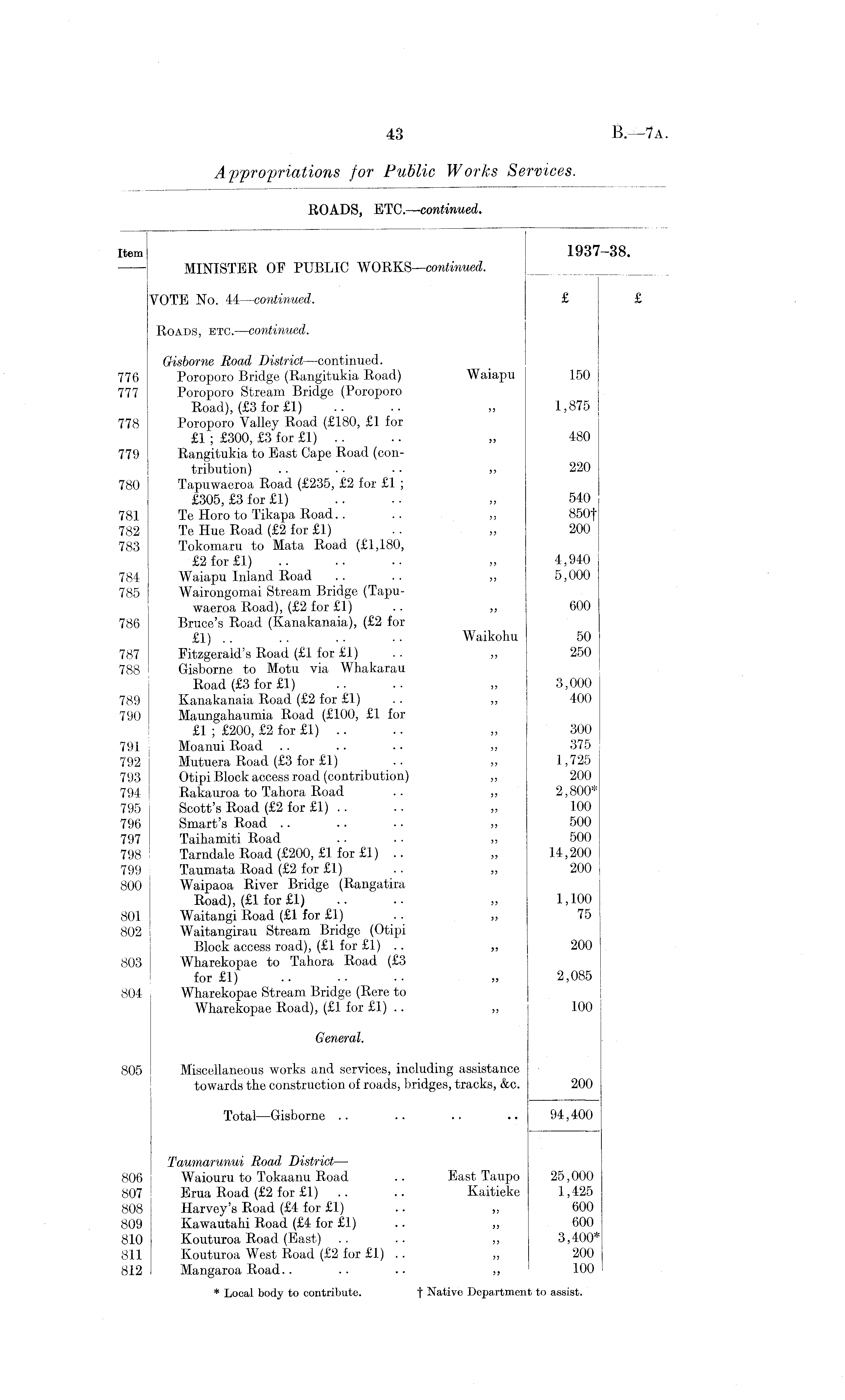 Item 1937—38. MINISTER OF PUBLIC WORKS —continued. VOTE No. 44 —continued. £ £ Roads, etc. —continued. Gisborne Road District —continued. 776 Poroporo Bridge (Rangitukia Road) Waiapu 150 777 Poroporo Stream Bridge (Poroporo Road), (£3 for £1) .. .. „ 1,875 778 Poroporo Valley Road (£180, £1 for £1 ; £300, £3 for £1) .. .. „ 480 779 Rangitukia to East Gape Road (contribution) .. . ■ • • „ 220 780 Tapuwaeroa Road (£235, £2 for £1 ; £305, £3 for £1) .. . • „ 54-0 781 Te Horo to Tikapa Road.. .. „ 850j 782 Te Hue Road (£2 for £1) .. ,, 200 783 Tokomaru to Mata Road (£1,180, £2 for £1) .. .. .. „ 4,940 784 Waiapu Inland Road .. .. ,, 5,000 785 Wairongomai Stream Bridge (Tapuwaeroa Road), (£2 for £1) .. ,, 600 786 Bruce's Road (Kanakanaia), (£2 for £1) .. .. . . .. Waikohu 50 787 Fitzgerald's Road (£1 for £1) .. ,, 250 788 Gisborne to Motu via Whakarau Road (£3 for £1) .. .. „ 3,000 789 Kanakanaia Road (£2 for £1) • • ,, 400 790 Maungahaumia Road (£100, £1 for £1 ; £200, £2 for £1) .. .. „ 300 791 Moanui Road .. .. . • >> 375 792 Mutuera Road (£3 for £1) .. ,, 1,725 793 Otipi Block access road (contribution) „ 200 794 Rakauroa to Tahora Road .. ,, 2,800* 795 Scott's Road (£2 for £1) .. .. „ 100 796 Smart's Road .. .. • • ,, 500 797 Taihamiti Road .. . • ,, 500 798 Tarndale Road (£200, £1 for £1) .. „ 14,200 799 Taumata Road (£2 for £1) .. „ 200 800 Waipaoa River Bridge (Rangatira Road), (£1 for £1) .. .. „ 1,100 801 Waitangi Road (£1 for £1) .. ,, 75 802 Waitangirau Stream Bridge (Otipi Block access road), (£1 for £1) .. ,, 200 803 Wharekopae to Tahora Road (£3 for £1) .. •• •■ „ 2,085 804 Wharekopae Stream Bridge (Rere to Wharekopae Road), (£1 for £1) .. „ 100 General. 805 Miscellaneous works and services, including assistance towards the construction of roads, bridges, tracks, &c. 200 Total —Gisborne .. .. .. .. 94,400 Taumarunui Road District— 806 Waiouru to Tokaanu Road .. East Taupo 25,000 807 Erua Road (£2 for £1) .. .. Kaitieke 1,425 808 Harvey's Road (£4 for £1) .. ,, 600 809 Kawautahi Road (£4 for £1) .. ,, 600 810 Kouturoa Road (East) .. .. ,, 3,400* 811 Kouturoa West Road (£2 for £1) .. ,, 200 812 Mangaroa Road.. .. .. ,, 100 * Local body to contribute. t Native Department to assist.