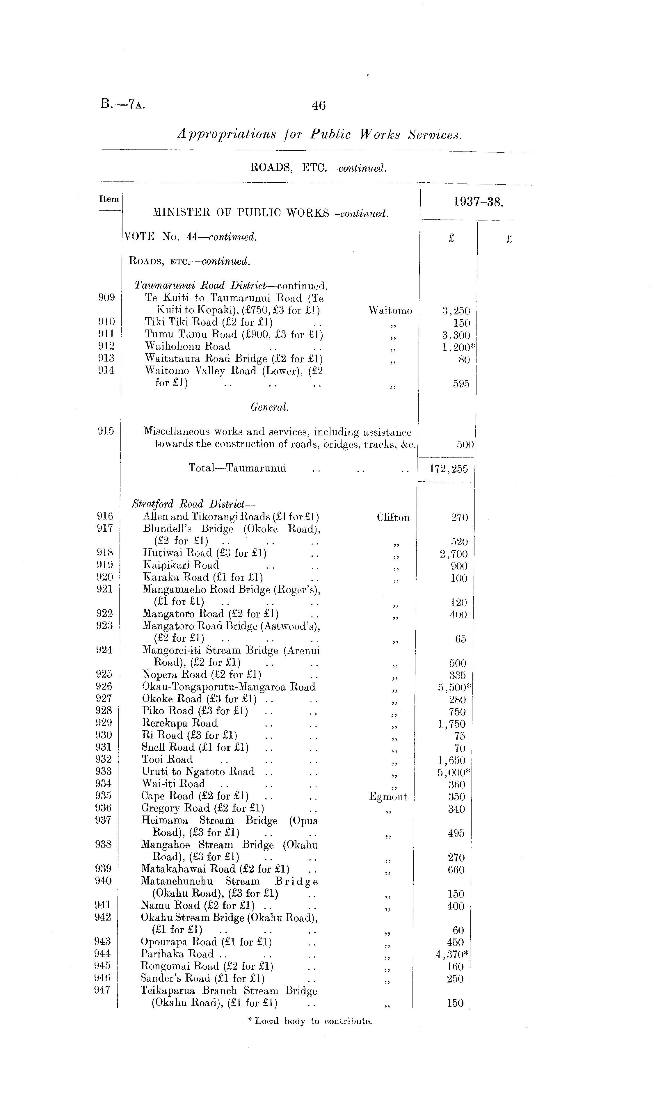 Item 1937—38 MINISTER OF PUBLIC WORKS—continued. VOTE No. 44—continued. £ £ Roads, etc. —continued. Taumarunui Road District—continued. 909 Te Kuiti to Taumarunui Road (Te Kuiti to Kopaki), (£750, £3 for £1) Waitomo 3,250 910 Tiki Tiki Road (£2 for £1) .. ,, 150 911 Tumu Tumu Road (£900, £3 for £1) ,, 3,300 912 Waihohonu Road .. .. „ 1,200* 913 Waitataura Road Bridge (£2 for £1) „ 80 914 Waitomo Valley Road (Lower), (£2 for £1) .. .. .. „ 595 General. 915 Miscellaneous works and services, including assistance towards tie construction of roads, bridges, tracks, &c. 500 Total —Taumarunui .. .. .. 172,255 Stratford Road District — 916 Allen and Tikorangi Roads (£1 for £1) Clifton 270 917 Blundell's Bridge (Okoke Road), (£2 for £1) .. .. „ 520 918 Hutiwai Road (£3 for £1) .. ,, 2,700 919 Kaipikari Road .. . . ,, 900 920 Karaka Road (£1 for £1) .. ,, 100 921 Mangamaeho Road Bridge (Roger's), (£1 for £1) .. .. .. ,, 120 922 Mangatoro Road (£2 for £1) .. „ 400 923 Mangatoro Road Bridge (Astwood's), (£2 for £1) „ 65 924 Mangorei-iti Stream Bridge (Arenui Road), (£2 for £1) .. .. „ 500 925 Nopera Road (£2 for £1) . . ,, 335 926 Okau-Tongaporutu-Mangaroa Road „ 5,500* 927 Okoke Road (£3 for £1) .. .. ,, 280 928 Piko Road (£3 for £1) .. .. ,, 750 929 Rerekapa Road .. .. ,, 1,750 930 Ri Road (£3 for £1) .. .. ,, 75 931 Snell Road (£1 for £1) .. „ 70 932 TooiRoad .. .. .. „ 1,650 933 Uruti to Ngatoto Road .. .. „ 5,000* 934 Wai-iti Road .. .. .. ,, 360 935 Cape Road (£2 for £1) .. .. Egmont 350 936 Gregory Road (£2 for £1) .. ,, 340 937 Heimama Stream Bridge (Opua Road), (£3 for £1) .. .. ,, 495 938 Mangahoe Stream Bridge (Okahu Road), (£3 for £1) .. .. „ 270 939 Matakahawai Road (£2 for £1) .. „ 660 940 Matanehunehu Stream Bridge (Okahu Road), (£3 for £1) .. ,, 150 941 Narnu Road (£2 for £1) .. .. ,, 400 942 Okahu Stream Bridge (Okahu Road), (£1 for £1) „ 60 943 Opourapa Road (£1 for £1) .. ,, 450 944 Parikaka Road .. .. .. ,, 4,370* 945 Rongomai Road (£2 for £1) . . ,, 160 946 Sander's Road (£1 for £1) . . ,, 250 947 Teikaparua Branck Stream Bridge (Okahu Road), (£1 for £1) .. „ 150 * Local body to contribute.