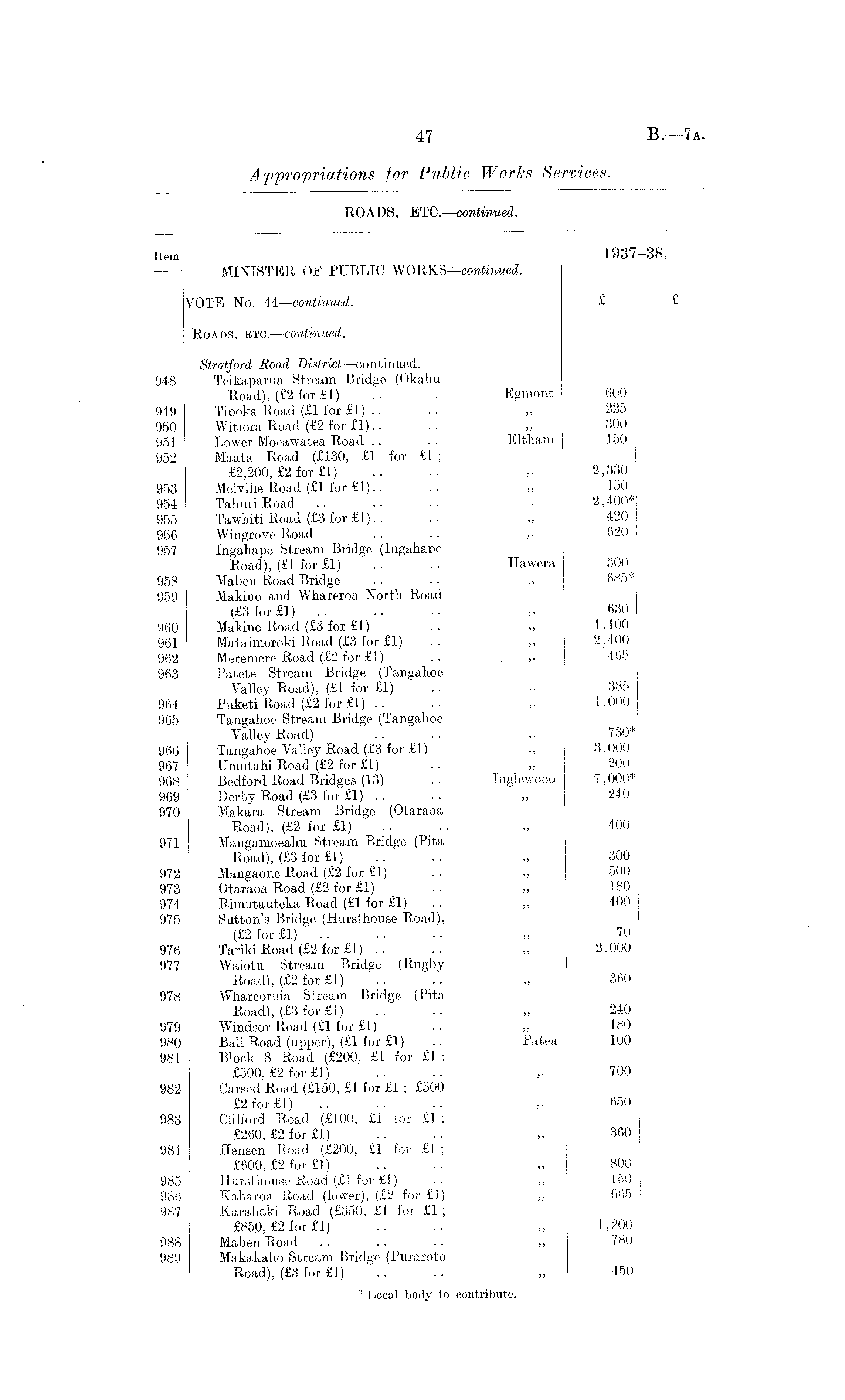 Item 1937-38. —— MINISTER OF PUBLIC WORKS—continued. VOTE No. 44 —continued. £ £ Roads, etc. —continued. Stratford Road District —continued. 948 Teikaparua Stream Bridge (Okahu Road), (£2 for £1) .. .. Egmont 600 949 Tipoka Road (£1 for £1) .. .. ,, 225 950 Witiora Road (£2 for £1).. .. „ 300 951 Lower Moeawatea Road . . .. Eltham 150 952 Maata Road (£130, £1 for £1 ; £2,200, £2 for £1) .. .. „ 2,330 953 Melville Road (£1 for £1).. .. ,, 150 954 Takuri Road .. .. ■■ »> 2,400* 955 Tawhiti Road (£3 for £1).. .. „ 420 956 Wingrove Road .. . ■ ,, 620 957 Ingahape Stream Bridge (Ingahape Road), (£1 for £1) .. .. Hawera 300 958 Maben Road Bridge .. . . ,, 685* 959 Makino and Whareroa North Road (£3 for £1) ū 630 960 Makino Road (£3 for £1) .. ,, 1,100 961 Mataimoroki Road (£3 for £1) . . ,, 2^400 962 Meremere Road (£2 for £1) .. „ 465 963 Patete Stream Bridge (Tangalioe Valley Road), (£1 for £1) .. „ 385 964 Puketi Road (£2 for £1) .. .. ,, , 1,000 965 Tangalioe Stream Bridge (Tangalioe Valley Road) . . . • h 730* 966 Tangalioe Valley Road (£3 for £1) „ 3,000 967 Umutahi Road (£2 for £1) .. ,, 200 968 Bedford Road Bridges (13) .. Inglewood 7,000* 969 Derby Road (£3 for £1) .. .. ,, 240 970 Makara Stream Bridge (Otaraoa Road), (£2 for £1) .. „ 400 971 Mangamoeahu Stream Bridge (Pita Road), (£3 for £1) . . .. „ 300 972 Mangaone Road (£2 for £1) .. ,, 500 973 Otaraoa Road (£2 for £1) .. „ 180 974 Rimutauteka Road (£1 for £1) .. ,, 400 975 Sutton's Bridge (Hursthouse Road), (£2 for £1) .. .. ■ • j) 70 976 Tariki Road (£2 for £1) .. .. „ 2,000 977 Waiotu Stream Bridge (Rugby Road), (£2 for £1) .. .. „ 360 978 Whareoruia Stream Bridge (Pita Road), (£3 for £1) .. .. „ 240 979 Windsor Road (£1 for £1) .. ,, 180 980 Ball Road (upper), (£1 for £1) .. Patea 100 981 Block 8 Road (£200, £1 for £1 ; £500, £2 for £1) .. .. „ 700 982 Carsed Road (£150, £1 for £1 ; £500 £2 for £1) .. .. „ 650 983 Clifford Road (£100, £1 for £1 ; £260, £2 for £1) .. .. „ 360 984 Hensen Road (£200, £1 for £1 ; £600, £2 for £1) .. .. „ 800 985 Hurstliouse Road (£1 for £1) .. ,, 150 986 Kaharoa Road (lower), (£2 for £1) ,, 665 j 987 Karahaki Road (£350, £1 for £1 ; £850, £2 for £1) .. .. „ 1,200 988 Maben Road .. .. .. „ 780 | 989 Makakalio Stream Bridge (Puraroto Road), (£3 for £1) .. „ 450 * Local body to contribute.