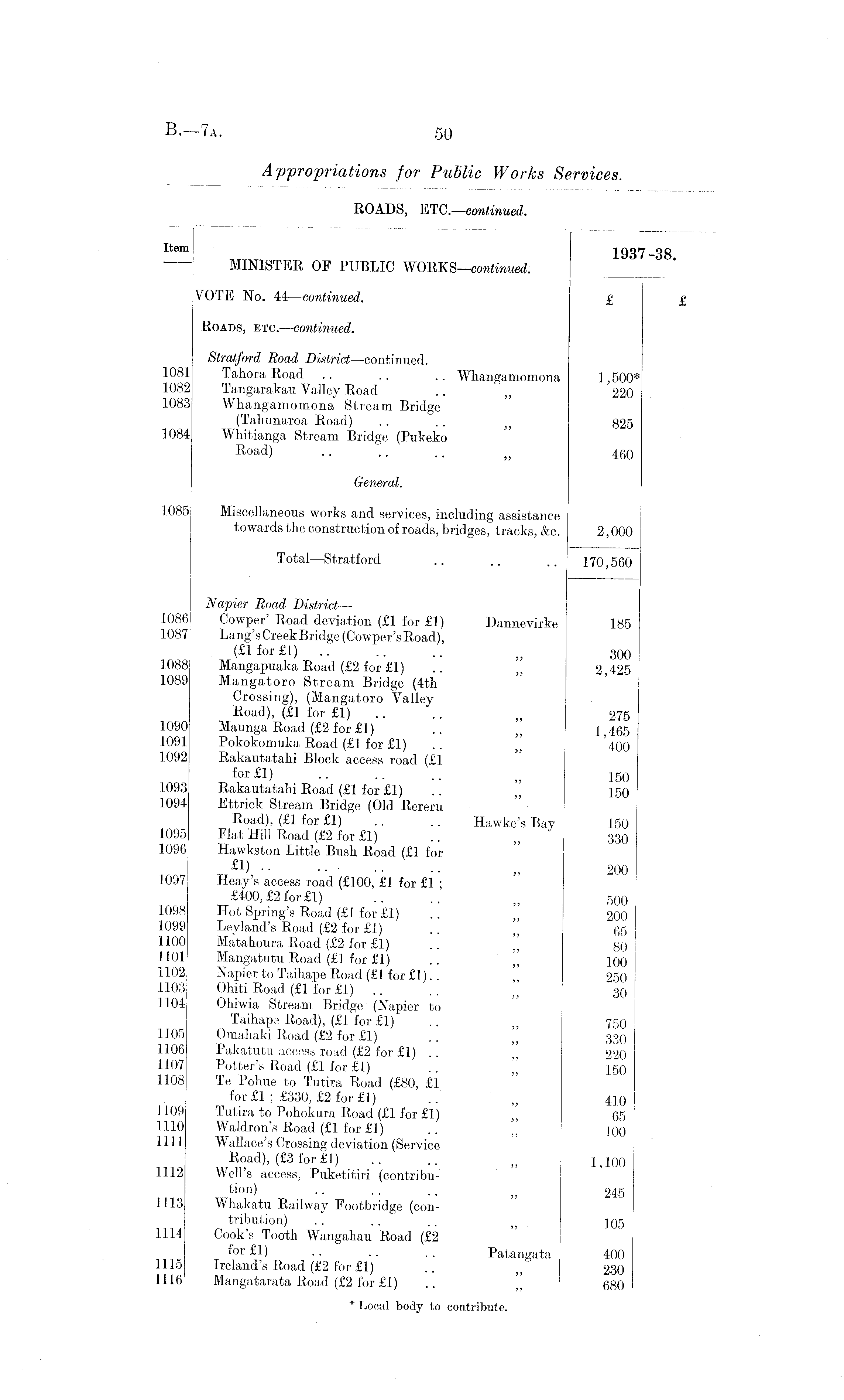 Item 1937-38 MINISTER OF PUBLIC WORES —continued. ' VOTE No. 44—continued. £ £ Roads, etc. —continued. Stratford Road District—continued. 1081 Tahora Road .. . . .. Whangamomona 1,500* 1082 Tangarakau Valley Road .. ,, 220 1083 Whangamomona Stream Bridge (Tahunaroa Road) .. .. 825 1084 Whitianga Stream Bridge (Pukeko Road ) „ 460 General. 1085 Miscellaneous works, and services, including assistance towards the construction of roads, bridges, tracks, &c. 2,000 Total—Stratford .. .. .. 170 560 Napier Road District— 1086 Cowper Road deviation (£1 for £1) Dannevirke 185 1087 Lang's Creek Bridge (Cowper's Road), (£1 for £1) .. .. .. „ 300 1088 Mangapuaka Road (£2 for £1) .. „ 2,425 1089 Mangatoro Stream Bridge (4th Crossing), (Mangatoro Valley Road), (£1 for £1) .. .. j; 275 1090 Maunga Road (£2 for £1) .. " 1,465 1091 Pokokomuka Road (£1 for £1) .. " t '4OO 1092 Rakautatahi Block access road (£1 for £1.) .. .. .. ,, 150 1093 Rakautatahi Road (£1 for £1) .. „ 150 1094 Ettrick Stream Bridge (Old Rereru Road), (£1 for £1) .. .. Hawke's Bay 150 1095 Plat Hill Road (£2 for £1) .. 330 1096 Hawkston Little Bush Road (£1 for £1 ) • • • • ■ • ■ • „ 200 1097 Heay's access road (£100, £1 for £1 ; £400, £2 for £1) .. .. „ 50 0 1098 Hot Spring's Road (£1 for £1) .. " 200 1099 Leyland's Road (£2 for £1) . . 65 1100 Matahoura Road (£2 for £1) .. " 80 1101 Mangatutu Road (£1 for £1) . . " 100 1102 Napier to Taihape Road (£1 for £1).. 250 1103 Ohiti Road (£1 for £1) . . " 3q 1104 Ohiwia Stream Bridge (Napier to Taihape Road), (£1 for £1) .. ;j 750 1105 Omahaki Road (£2 for £1) .. 33O 1106 Pakatutu access road (£2 for £1) .. ;) 220 1107 Potter's Road (£1 for £1) .. " 150 1108 Te Pohue to Tutira Road (£80, £1 for £1 ; £330, £2 for £1) .. 5) 4] q 1109 Tutira to Pohokura Road (£1 for £1) „ 65 1110 Waldron's Road (£1 for £1) .. " 100 1111 Wallace's Crossing deviation (Service Road), (£3 for £1) .. .. 1 100 1112 Well's access, Puketitiri (contribution ) . • • • • • • „ 245 1113 Whakatu Railway Footbridge (contribution)) .. .. .. 105 1114 Cook's Tooth Wangahau Road (£2 f° r £1) • ■ • • .. Patangat.a 400 1115 Ireland's Road (£2 for £1) .. 230 1116 Mangatarata Road (£2 for £1) .. [[ 680 * Local body to contribute.