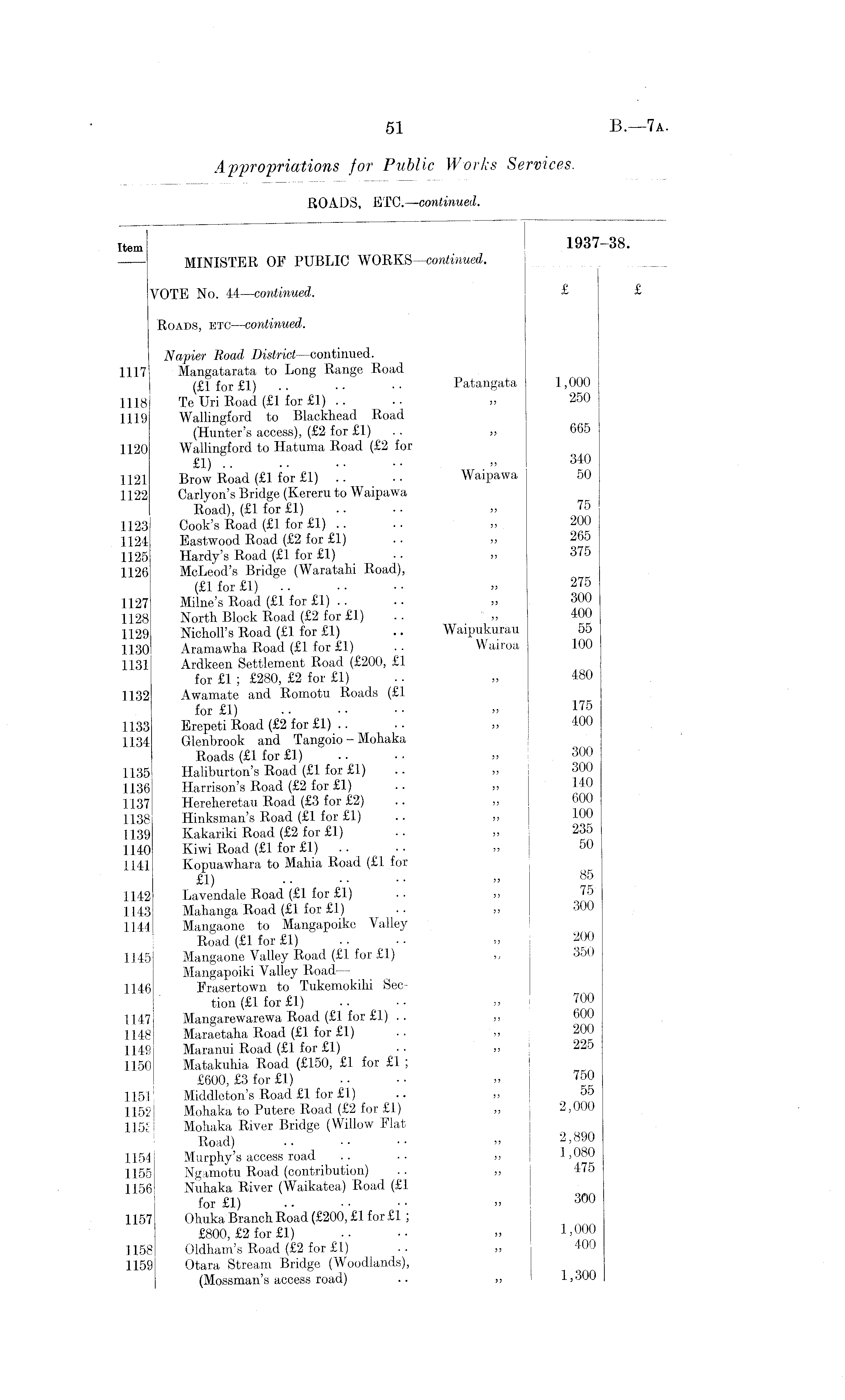 Item 1937-38. MINISTER OF PUBLIC WORKS—continued. VOTE No. 44 —continued. £ £ Roads, etc —continued. Napier Road District —continued. 1117 Mangatarata to Long Range Road (£1 for £1) .. •• Patangata 1,000 1118 Te Uri Road (£1 for £1) .. .. » 250 1119 Wallingford to Blackhead Road (Hunter's access), (£2 for £1) .. ,> 665 1120 Wallingford to Hatuma Road (£2 for £1) .. .. •• » 340 1121 Brow Road (£1 for £1) .. ■ • Waipawa 50 1122 Carlyon's Bridge (Kereru to Waipawa Road), (£1 for £1) .... „ 75 1123 Cook's Road (£1 for £1) .. •• „ 200 1124 Eastwood Road (£2 for £1) .. „ 265 1125 Hardy's Road (£1 for £1) • ■ » 375 1126 McLeod's Bridge (Waratahi Road), (£1 for £1) • ■ • • • • " 275 1127 Milne's Road (£1 for £1) .. .. >> 300 1128 North Block Road (£2 for £1) .. „ 400 1129 Nicholl's Road (£1 for £1) .. Waipukurau 55 1130 Aramawha Road (£1 for £1) • • Wairoa 100 1131 Ardkeen Settlement Road (£200, £1 for £1 ; £280, £2 for £1) .. „ 480 1132 Awamate and Romotu Roads (£1 for £1) ■• • • •• " 175 1133 Erepeti Road (£2 for £1) .. .. „ 400 1134 Glenbrook and Tangoio - Mohaka Roads (£1 for £1) .. • • „ 300 1135 Haliburton's Road (£1 for £1) .. ,, 300 1136 Harrison's Road (£2 for £1) .. „ 140 1137 Hereheretau Road (£3 for £2) .. „ 600 1138 Hinksman's Road (£1 for £1) .. 100 1139 Kakariki Road (£2 for £1) .. „ 235 1140 Kiwi Road (£1 for £1) .. •• » 1141 Kopuawhara to Mahia Road (£1 for £1) ■» 85 1142 Lavendale Road (£1 for £1) .. >, 75 1143 Mahanga Road (£1 for £1) .. ,, 300 1144 Mangaone to Mangapoike Valley Road (£1 for £1) • • „ 200 1145 Mangaone Valley Road (£1 for £1) „ 350 Mangapoiki Valley Road — 1146 Frasertown to Tukemokilii Section (£1 for £1) .. >» 700 1147 Mangarewarewa Road (£1 for £1) .. „ 1148 Maraetaha Road (£1 for £1) .. „ 200 1149 Maranui Road (£1 for £1) .. ,» 225 1150 Matakuhia Road (£150, £1 for £1 ; £600, £3 for £1) . • • • » 750 11511 Middleton's Road £1 for £1) .. „ 55 1152 Mohaka to Putere Road (£2 for £1) „ 2,000 115f Mohaka River Bridge (Willow Flat Road) .. •• » 2,890 1154 Murphy's access road .. •• >> 1,080 1155 Ngamotu Road (contribution) .. „ 475 11.56 Nuhaka River (Waikatea) Road (£1 for £1) .. • • • • » 300 1157 Ohuka Branch Road (£200, £1 for £1 ; £800, £2 for £1) .. •• » 000 1158 Oldham's Road (£2 for £1) • ■ 400 1159 Otara Stream Bridge (Woodlands), (Mossman's access road) .. >> 1 > 300
