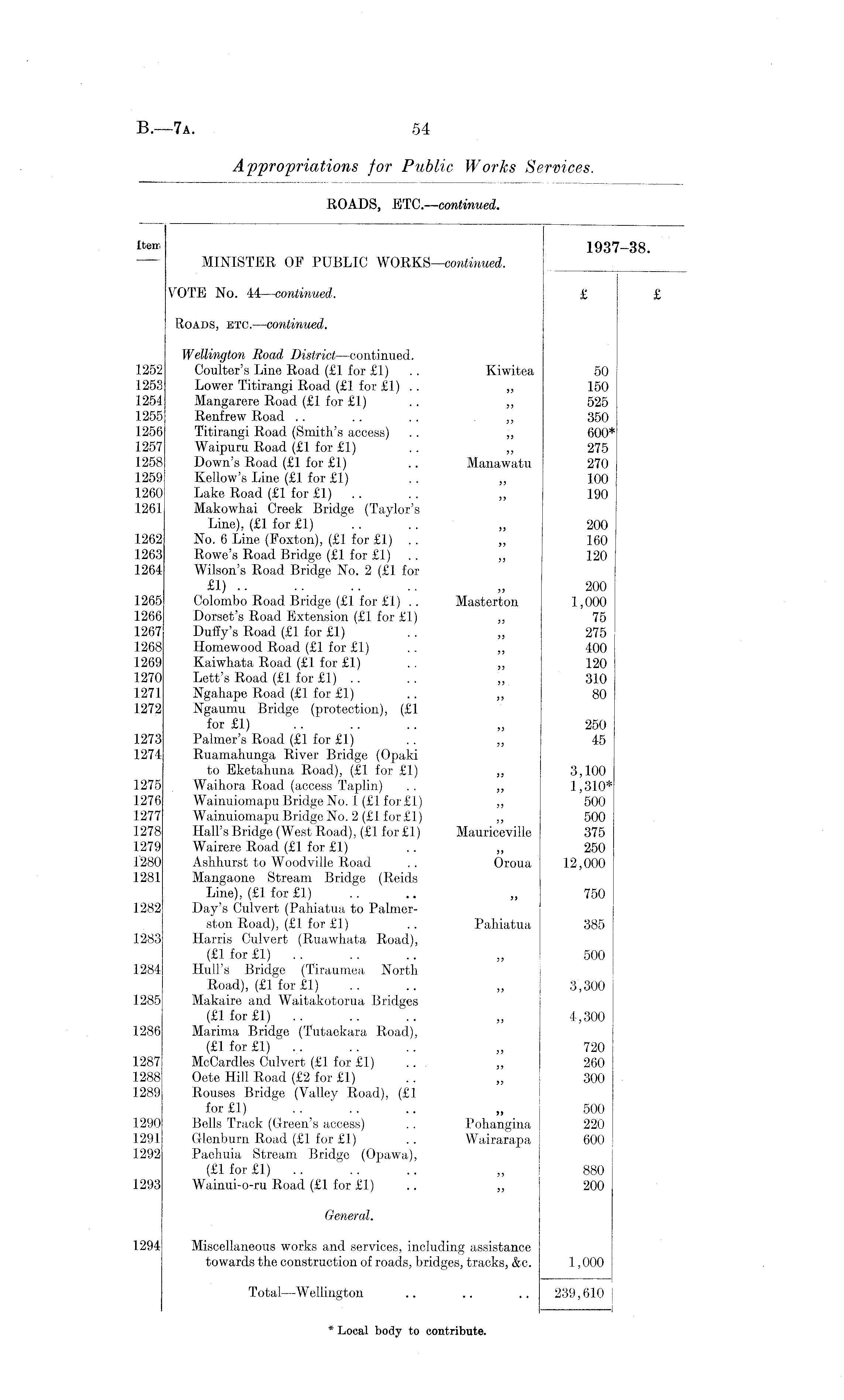 Iteir 1937-38. MINISTER OF PUBLIC WORKS—continued. VOTE No. 44 —continued. £ £ Roads, etc. —continued. Wellington Road District—continued. 1252 Coulter's Line Road (£1 for £1) .. Kiwitea 50 1253 Lower Titirangi Road (£1 for £1) .. „ 150 1254 Mangarere Road (£1 for £1) .. ,, 525 1255 Renfrew Road .. .. . . ,, 350 1256 Titirangi Road (Smith's access) .. „ 600* 1257 Waipuru Road (£1 for £1) .. ,, 275 1258 Down's Road (£1 for £1) .. Manawatu 270 1259 Kellow's Line (£1 for £1) .. ,, 100 1260 Lake Road (£1 for £1) .. .. ,, 190 1261 Makowhai Creek Bridge (Taylor's Line), (£1 for £1) . . . . „ 200 1262 No. 6 Line (Foxton), (£1 for £1) . . ,, 160 1263 Rowe's Road Bridge (£1 for £1) .. ,, 120 1264 Wilson's Road Bridge No. 2 (£1 for £1) .. .. .. .. „ 200 1265 Colombo Road Bridge (£1 for £1) .. Masterton 1,000 1266 Dorset's Road Extension (£1 for £1) ,, 75 1267 Duffy's Road (£1 for £1) .. ,, 275 1268 Homewood Road (£1 for £1) .. „ 400 1269 Kaiwliata Road (£1 for £1) . . ,, 120 1270 Lett's Road (£1 for £1) .. .. ,, 310 1271 Ngahape Road (£1 for £1) .. ,, 80 1272 Ngaumu Bridge (protection), (£1 for £1) .. .. .. „ 250 1273 Palmer's Road (£1 for £1) .. ,, 45 1274 Ruamahunga River Bridge (Opaki to Eketaliuna Road), (£1 for £1) „ 3,100 1275 Waihora Road (access Taplin) .. ,, 1,310* 1276 Wainuiomapu Bridge No. 1 (£1 for £1) ,, 500 1277 Wainuiomapu Bridge No. 2 (£1 for £1) ,, 500 1278 Hall's Bridge (West Road), (£1 for £1) Mauriceville 375 1279 Wairere Road (£1 for £1) .. ,, 250 1280 Ashhurst to Woodville Road .. Oroua 12,000 1281 Mangaone Stream Bridge (Reids Line), (£1 for £1) .. .. „ 750 1282 Day's Culvert (Pahiatua to Palmerston Road), (£1 for £1) .. Pahiatua 385 1283 Harris Culvert (Ruawhata Road), (£1 for £1) .. .. .. „ 500 1284 Hull's Bridge (Tiraumea North Road), (£1 for £1) .. .. ,, 3,300 1285 Makaire and Waitakotorua Bridges (£1 for £1) „ 4,300 1286 Marima Bridge (Tutaekara Road), (£1 for £1) .. .. .. ,, 720 1287 McCardles Culvert (£1 for £1) .. ,, 260 1288 Oete Hill Road (£2 for £1) .. „ 300 1289 Rouses Bridge (Valley Road), (£1 for £1) .. .. .. „ 500 1290 Bells Track (Green's access) .. Pohangina 220 1291 Glenburn Road (£1 for £1) .. Wairarapa 600 1292 Paekuia Stream Bridge (Opawa), (£1 for £1) .. .. .. „ 880 1293 Wainui-o-ru Road (£1 for £1) .. ,, 200 General. 1294 Miscellaneous works and services, including assistance towards the construction of roads, bridges, tracks, &c. 1,000 Total—Wellington .. .. .. 239,610 * Local body to contribute.